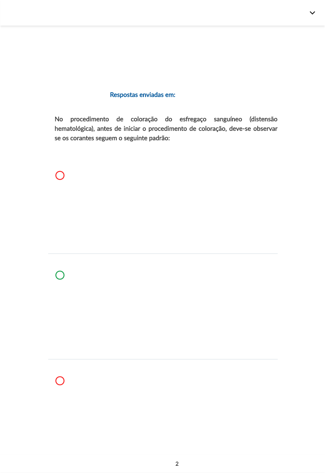 Pós Teste Respostas enviadas em: 09/08/2024 19:09 2. No procedimento de coloração do esfregaço sanguíneo (distensão hematológica), antes de iniciar o procedimento de coloração, deve-se observar se os corantes seguem o seguinte padrão: Resposta incorreta. A. panó�co 1: solução vermelho claro, livre de par�culas visíveis; Panó�co 2: solução azul escuro, livre de par�culas visíveis.; Panó�co 3: solução verde claro, livre de par�culas visíveis; Corante vermelho não é o panó�co 1; corante azul não é o panó�co 2 e corante verde não é o panó�co 3. Você acertou! B. panó�co 1: solução verde claro, livre de par�culas visíveis; Panó�co 2: solução vermelho claro, livre de par�culas visíveis; Panó�co 3: solução azul escuro, livre de par�culas visíveis; Este é a caracterís�ca correta dos corantes 1, 2 e 3. Resposta incorreta. C. panó�co 1: solução verde claro, livre de par�culas visíveis; Panó�co 2: solução azul escuro, livre de par�culas visíveis; Panó�co 3: solução vermelho claro, livre de par�culas visíveis. O panó�co 1 é verde claro. Mas o corante azul não é o panó�co 2 e o corante vermelho não é o panó�co 3. 2 de 5 perguntas Anterior U2