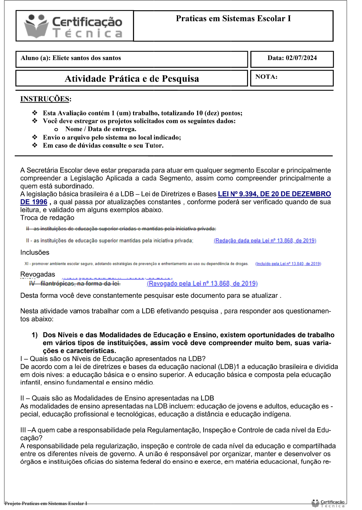 Projeto Prático em Meio Ambiente I - MEA distributiva e supletiva. Os estados são responsáveis por organizar manter e desenvolver os órgãos e instituições oficias dos seus sistemas de ensino, os municípios são responsáveis por atua prioritaria- mente no ensino fundamental e na educação infantil. 2) A categoria profissional principal ligada a Educação é o Professor, assim você deve co- nhecer bem suas características profissionais I – Qual a diferença entre Licenciatura e Bacharelado A diferença entre licenciatura e bacharelado é que a licenciatura é uma formação voltada para a atua- ção como professor na educação básica, enquanto o Bacharelado é uma formação mais ampla e geral, nã - o habilitado diretamente para a docência. II – Qual a formação mínima exigida para que um profissional atue nos diversos níveis da Educação A formação mínima exigida para que um profissional atue nos diversos níveis da educação varia de acordo com o pais e legislação vigente. No Brasil, para atuar na Educação Básica, e necessário a for - mação em nível superior como licenciatura sendo o curso de pedagogia uma das opções mais comuns para atuar na educação infantil e nos anos inicias do ensino fundamental. 3) Toda classe profissional possui uma base salarial e uma regra para seu aumento anual , no caso dos docentes: I – Qual a Lei que determina esta base ? A lei que determina a base dos docentes é a Lei do Piso Salarial do Magistério (Lei n°11.738/2008) II – Como se aplica? A aplicação dessa lei varia conforme as negociações dos sindicatos, legislação local e cordos coleti- vos.
