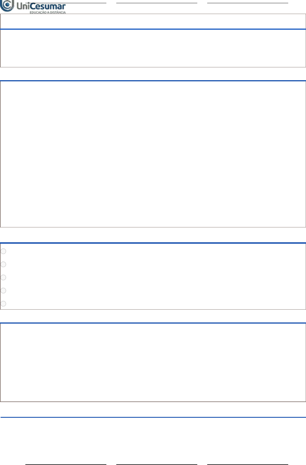 ATIVIDADE 3 - ESTUDO CONTEMPORÂNEO E TRANSVERSAL: GESTÃO DE INDICADORES - 53_2024 Período:05/08/2024 08:00 a 15/09/2024 23:59 (Horário de Brasília) Status:ABERTO Nota máxima:1,00 Gabarito:Gabarito será liberado no dia 21/10/2024 00:00 (Horário de Brasília) Nota obtida: 1ª QUESTÃO Indicadores são ferramentas fundamentais em diversos contextos para quantificar, qualificar e mensurar aspectos específicos de um processo, projeto, atividade ou situação. Eles desempenham um papel crucial na avaliação de desempenho, no acompanhamento de metas e objetivos, e na tomada de decisões informadas. Fonte: adaptado de: CAMILIS, P. K. et al. Gestão do desempenho organizacional. Porto Alegre: SAGAH, 2018. Com base nessas informações e considerando algum dos principais tipos de indicadores que as empresas utilizam, analise as afirmativas a seguir: I. Margem de lucro. II. Taxa de conversão. III. Satisfação dos clientes. IV. Capacidade de produção. É correto o que se afirma em: ALTERNATIVAS IV, apenas. I e II, apenas. III e IV, apenas. I, II e III, apenas. I, II, III e IV. 2ª QUESTÃO Considere a seguinte situação hipotética: Ruan é responsável por fazer o controle de qualidade em uma indústria. Desse modo, sua função é mensurar a quantidade de falhas registradas durante seu turno de trabalho, por meio de um índice de avarias. Com base no exposto e considerando o tipo de indicador que é utilizado na situação apresentada, assinale a alternativa correta: ALTERNATIVAS 06/08/2024, 15:18 Unicesumar - Ensino a Distância about:blank 1/7 43.9.8486.9985 43.9.8486.9985 43.9.8486.9985 43.9.8486.9985 43.9.8486.9985 43.9.8486.9985 Indicador de métodos. Indicador estratégico. Indicador de qualidade. Indicador de capacidade. Indicador de produtividade. 3ª QUESTÃO Leia a seguir sobre um tipo de indicador: “ . . . que podem estar relacionados à produtividade hora/colaborador, hora/máquina. Ou seja, estão ligados ao uso dos recursos da empresa com relação às entregas” (Endeavor, c2023, on-line). Vinculam-se à eficiência na qual se utilizam os recursos da empresa em questão frente às entregas realizadas. Fonte: ENDEAVOR BRASIL. 5 indicadores de desempenho para medir seu sucesso. Endeavor, [s. l.], c2023. Disponível em: https://endeavor.org.br/estrategia-e-gestao/indicadores-de-desempenho/. Acesso em: 6 mar. 2024. Com base nas informações apresentadas e considerando o tipo de indicador mencionado, assinale a alternativa correta: ALTERNATIVAS Indicador de métodos. Indicador estratégico. Indicador de qualidade. Indicador de capacidade. Indicador de produtividade. 4ª QUESTÃO 06/08/2024, 15:18 Unicesumar - Ensino a Distância about:blank 2/7 43.9.8486.9985 43.9.8486.9985 43.9.8486.9985 43.9.8486.9985 43.9.8486.9985 43.9.8486.9985 Leia a seguir sobre um tipo de indicador: " . . . eles andam juntos com os indicadores de produtividade, pois ajudam a entender qualquer desvio ou não conformidade que ocorreu durante o processo produtivo. Um exemplo . . . pode ser considerado o nível de avarias, onde a quantidade de avarias ocorridas durante um período é comparada com o nível de aceitação estabelecido" (Endeavor, c2023, on-line). Fonte: ENDEAVOR BRASIL. 5 indicadores de desempenho para medir seu sucesso. Endeavor, [s. l.], c2023. Disponível em: https://endeavor.org.br/estrategia-e-gestao/indicadores-de-desempenho. Acesso em: 6 mar. 2024. Com base nas informações apresentadas e considerando o tipo de indicador mencionado, assinale a alternativa correta: ALTERNATIVAS Indicador de métodos. Indicador estratégico. Indicador de qualidade. Indicador de capacidade. Indicador de produtividade. 5ª QUESTÃO Indicadores são medidas ou métricas utilizadas para quantificar ou qualificar aspectos específicos de um processo, projeto ou atividade. Eles são fundamentais para avaliar o desempenho, o progresso e a eficácia de diversas iniciativas em diferentes contextos. Fonte: adaptado de: CAMILIS, P. K. et al. Gestão do desempenho organizacional. Porto Alegre: SAGAH, 2018. Com base nas informações apresentadas, avalie as asserções a seguir e a relação proposta entre elas: I. A quantidade de defeitos encontrados em determinado produto é um exemplo de indicador de resultados. PORQUE II. Os Indicadores de resultados focam no passado, fazendo com que sejam tomadas atitudes reativas. Assinale a alternativa correta: ALTERNATIVAS 06/08/2024, 15:18 Unicesumar - Ensino a Distância about:blank 3/7 43.9.8486.9985 43.9.8486.9985 43.9.8486.9985 43.9.8486.9985 43.9.8486.9985 43.9.8486.9985 As asserções I e II são proposições verdadeiras, e a II é uma justificativa correta da I. As asserções I e II são proposições verdadeiras, mas a II não é uma justificativa correta da I. A asserção I é uma proposição verdadeira, e a II é uma proposição falsa. A asserção I é uma proposição falsa, e a II é uma proposição verdadeira. As asserções I e II são proposições falsas. 6ª QUESTÃO Indicadores são medidas ou métricas que fornecem informações quantitativas ou qualitativas sobre o desempenho, progresso ou qualidade de um processo, projeto ou atividade. Eles são essenciais para avaliar o sucesso de uma iniciativa e orientar a tomada de decisões informadas. Fonte: adaptado de: CAMILIS, P. K. et al. Gestão do desempenho organizacional. Porto Alegre: SAGAH, 2018. Com base nas informações apresentadas, avalie as asserções a seguir e a relação proposta entre elas: I. A quantidade de chamados abertos pelo cliente, considerando uma prestação de serviços, é um exemplo de um indicador direcionador. PORQUE II. Os indicadores direcionadores acompanham a causa antes do efeito, fazendo com que sejam tomadas atitudes proativas. Assinale a alternativa correta: ALTERNATIVAS As asserções I e II são proposições verdadeiras, e a II é uma justificativa correta da I. As asserções I e II são proposições verdadeiras, mas a II não é uma justificativa c