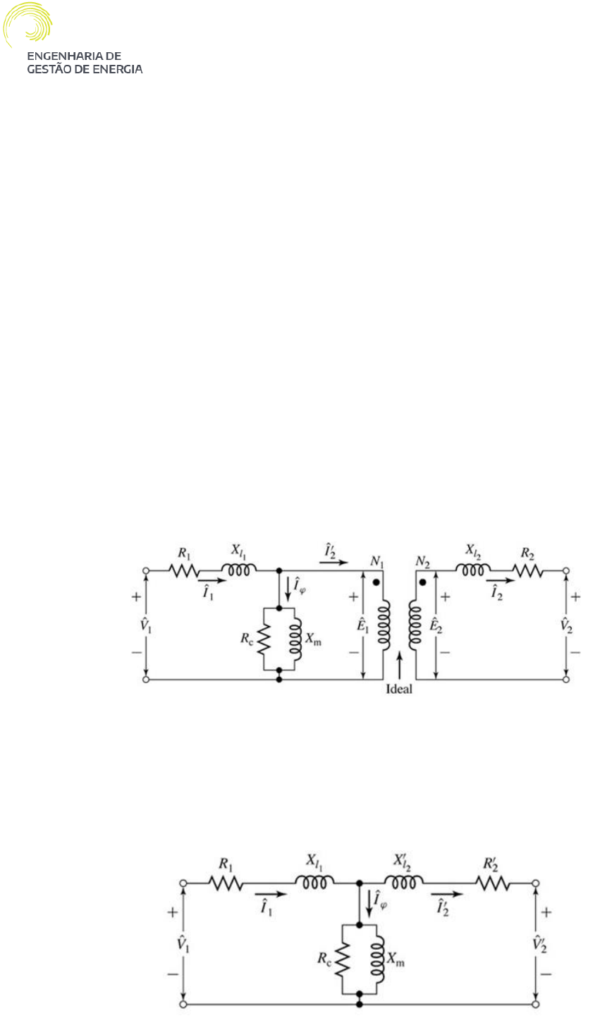 Universidade Federal do Rio Grande do Sul Campus Litoral Norte Departamento Interdisciplinar DIL01162 – Laboratório de Conversão de Energia e Máquinas Elétricas 2024/1 Laboratório 6 – Ensaios em transformadores Ensaio a vazio e em curto-circuito para a determinação dos parâmetros do circuito equivalente de transformadores monofásicos 1. Objetivo Realizar ensaios para a determinação dos parâmetros do circuito equivalente de transformadores monofásicos. Identificar relação entre grandezas na composição do circuito elétrico equivalente de transformadores reais. 2. Base teórica O comportamento de um transformador real, para operação com frequências da ordem de 60 Hz, pode ser modelado por meio de um circuito elétrico equivalente, conforme mostrado na Figura 1. Cada elemento deste modelo representa um fenômeno físico que ocorre no transformador. Figura 1: Modelo equivalente de um transformador monofásico. O transformador mostrado na Figura acima é um transformador ideal com relação de transformação 1:a, onde “a” é a relação do número de espiras, isto é, a = N2/N1. Este transformador pode ser suprimido do modelo se as impedâncias forem refletidas do secundário para o primário, como mostrado na Figura 2, onde R2’ e Xl2’ representam a resistência R2 e a reatância Xl2 refletidas para o lado primário. Figura 2: Modelo equivalente do transformador monofásico com as impedâncias do secundário refletido ao primário. Universidade Federal do Rio Grande do Sul Campus Litoral Norte Departamento Interdisciplinar A partir do modelo mostrado nas figuras anteriores é possível determinar as características de desempenho de transformadores como rendimento, regulação de tensão, defasamento angular, dentre outros. Os elementos do modelo podem ser obtidos por meio de dois ensaios denominados ensaio a vazio e ensaio de curto circuito. 3. Equipamentos utilizados Os ensaios serão realizados utilizando os seguintes equipamentos e dispositivos ilustrados na Figura 3: • Multímetro digital • Alicate volt amperímetro • Wattímetro digital • Varivolt • Transformador monofásico 220V/127:12V 400VA • Cabos de conexão Multímetro digital Minipa ET-2082C Alicate volt amperímetro T-RMS VA-901 Wattímetro Digital Politerm POL-64 Varivolt 0-250V AC Transformador monofásico 220V/127:12V 400VA Figura 3: Equipamentos e dispositivos utilizados nos experimentos. Universidade Federal do Rio Grande do Sul Campus Litoral Norte Departamento Interdisciplinar 4. Experimento Os experimentos que serão realizados envolvem altas tensões e correntes. Deve-se ter muito cuidado na execução dos mesmos. Realizar o experimento sob supervisão e verificar atentamente as conexões antes da energização. 4.1 Ensaio a vazio O ensaio a vazio ou circuito aberto, consiste em aplicar a tensão nominal em um dos enrolamentos do transformador enquanto o outro enrolamento está aberto. Por conveniência, geralmente alimenta-se o enrolamento de baixa tensão independentemente se o transformador será utilizado como elevador ou rebaixador de tensão. As grandezas elétricas que devem ser medidas durante o ensaio a vazio são: tensão eficaz aplicada no primário (Vca), corrente eficaz no primário (Ica), e potência ativa dissipada (Pca), conforme mostra o diagrama esquemático da Figura 4. Figura 4: Diagrama esquemático do ensaio a vazio de transformador monofásico. Com base no modelo da figura acima, pode-se observar que a corrente no secundário é nula neste ensaio. Além disso, de forma geral tem-se que a impedância equivalente do ramo de excitação (Rc // Xm) é muito maior que a impedância série (R1 + X1) e que Rc >> R1 e Xm >> X1. Assim, no ensaio a vazio, as impedâncias série podem ser desprezadas e as do ramo de excitação podem ser determinadas. A resistência do ramo de excitação pode ser determinada por: ca ca c P V R 2 = Consequentemente, a impedância de magnetização Zϕ pode ser determinada por: ca ca I V Z = Universidade Federal do Rio Grande do Sul Campus Litoral Norte Departamento Interdisciplinar A reatância de magnetização Xm = ωLm pode ser finalmente estimada: 22 11 1 − = c m RZ X 4.1 Ensaio de curto-circuito O ensaio de curto-circuito consiste em aplicar a corrente nominal em um dos enrolamentos do transformador enquanto o outro enrolamento é curto-circuitado. Por conveniência, geralmente alimenta-se o enrolamento de alta tensão, independentemente se o transformador será utilizado como elevador ou rebaixador de tensão. As grandezas elétricas que devem ser medidas durante o ensaio de curto-circuito são: tensão eficaz aplicada no primário (Vcc), corrente eficaz no primário (Icc), e potência ativa dissipada (Pcc), conforme mostra o diagrama esquemático da Figura 5. Figura 5: Diagrama esquemático do ensaio de curto-circuito em transformador monofásico. Considerando o que já foi discutido com relação a ordem de grandeza das impedâncias do modelo, ou seja, que as impedâncias do ramo de excitação são de forma geral muito maiores que as impedâncias série, pode-se inferir que no ensaio de curto-circuito as impedância do ramo de excitação podem ser desprezadas e as impedâncias série podem ser determinadas. Portanto, com base na análise do circuito da Figura 2 e da Figura 5 é possível verificar que: 2 cc cc cceq I P RR == É importante observar que no ensaio de curto-circuito obtém-se a resistência equivalente (Req), que é igual à soma de R1 com R2 refletido para o lado primário. Como R1 e R2 representam as resistências ôhmicas dos enrolamentos primário e secundário, respectivamente, estes também podem ser medidos diretamente. Universidade Federal do Rio Grande do Sul Campus Litoral Norte Departamento Interdisciplinar Para obter R1 e R2 separadamente a partir do ensaio, de forma geral utiliza-se a aproximação R1 = R2’= 0,5Req. Consequentemente: cc cc cceq I V ZZ == E por fim: 22 cccccceq RZXX −== De 