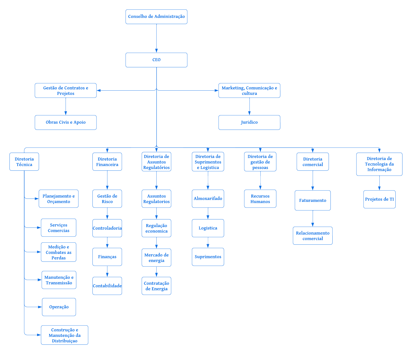 Conselho de Administração CEO Gestão de Contratos e Marketing, Comunicação e Projetos cultura Obras Civis e Apoio Juridico Diretoria de Diretoria de Diretoria de Diretoria Diretoria Diretoria Diretoria de Assuntos Técnica Financeira Suprimentos gestão de comercial Tecnologia da Regulatórios e Logistica pessoas Informação Planejamento e Gestão de Assuntos Almoxarifado Recursos Orçamento Risco Regulatorios Humanos Faturamento Projetos de TT Serviços Controladoria Regulação Comercias Logistica economica Relacionamento comercial Medição e Combates as Perdas Finanças Mercado de Suprimentos energia Manutenção e Transmissão Contabilidade Contratação de Energia Operação Construção e Manutenção da