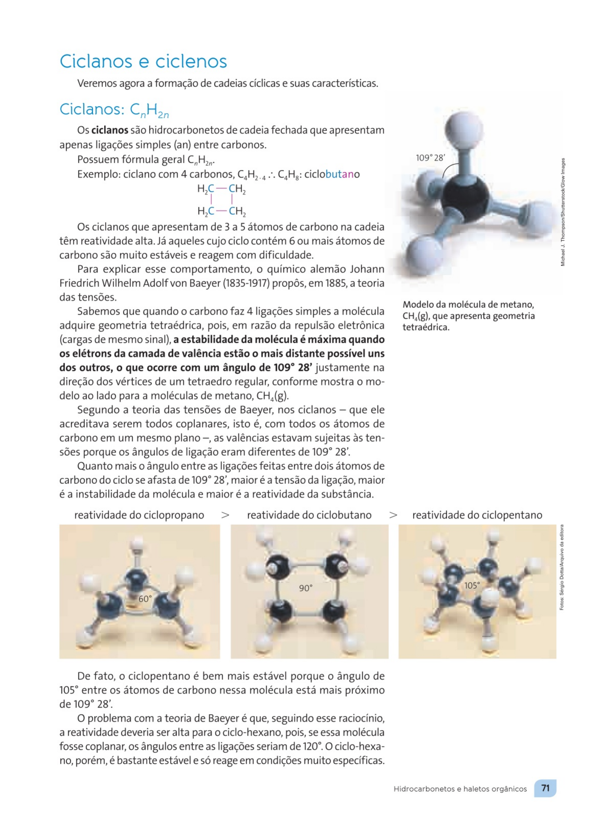 Ciclanos e ciclenos Veremos agora a formação de cadeias cíclicas e suas características. Cic lanos: CnH2n Os ciclanos são hidrocarbonetos de cadeia fechada que apresentam apenas ligações simples (an) entre carbonos. Possuem fórmula gera l CnH2n. Exemplo: ciclano com 4 carbonos, C4 H2 . 4 :. C4 H8 : ciclobutano H2C- CH2 1 1 H2C- CH2 Os ciclanos que apresentam de 3 a 5 átomos de carbono na cadeia têm reatividade alta. Já aqueles cujo ciclo contém 6 ou mais átomos de carbono são muito estáveis e reagem com dificuldade. Para expl icar esse comportamento, o químico alemão Johann Friedrich Wilhelm Adolf von Baeyer {1835-1917) propôs, em 1885, a teoria das tensões. Sabemos que quando o carbono faz 4 ligações simples a molécula adquire geometria tetraédrica, pois, em razão da repulsão eletrôn ica (cargas de mesmo sina l), a estabilidade da molécula é máxima quando os elétrons da camada de valência estão o mais distante possível uns dos outros, o que ocorre com um ângulo de 109º 28' justamente na direção dos vértices de um tetraedro regular, conforme mostra o mo delo ao lado para a moléculas de metano, CH4(g). Segundo a teoria das tensões de Baeyer, nos ciclanos - que ele acreditava serem todos coplanares, isto é, com todos os átomos de ca rbono em um mesmo plano-, as valências estavam sujeitas às ten sões porque os ângulos de ligação eram diferentes de 109º 28'. Quanto mais o ângulo entre as ligações feitas entre dois átomos de carbono do ciclo se afasta de 109º 28', maior é a tensão da ligação, maior é a instabilidade da molécula e maior é a reatividade da substância. 109º 28' Modelo da molécula de metano, CH4(g). que apresenta geomet ria t et raédrica. reatividade do ciclopropano > reatividade do ciclobutano > reatividade do ciclopentano - De fato, o ciclopentano é bem mais estável porque o ângulo de 105º entre os átomos de carbono nessa molécula está mais próximo de 109º 28'. O problema com a teoria de Baeyer é que, seguindo esse raciocínio, a reatividade deveria ser alta para o ciclo-hexano, pois, se essa molécu la fosse coplanar, os ângulos entre as ligações seriam de 120º. O ciclo-hexa no, porém, é bastante estável e só reage em cond ições muito específicas. Hidrocarbonetos e haletos orgânicos 71 Forma simétrica, denominada cadeira ou Z, com ângulos de 109º 28'. Forma mais estável. Forma assimétrica, denominada barco ou C, com ângulos de 109º 28'. Forma menos estável. r Como os modelos cadeira e barco l não são igualmente estáveis, espera-se que a forma de cadeira sempre predomine em uma mistura. Em 1926, a teoria de 1 =~chse e Mohr foi confirmada L xperimentalmente. Modelo do ciclobuteno, C4H6_. 72 Capítulo 3 Essa contradição ficou sem explicação durante cinco anos, até que, em 1890, o químico alemão Hermann Sachse (1862-1893) propôs a se guinte hipótese: Os átomos de carbono no ciclo-hexano (e nos ciclanos com mais de 6 carbonos na cadeia) não estão todos em um mesmo plano, conforme dizia Baeyer, mas em planos diferentes, de forma que a molécula adquire uma configuração espacial capaz de anular as tensões entre as ligações. De acordo com essa teoria, é possível construir dois modelos, o modelo cadeira ou Z e o modelo barco ou C para o ciclo-hexano, am bos conservando os ângulos de 109º 28' entre as ligações, conforme . as imagens. A molécula do ciclo-hexano em forma de cadeira ou de Zé mais es tável porque os átomos de hidrogênio ligados aos carbonos ficam mais distantes uns dos outros. A molécula em forma de barco ou de C permi te maior proximidade entre os átomos e, por isso, é mais instável. A hipótese de Sachse não foi aceita inicia lmente porque os cientis tas só conheciam uma forma do ciclo-hexano. Somente em 1918 o químico alemão Ernst Mohr conseguiu provar que era possível a conversão de uma forma na outra, com apenas uma ligei ra distorção dos ângulos de valência, e que tal operação exigia uma quantidade pequena de energia, podendo ocorrer até mesmo à tem peratura ambiente. O ciclopentano é um gás que possui propriedades anestésicas. É muito usado em cirurgias, para adormecer o paciente. O ciclo-hexano é usado como combustível e na produção de ácido adípico, COOH(CH2)4COOH; matéria-prima para a fabricação do nái lon. Ciclenos: CnH2n _ 2 Os ciclenos são hidrocarbonetos de cadeia fechada que possuem uma ligação dupla (en) entre carbonos e fórmu la geral CnHin - i· Exemplo: cicleno com 4 carbonos, C4 H2 . 4 _ 2 :. C4H6 : ciclobuteno H 1 H H- c - c / 1 11 H-C - C...,___ 1 H H Os ciclenos de 3 a 5 carbonos são compostos instáveis em razão da elevada tensão no ângulo de ligação entre os átomos de carbono. No ciclopropeno, por exemplo, as ligações entre os átomos de carbo no ocorrem em um ângulo de 60º. Sabemos, porém, que os átomos de carbono que estabelecem a ligação dupla o fazem em um ângulo de ligação ideal de 120º. A diferença de 60º entre o real e o ideal explica a grande instabili dade da molécula, que só existe como produto intermediário em algu mas reações químicas. Já os ciclenos com 6 ou mais átomos de carbono não possuem estrutura plana, mas espacia l (como os ciclanos), de tal forma que o ângulo entre as ligações dos carbonos se aproxima do ideal, dando estabilidade à molécula. 72-2 73-2