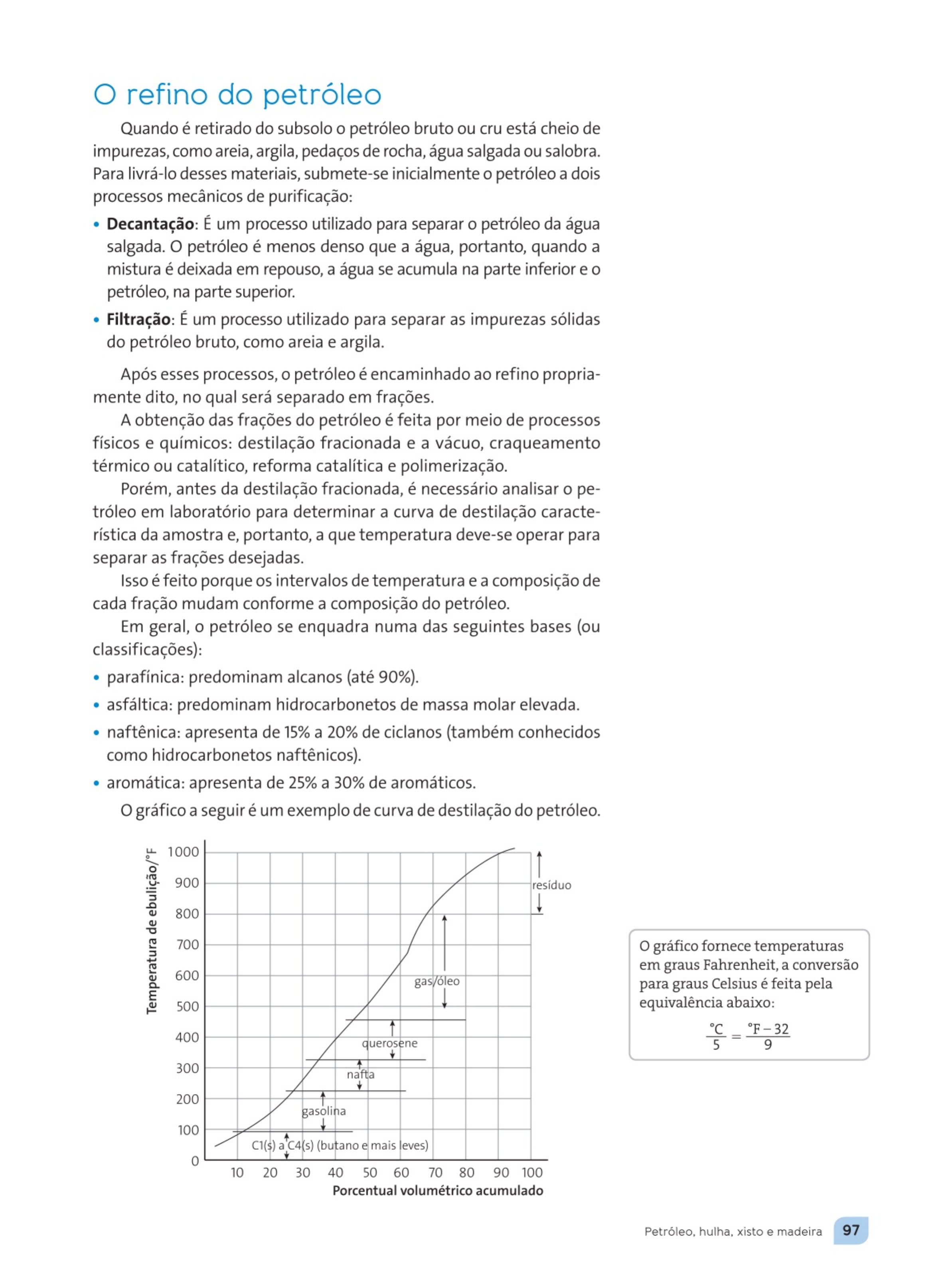 O refino do petróleo Quando é retirado do subsolo o petróleo bruto ou cru está cheio de impurezas, como areia, argila, pedaços de rocha, água salgada ou salobra. Para livrá-lo desses materiais, submete-se inicialmente o petróleo a dois processos mecânicos de purificação: • Decantação: É um processo utilizado para separar o petróleo da água salgada. O petróleo é menos denso que a água, portanto, quando a mistura é deixada em repouso, a água se acumula na parte inferior e o pet róleo, na parte superior. • Filtração: É um processo util izado para separar as impurezas sól idas do petróleo bruto, como areia e argila . Após esses processos, o petróleo é encaminhado ao refino propria mente dito, no qual será separado em frações. A obtenção das frações do petróleo é feita por meio de processos físicos e químicos: desti lação fracionada e a vácuo, craqueamento térmico ou catalítico, reforma catalítica e polimerização. Porém, antes da destilação fracionada, é necessário analisar o pe tróleo em laboratório para determinar a curva de destilação caracte rística da amostra e, portanto, a que temperatura deve-se operar para separar as frações desejadas. Isso é feito porque os intervalos de temperatu ra e a composição de cada fração mudam conforme a composição do petróleo. Em geral, o petróleo se enquadra numa das seguintes bases (ou classificações): • parafínica: predominam alcanos (até 90%). • asfáltica: predominam hidrocarbonetos de massa molar elevada. • naftênica: apresenta de 15% a 20% de ciclanos (também conhecidos como hidrocarbonetos naftênicos). • aromática: apresenta de 25% a 30% de aromáticos. O gráfico a segu ir é um exemplo de curva de destilação do petróleo. u.. 1000 o ----o "" 900 u• ::::, ..o 800 <li <li "O "' ~ 700 ::::, +-' "' ~ 600 <li Q. E ~ 500 400 300 200 100 o V i / "duo res1 i / / / / gas 01eo l / / t / ( ueros 6ne + / • / nat a / + , • / ~asbli a / l / Cl( + s) (bu mais eves) ) a+C4 ano E 10 20 30 40 50 60 70 80 90 100 Porcentual volumétrico acumulado r o gráfico fornece temperatura~ em graus Fahrenheit, a conversão para graus Celsius é feita pela equivalência abaixo: L ºC ºF - 32 s = 9 Petróleo. hulha. xisto e madeira 97 Destilação fracionada do petróleo Trata-se da separação dos componentes do petróleo com base na diferença de faixa de ponto de ebu lição das diferentes frações. Feita a curva de destilação, é possível iniciar a desti lação fracionada, que é feita em uma coluna de aço cheia de "obstáculos" em seu interior, conforme mostra a ilustracão abaixo . • O petróleo é preaquecido e introduzido próximo à base dessa colu- na. As substâncias de menor ponto de ebu lição conseguem atravessar esses obstácu los e chegar ao topo dela. Nesta etapa, são recolhidos, principalmente, gás, gasolina, nafta e querosene. Já as frações mais pesadas não conseguem chegar ao topo da coluna, acumulando-se em diversos níveis dela. As frações que não foram separadas na primeira destilação são le vadas para outra coluna e submetidas a uma pressão inferior à atmos férica (destilação a vácuo). Isso possibilita que as frações mais pesadas entrem em ebulição em temperaturas mais baixas, evitando que molé culas de cadeia longa se quebrem por causa do aquecimento. Nesta etapa são recolhidos produtos como a graxa, parafinas, óleos lubrificantes e betume (uti lizado no asfa ltamento e na produção de impermeabi lizantes). t orre de f racionamento O petróleo passa por um forno onde é aquecido, t ransformando-se em vapor, que ent ão é enviado para a torre de fracionamento (ou torre de pratos). Ao lado de cada prato há um escape para que as frações que não foram recolhidas possam descer para o prato inferior; caso haja alguma substância com ponto de ebulição superior ao do prato em que se encontra, ela sofrerá destilação novamente e tornará a subir para ser recolhida. - = - - = - fracâo , gasosa gasolina pet róleo \ saída de gases da combustão fornalha combustível para aquecimento - .==: ___ _____ _ preaquecedor 98 Capítulo 4 l - - querosene - óleo diesel 1 1 ' t óleo lubrificante resíduos torre de pratos 98-2 99-2