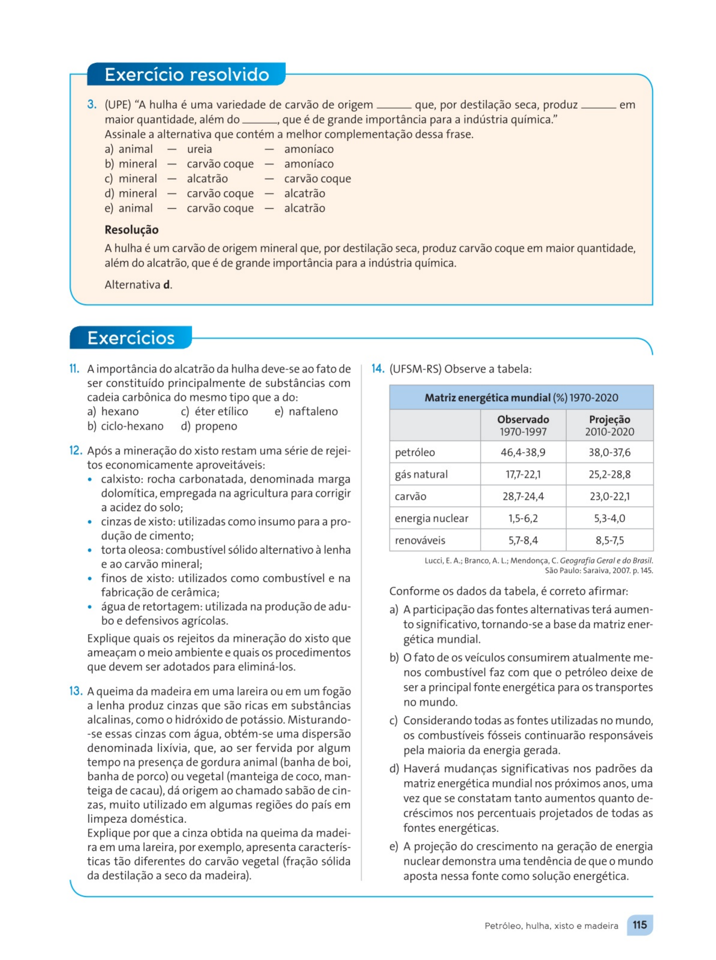3. {UPE) "A hulha é uma variedade de carvão de origem ___ que, por destilação seca, produz ___ em maior quant idade, além do ___ , que é de grande importância para a indústria química." Assinale a alternativa que contém a melhor complementação dessa f rase. a) animal urera amoníaco b) mineral carvão coque amoníaco c) mineral alcatrão carvão coque d) mineral carvão coque alcatrão e) animal carvão coque alcatrão Resolucão ' A hulha é um carvão de origem mineral que, por destilação seca, produz carvão coque em maior quantidade, além do alcatrão, que é de grande im portância para a indústria química. Alternativa d. 11. A importância do alcatrão da hu lha deve-se ao fato de ser constituído principalmente de substâncias com cadeia carbônica do mesmo t ipo que a do: a) hexano c) éter etílico e) naf ta leno b) ciclo-hexano d) propeno 12. Após a mineração do xisto restam uma série de rej ei tas economicamente aproveitáveis: • ca lx isto: rocha carbonat ada, denominada marga dolomítica, empregada na agricultu ra para corrigir a acidez do solo; • cinzas de xisto: uti lizadas como insumo para a pro dução de cimento; • torta oleosa: combust ível sólido alternativo à lenha e ao carvão m ineral; • finos de xisto: utilizados como combustível e na fabricacão de cerâmica; • • água de retortagem: utilizada na produção de adu- bo e def ensivos agrícolas. Explique quais os rejeitas da mineração do xisto que ameaçam o meio ambiente e quais os proced imentos que devem ser adotados para eliminá-los. 13. A queima da madeira em uma lareira ou em um fogão a lenha produz cinzas que são ricas em substâncias alcalinas, como o hidróxido de potássio. Misturando -se essas cinzas com água, obtém-se uma dispersão denominada lixívia, que, ao ser fervida por algum tempo na presença de gordura animal (banha de boi, banha de porco) ou vegetal (manteiga de coco, man t eiga de cacau), dá origem ao chamado sabão de cin zas, muito utilizado em algumas regiões do país em limpeza doméstica. Explique por que a cinza obtida na queima da madei ra em uma lareira, por exemplo, apresenta ca racterís t icas tão diferent es do carvão vegetal (f ração sólida da desti lação a seco da madeira). \ 14. (U FSM-RS) Observe a tabela: Matriz energética mundial (%) 1970-2020 Observado Projeção 1970-1997 2010-2020 pet róleo 46,4-38,9 38,0-37,6 gás natura l 17,7-22,1 25,2-28,8 - 28,7-24,4 23,0-22,1 ca rvao energia nuclear 1,5-6,2 5,3-4,0 renováveis 5,7-8,4 8,5-7,5 Lucci. E. A.; Branco, A. L.: Mendonça. C. Geografia Cerol e do Brasil. São Paulo: Saraiva, 2007. p. 145. Conforme os dados da tabela, é correto afirma r: a) A part icipação das fontes alternativas terá aumen to significativo, tornando-se a base da matriz ener gét ica mundia l. b) O fato de os veículos consumirem atualmente me nos combustível f az com que o petróleo deixe de ser a principa l fonte energét ica para os t ransportes no mundo. c) Considerando todas as fontes utilizadas no mundo, os combustíveis fósseis continua rão responsáveis pela maioria da energia gerada. d) Haverá mudanças sign ificativas nos pad rões da mat riz energética mundial nos próximos anos, uma vez que se constatam tanto aumentos quanto de créscimos nos percentuais projetados de t odas as fontes energét icas. e) A proj eção do crescimento na geração de energia nuclear demonstra uma tendência de que o mundo apost a nessa fonte como solução energética. Petróleo. hulha. xisto e madeira 115 • • • • • • • • • • • • • • • • • • • • • • • • • • • • • • • • • • • • • • • • • • • • • • • • • • • • • • • • • • • • • • • • • • • • • • • • • • • • • • • • • • • • • • • • • • • • • • • • • • • • • • • • • • • • • • • • • • • • • • • • • • • • • • • • • • • • • • • • • • • • • • • • • • • • • • • • • • • • • • • • • • • • • • • • • • • • • • • • • • • • • • • • • • • • • • • • • • • • • • • • • • • • • • • • • • • • • • • • • • • • • • • • • • • • • • • • • • • • • • • • • • • • • • • • • • • • • • • • • • • • • • • • • • • • • • • • • • • • • • • • • • • • • • • • • • • • • • • • • • • • • • • • • • • • • • • • • • • • • • • • • • • • • • • • • • • • • • • • • • • • • • • • • • • • • • • • • • • • • • • • Pensando no Enem Os dados abaixo referem-se à origem do petróleo consu mido no Brasil em dois diferentes anos. Origens do consumo em 1990 (em%) 100~--------- 80 60 40 20 O-+-_.__......._ __ ........ Produção Importação interna Origens das exportações em 1990 (milhares de barris) Arábia Saudita 158 Iraque 150 1~ 100 ----- Catar 37 -- Origens do consumo em 2002 (em%) 100~--------- 80 60 40 20 o +--'-- -'--~-----' Produção Importação interna Origens das importações em 2002 (milhares de barris) Nigéria Argélia Arábia Saudita Iraque 116 Capítulo 4 33 iiillll 114 77 60 Analisando os dados, pode-se perceber que o Brasil adotou determinadas estratégias energéticas, dentre as quais podemos citar: a) a diminuição das importações dos países muçulmanos e reducão do consumo interno. • b) a redução da produção nacional e diminuição do con- sumo do petróleo produzido no Oriente Médio. c) a redução da produção nacional e o aumento das com pras de petróleo dos pa