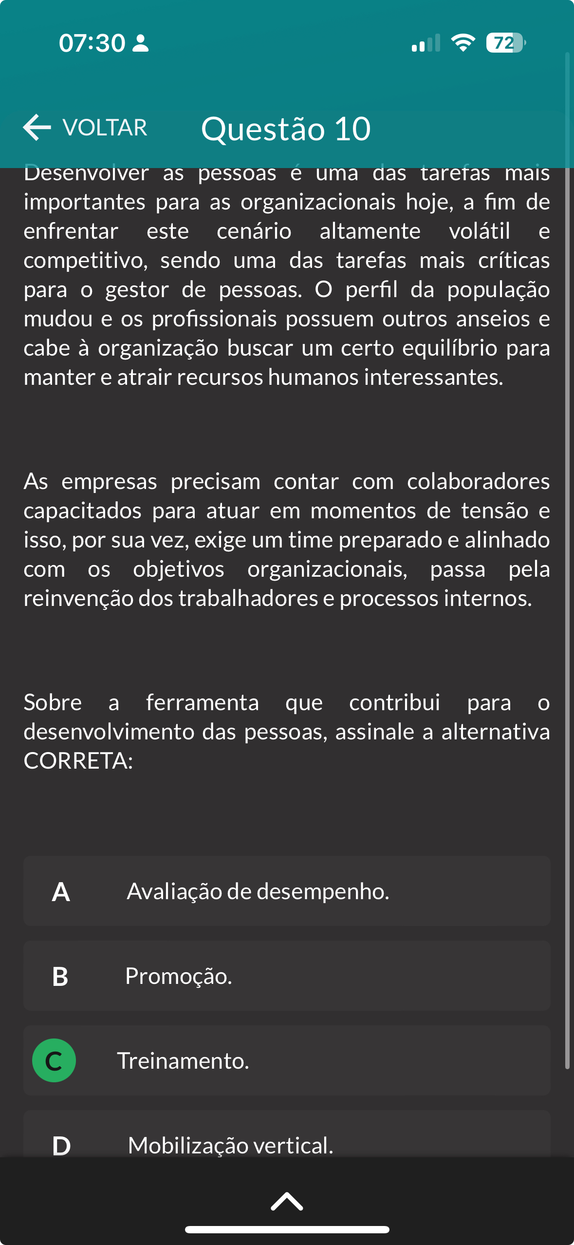 07:30 72 VOLTAR Questão 10 Desenvolver as pessoas e uma das tarefas mais importantes para as organizacionais hoje, a fim de enfrentar este cenário altamente volátil e competitivo, sendo uma das tarefas mais críticas para gestor de pessoas. O perfil da população mudou e os profissionais possuem outros anseios e cabe à organização buscar um certo equilíbrio para manter e atrair recursos humanos interessantes. As empresas precisam contar com colaboradores capacitados para atuar em momentos de tensão e isso, por sua vez, exige um time preparado e alinhado com os objetivos organizacionais, passa pela reinvenção dos trabalhadores e processos internos. Sobre a ferramenta que contribui para O desenvolvimento das pessoas, assinale a alternativa CORRETA: A Avaliação de desempenho. B Promoção. C Treinamento. D Mobilização vertical.