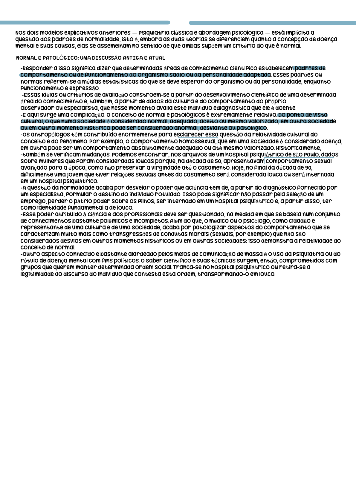 Normal e patológico Livro Nos dois modelos explicativos anteriores — Psiquiatria clássica e abordagem psicologica — está implícita a questao dos padroes de normalidade, isto é, embora as duas teorias se diferenciem quanto a concepçao de doença mental e suas causas, elas se assemelham no sentido de que ambas supõem um critério do que é normal. NORMAL E PATOLÓGICO: UMA DISCUSSÃO ANTIGA E ATUAL -Responder a isso significa dizer que determinadas áreas de conhecimento científico estabelecem padrões de comportamento ou de funcionamento do organismo sadio ou da personalidade adaptada. Esses padrões ou normas referem-se a médias estatísticas do que se deve esperar do organismo ou da personalidade, enquanto funcionamento e expressão. -Essas idéias ou critérios de avaliação constroem-se a partir do desenvolvimento científico de uma determinada área do conhecimento e, também, a partir de dados da cultura e do comportamento do próprio observador ou especialista, que nesse momento avalia este indivíduo ediagnostica que ele é doente. -E aqui surge uma complicação. O conceito de normal e patológicos é extremamente relativo. Do ponto de vista cultural, o que numa sociedade é considerado normal, adequado, aceito ou mesmo valorizado, em outra sociedade ou em outro momento histórico pode ser considerado anormal, desviante ou patológico. -Os antropólogos têm contribuído enormemente para esclarecer essa questão da relatividade cultural do conceito e do fenômeno. Por exemplo, o comportamento homossexual, que em uma sociedade é considerado doença, em outra pode ser um comportamento absolutamente adequado ou até mesmo valorizado. Historicamente, -também se verificam mudanças. Podemos encontrar, nos arquivos de um hospital psiquiátrico de São Paulo, dados sobre mulheres que foram consideradas loucas porque, na década de 50, apresentavam comportamento sexual avançado para a época, como não preservar a virgindade até o casamento. Hoje, no final da década de 90, dificilmente uma jovem que tiver relações sexuais antes do casamento será considerada louca ou será internada em um hospital psiquiátrico. -A questão da normalidade acaba por desvelar o poder que aciência tem de, a partir do diagnóstico fornecido por um especialista, formular o destino do indivíduo rotulado. Isso pode significar não passar pela seleção de um emprego, perder o pátrio poder sobre os filhos, ser internado em um hospital psiquiátrico e, a partir disso, ter como identidade fundamental a de louco. -Esse poder atribuído à ciência e aos profissionais deve ser questionado, na medida em que se baseia num conjunto de conhecimentos bastante polêmicos e incompletos. Além do que, o médico ou o psicólogo, como cidadão e representante de uma cultura e de uma sociedade, acaba por patologizar aspectos do comportamento que se caracterizam muito mais como transgressões de condutas morais (sexuais, por exemplo) que não são considerados desvios em outros momentos históricos ou em outras sociedades: isso demonstra a relatividade do conceito de normal. -Outro aspecto conhecido e bastante alardeado pelos meios de comunicação de massa é o uso da Psiquiatria ou do rótulo de doença mental com fins políticos. O saber científico e suas técnicas surgem, então, comprometidos com grupos que querem manter determinada ordem social. Tranca-se no hospital psiquiátrico ou retira-se a legitimidade do discurso do indivíduo que contesta esta ordem, transformando-o em louco.