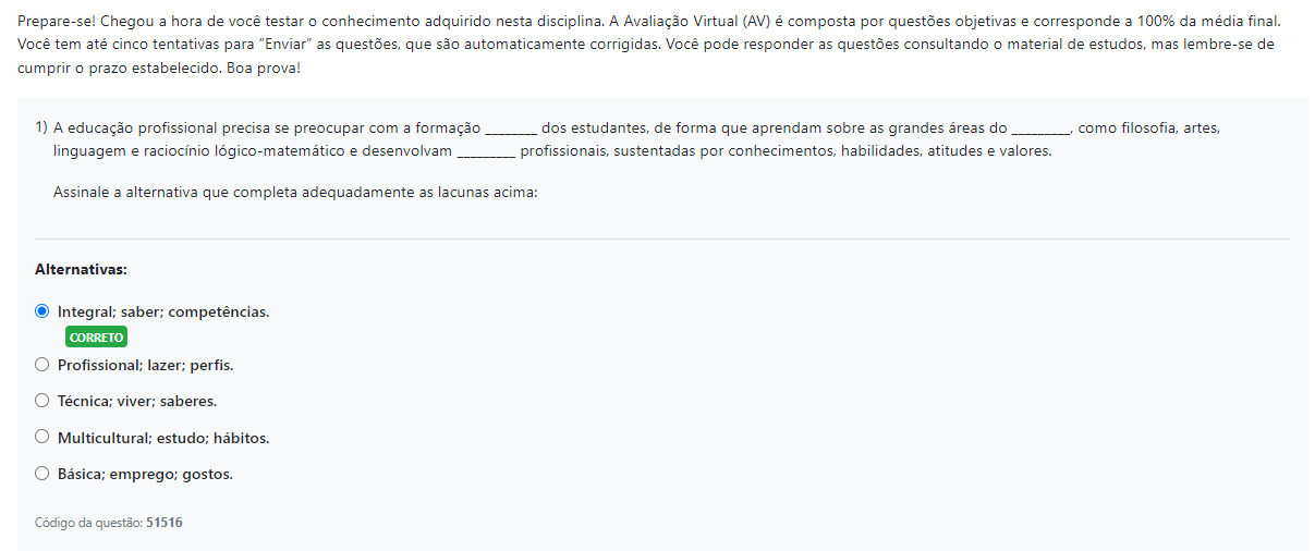 Prepare-se! Chegou a hora de você testar conhecimento adquirido nesta disciplina. A Avaliação Virtual (AV) é composta por questões objetivas e corresponde a 100% da média final. Você tem até cinco tentativas para "Enviar" as que são automaticamente corrigidas. Você pode responder as questões consultando material de estudos, mas lembre-se de cumprir prazo estabelecido. Boa prova! 1) A educação profissional precisa se preocupar com a formação dos estudantes, de forma que aprendam sobre as grandes áreas do como filosofia. linguagem e raciocínio lógico-matemático e desenvolvam profissionais, sustentadas por conhecimentos, habilidades, atitudes e valores. Assinale a alternativa que completa adequadamente as lacunas acima: Alternativas: Integral: saber; competências. CORRETO Profissional: lazer; perfis. Técnica; saberes. Multicultural: estudo; hábitos. Básica: emprego; gostos. Código da questão: 51516