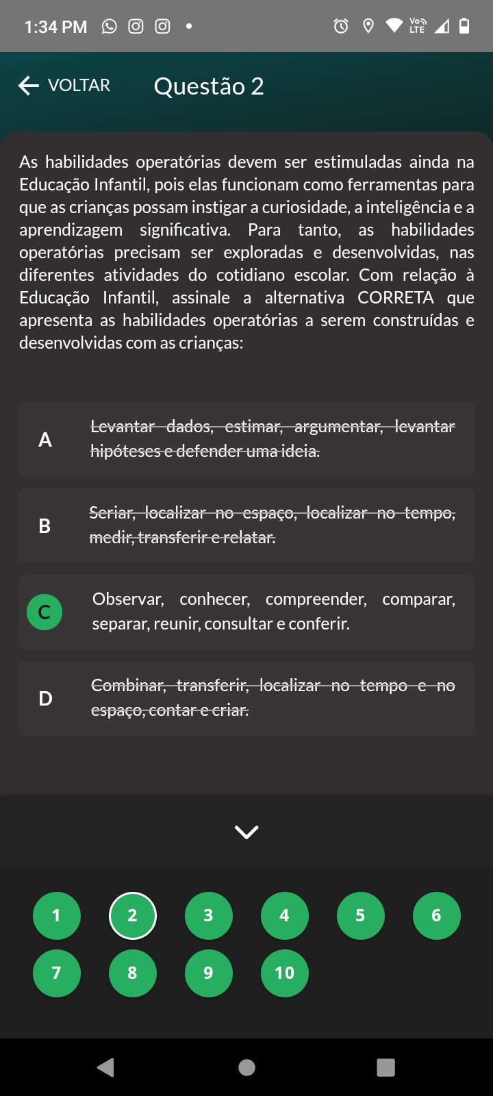 1:34 PM O LTE VOLTAR Questão 2 As habilidades operatórias devem ser estimuladas ainda na Educação Infantil, pois elas funcionam como ferramentas para que as crianças possam instigar a curiosidade, a inteligência e a aprendizagem significativa. Para tanto, as habilidades operatórias precisam ser exploradas e desenvolvidas, nas diferentes atividades do cotidiano escolar. Com relação à Educação Infantil, assinale a alternativa CORRETA que apresenta as habilidades operatórias a serem construídas e desenvolvidas com as crianças: estimar, argumentar, levantar A e defender uma ideia. Seriar, localizar no espaço, localizar no B medir, transferir e relatar. Observar, conhecer, compreender, comparar, C separar, reunir, consultar e conferir. Combinar, transferir, localizar no tempo e D contar e criar. 1 2 3 4 5 6 7 8 9 10
