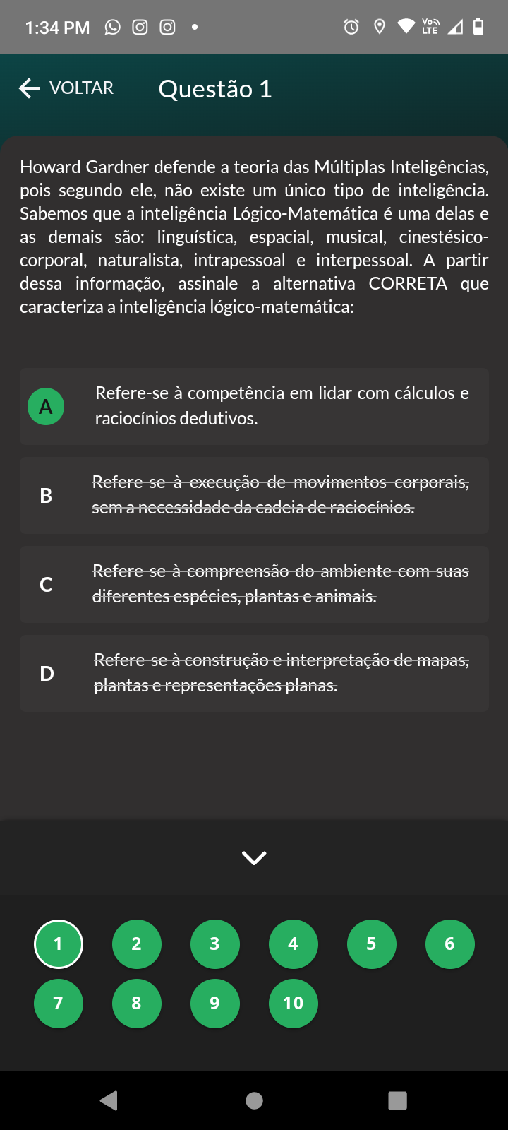 1:34 PM O LTE VOLTAR Questão 1 Howard Gardner defende a teoria das Múltiplas Inteligências, pois segundo ele, não existe um único tipo de inteligência. Sabemos que a inteligência Lógico-Matemática é uma delas e as demais são: linguística, espacial, musical, cinestésico- corporal, naturalista, intrapessoal e interpessoal. A partir dessa informação, assinale a alternativa CORRETA que caracteriza a inteligência lógico-matemática: Refere-se à competência em lidar com cálculos e A raciocínios dedutivos. Refere se à execução de movimentos corporais, sem a necessidade da cadeia de Refere se à compreensão ambiente com suas diferentes espécies, plantas e animais. Refere se à construção e interpretação de mapas, D plantas e representações planas. 1 2 3 4 5 6 7 8 9 10