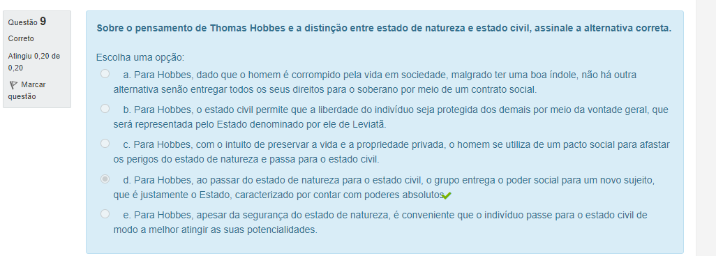 Questão 9 Sobre pensamento de Thomas Hobbes e a distinção entre estado de natureza e estado civil, assinale a alternativa correta. Correto Atingiu de Escolha uma opção: a. Para dado que homem é corrompido pela vida em sociedade, malgrado ter uma boa não há outra Marcar alternativa senão entregar todos os seus direitos para soberano por meio de um contrato social. questão b. Para Hobbes, O estado civil permite que a liberdade do indivíduo seja protegida dos demais por meio da vontade geral, que será representada pelo Estado denominado por ele de C. Para Hobbes, com intuito de preservar a vida e a propriedade privada, homem se utiliza de um pacto social para afastar os perigos do estado de natureza e passa para estado civil. d. Para Hobbes, ao passar do estado de natureza para estado civil, grupo entrega poder social para um novo sujeito, que é justamente Estado, caracterizado por contar com poderes absolutos, e. Para Hobbes, apesar da segurança do estado de natureza, é conveniente que indivíduo passe para estado civil de modo a melhor atingir as suas potencialidades.