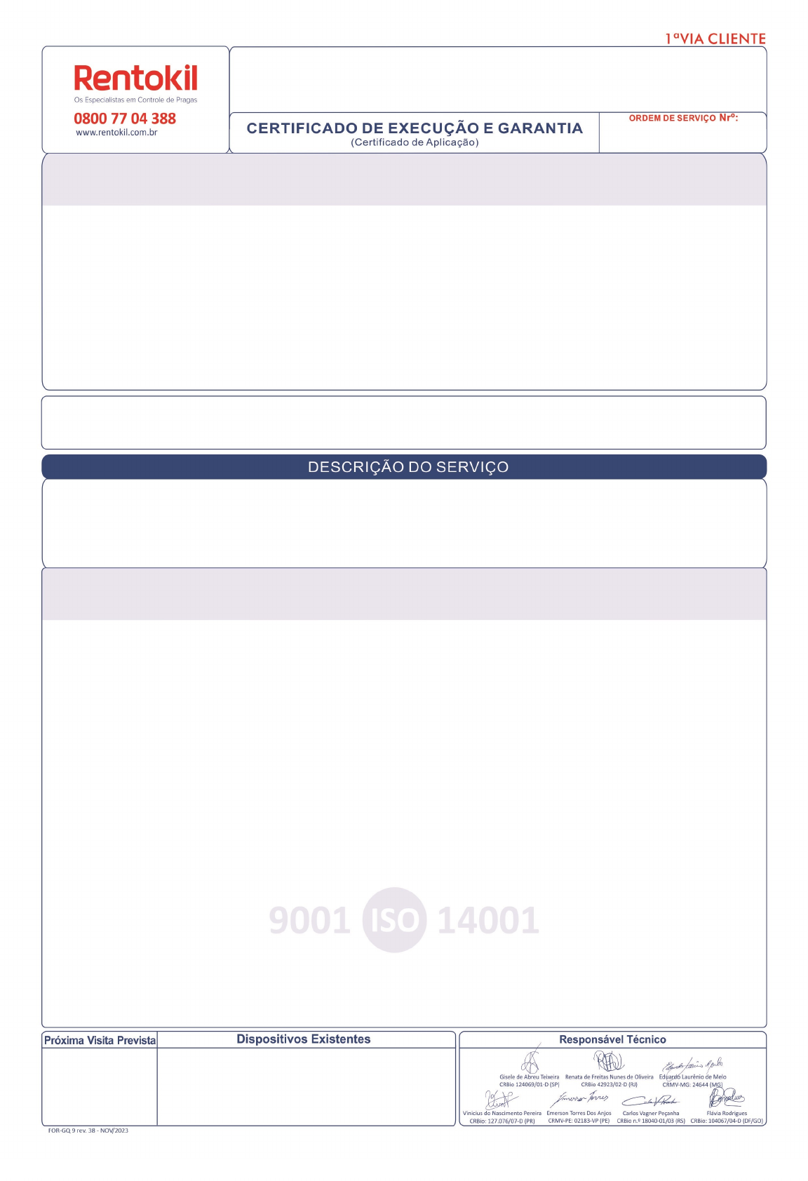 ATIVA CONTROLE AMBIENTAL LTDA CNPJ:06012804000197 Rua Maria Braga Lima, 120 - Alto Cajueiros - Macaé-RJ - CEP.: 27.915-220 F:21 2135-1111 - sac-br@rentokil-initial.com CTA vetores IN005592 Val: 05/02/24 CTA HDR IN008544 Val: 12/03/25 CTA Cap.Qu. IN008424 Val: 26/02/25 L. SANITÁRIA Nº A00433/23 Val: 29/12/24 RT: Horácio Filho CREA 2000106923 145924 Dia e Hora do Serviço 24/07/2024 - Quarta-Feira - 11:00 - M . Aguardando no Local 229995 878 Confirmado Por: Não informado Gestor : CUSTOMER CARE Fone : 0800 77 04 388 EMail: sac-br@rentokil-initial.com EMail : miriam.miranda@rentokil-initial.com Celular : 2197940-0123 Consultor : MIRIAM MARCIA MIRANDA Atividade : SAÚDE - HOSPITAIS Qtde Pavimentos : 1 VIX LOGISTICA SA (104) Nome Fantasia : Unidade : BASE CMAE CNPJ : 32681371004917 AVENIDA MEM DE SÁ, 1661 CEP: 27925545 - IMBOASSICA - MACAÉ - RJ Fone : 229995 878 Para Realizar Este Serviço Equipe : 107 - Veículo : - Placa : Requisito(s) do cliente - válido para todas as visitas (PTC) Requisito(s) do cliente - válido para todas as visitas (OS) Serviço : PROGRAMA DE CONTROLE INTEGRADO DE PRAGAS Visita : PROGRAMADA Garantia : MENSAL(30) Atividade : INTERVENÇÃO QUIMICA/MONITORAMENTO Para a execução dos serviços descritos em ordem de serviço, deve-se utilizar de todos EPI’s, não sendo aceito sua não utilização. Os tratamentos abaixo podem variar de acordo com a avaliação do técnico no momento do serviço. 21/08/2024 11:00 M REALIZAR PROCIP NA BASE. - N/A Ambientes e Praga Tratamentos Vestigio Nível de Infestação GERAIS ASPERSÃO TOCAS BARATA DE ESGOTO BARATA DE RESTAURANTE GERAIS MONITORAMENTO TOCAS ROEDORES 145924 VIX LOGISTICA SA BASE CMAE X Foi realizado o monitoramento das PPE'S ( depósitivos 01 a 03 isca trocada) Foi realizado iscagem de gel baratas e formigas, nas copas e banheiros. 145924 X Paulo Sergio 24 07 2024 IZARIEL DE JESUS DIAS DA LUZ 10:48 20047 10:55 20049 11:46 12:01 cmaeLíder de manutençäo GERAIS ROEDORES (RO) 10142 RATOL MINI BLOCO 100.00 GR N/A 022/23 N/A GERAIS FORMIGAS (FO) 10050 FORMIFIM GEL 7.00 GR N/A 02324 N/A GERAIS BARATA DE RESTAURANTE (BG) 10081 TERMIDOR PRO 4.00 GR N/A 00523 N/A