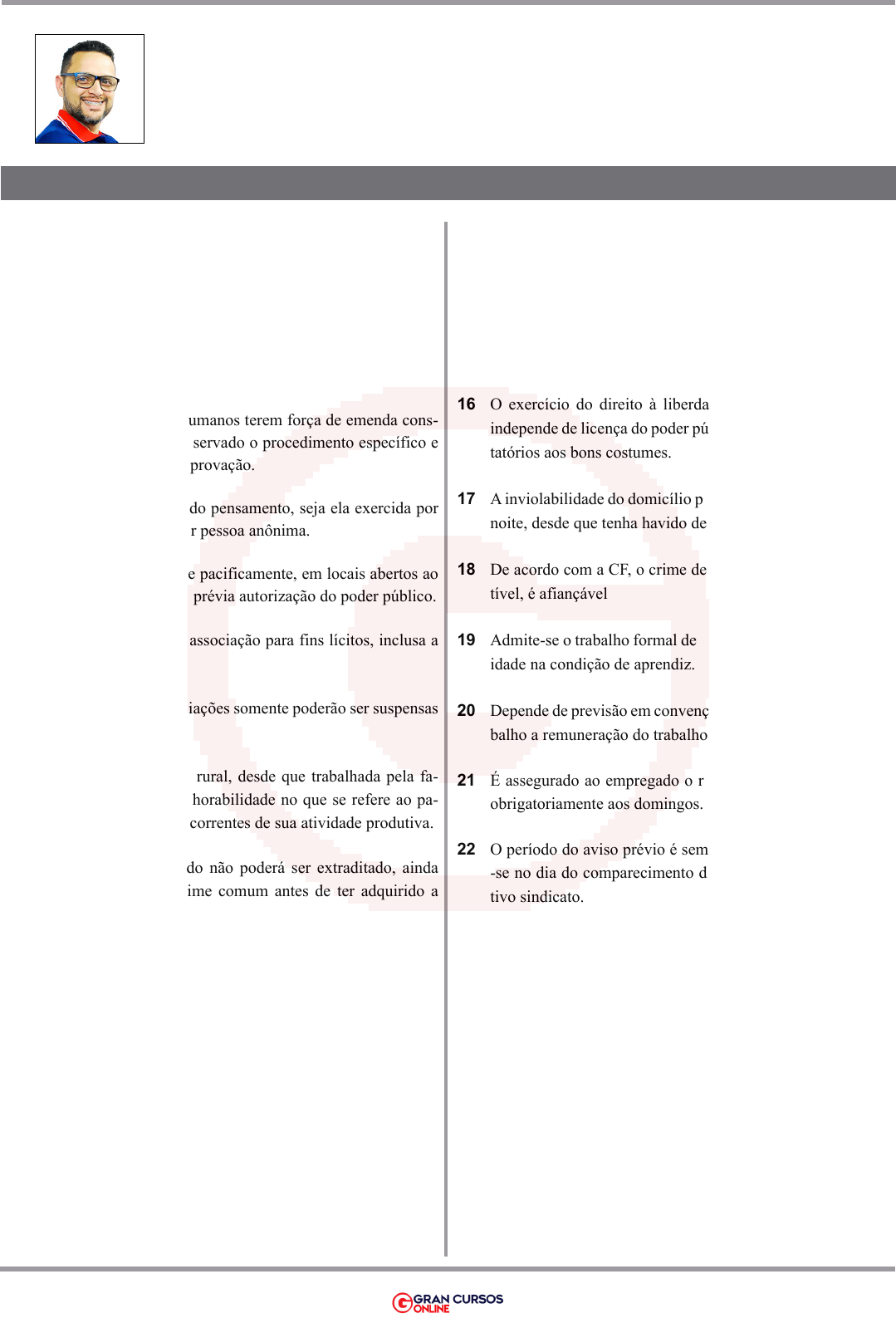 SIMULADO – DIREITO CONSTITUCIONAL DIREITO CONSTITUCIONAL Wellington Antunes Professor de Direito Constitucional, consultor legislativo da Câmera dos Deputados, ex-servidor efetivo do Minis- tério Público da União. 1 Quanto à geração ou à dimensão dos direitos fundamentais, os direitos sociais são considerados de segunda geração ou dimensão. 2 Apenas os direitos individuais explícitos são garantidos pela Constituição Federal, não sendo admitida a invocação de di- reitos fundamentais previstos fora da Constituição. 3 Admite-se a possibilidade de tratados e convenções interna- cionais sobre direitos humanos terem força de emenda cons- titucional, desde que observado o procedimento específico e qualificado para a sua aprovação. 4 É livre a manifestação do pensamento, seja ela exercida por pessoa conhecida ou por pessoa anônima. 5 Todos poderão reunir-se pacificamente, em locais abertos ao público, desde que haja prévia autorização do poder público. 6 É plena a liberdade de associação para fins lícitos, inclusa a de caráter paramilitar. 7 As atividades das associações somente poderão ser suspensas por decisão judicial. 8 A pequena propriedade rural, desde que trabalhada pela fa- mília, usufrui de impenhorabilidade no que se refere ao pa- gamento dos débitos decorrentes de sua atividade produtiva. 9 O brasileiro naturalizado não poderá ser extraditado, ainda que tenha cometido crime comum antes de ter adquirido a nacionalidade brasileira. 10 É absolutamente proibida a aplicação de pena de morte ou de prisão perpétua em todo o território nacional e a qual- quer tempo. 11 Diferentemente do direito de propriedade, o direito de heran- ça não é garantido pelas normas constitucionais. 12 O habeas data é o instituto adequado para a garantia da li- berdade de acusados de prática criminal se não configurado flagrante delito. 13 Com fundamento no princípio da isonomia, o Poder Judiciá- rio pode aumentar vencimentos de servidores. 14 O estrangeiro residente no Brasil pode ajuizar ação popular para anular ato administrativo lesivo ao patrimônio público. 15 Segundo a CF, é inviolável a imagem das pessoas, as quais têm assegurado o direito à indenização pelo dano material e moral decorrente de violação de sua imagem. 16 O exercício do direito à liberdade de expressão intelectual independe de licença do poder público, exceto nos casos aten- tatórios aos bons costumes. 17 A inviolabilidade do domicílio pode ser relativizada durante a noite, desde que tenha havido determinação judicial. 18 De acordo com a CF, o crime de racismo, embora imprescri- tível, é afiançável 19 Admite-se o trabalho formal de menores de dezesseis anos de idade na condição de aprendiz. 20 Depende de previsão em convenção ou acordo coletivo de tra- balho a remuneração do trabalho noturno superior ao diurno. 21 É assegurado ao empregado o repouso semanal remunerado obrigatoriamente aos domingos. 22 O período do aviso prévio é sempre de trinta dias, cessando- -se no dia do comparecimento do empregado ao seu respec- tivo sindicato. 23 O trabalhador rural não pode ser beneficiário do seguro- -desemprego. 24 É garantida a criação de mais de uma organização sindical, em qualquer grau, representativa de categoria profissional ou econômica, na mesma base territorial. 25 O aposentado filiado não terá direito a votar e ser votado nas organizações sindicais. 26 O lazer é um direito social expressamente consagrado no tex- to constitucional. 27 Só será obrigado a filiar-se ou a manter-se filiado a sindicato SIMULADO – DIREITO CONSTITUCIONAL o trabalhador que se enquadrar nas previsões legais. 28 Nas empresas com mais de cinquenta empregados, é assegu- rada a eleição de um representante, com a finalidade exclu- siva de promover o entendimento direto entre empregadores e empregados. 29 Brasileiros natos e naturalizados são equiparados para todos os efeitos, dado o princípio da isonomia, conforme o qual to- dos são iguais perante a lei. 30 Filhos de brasileiros nascidos no estrangeiro podem optar pela naturalização, desde que o façam antes da maioridade civil. 31 São considerados brasileiros natos apenas os nascidos em solo nacional. 32 A naturalização é concedida exclusivamente a portugueses tutelados pelo Estatuto da Igualdade, caso haja reciprocidade em favor dos brasileiros. 33 Aos portugueses com residência permanente no país serão atribuídos os direitos inerentes a brasileiro nato. 34 Será declarada a perda da nacionalidade do brasileiro que co- meter crime contra a vida do Presidente da República. 35 É privativo de brasileiro nato o cargo de juiz de direito. 36 Considera-se brasileiro naturalizado o nascido no estrangei- ro, de pai brasileiro e mãe estrangeira, se o pai estiver a servi- ço da República Federativa do Brasil. 37 O Distrito Federal e os Municípios poderão ter símbo- los próprios. 38 Contra candidato que cometer atos como, por exemplo, abuso de poder econômico, corrupção ou fraude durante o processo eleitoral cabe ação de impugnação de mandato, que tramitará necessariamente em segredo de justiça. 39 O cidadão que possua a capacidade eleitoral ativa tem, neces- sariamente, capacidade eleitoral passiva. 40 Senadores e governadores de estado e do Distrito Federal se equiparam no que se refere à idade mínima exigida como condição de elegibilidade. 41 O voto, obrigatório para maiores de dezoito anos de idade, é facultativo para aqueles cujos direitos políticos tenham sido suspensos em decorrência de condenação criminal transitada em julgado. 42 É vedada a cassação de direitos políticos. 43 Os militares federais não são alistáveis. 44 São estáveis, após dois anos de efetivo exercício, os servido- res nomeados para cargo em comissão. 45 No âmbito da Administração Pública, não existe previsão le- gal para a reserva de vagas em concursos públicos para as pesso
