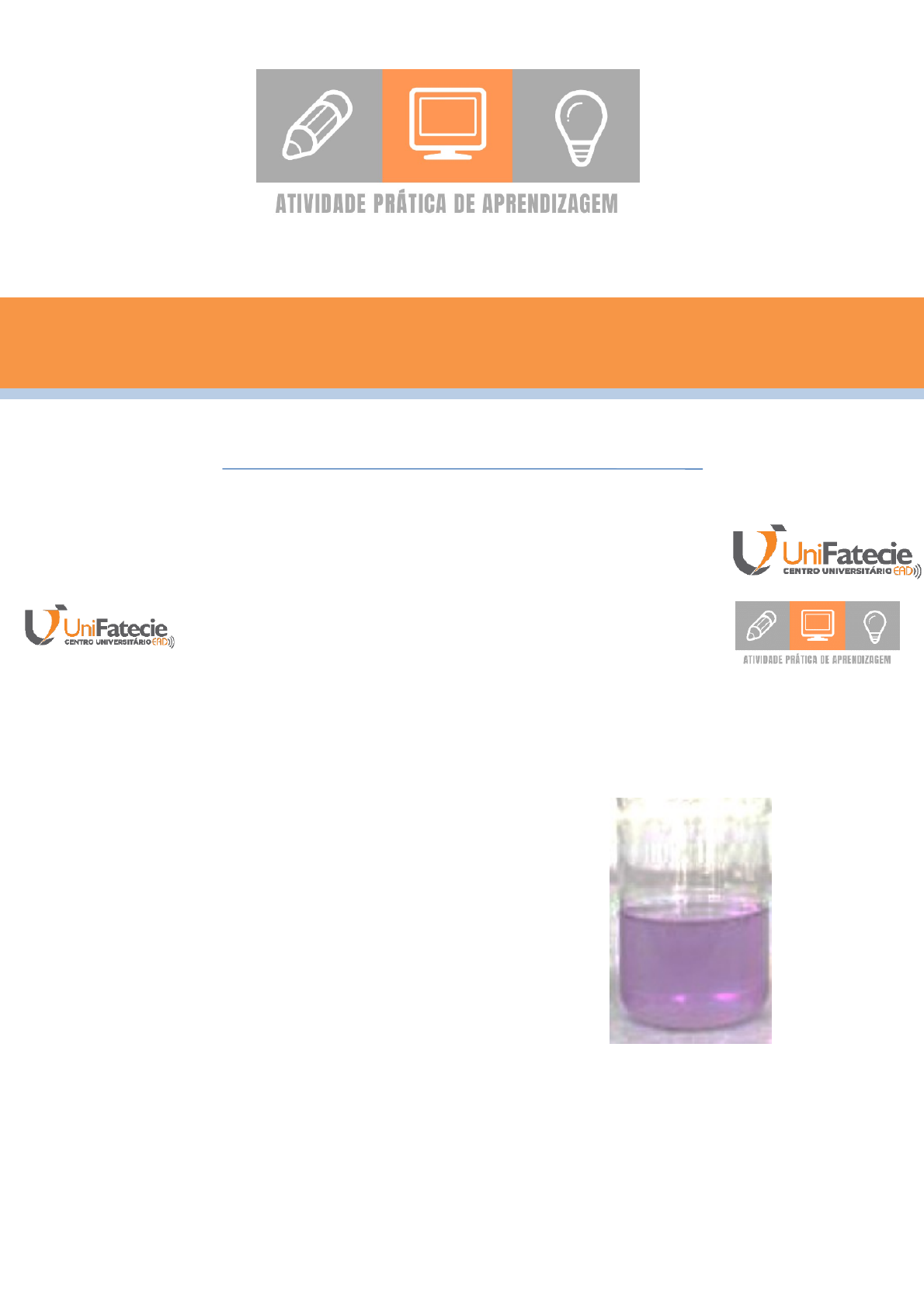 Impresso por Andre Jesus, E-mail andrebezerra7405@gmail.com para uso pessoal e privado. Este material pode ser protegido por direitos autorais e não pode ser reproduzido ou repassado para terceiros. 06/07/2024, 17:29:26 Bioquímica Nome do discente EFEITOS DE TAMPÕES E INDICADORES DE pH EM SOLUÇÕES ÁCIDAS E BÁSICAS OBJETIVO O objetivo dessa atividade prática foi caracterizar soluções ácidas e básicas pelo emprego de indicador de pH e compreender o funcionamento de um sistema tampão. METODOLOGIA Procedimento 1: Preparo do indicador ácido-base a partir do repolho roxo. 1. Separe 4 a 5 folhas do repolho roxo e pique em pedaços pequenos. 2. Adicione em uma panela com água até cobrir todo o material e deixe ferver. 3. Após a fervura desligue o fogo e passe o conteúdo em uma peneira. Reserve a parte líquida. 4. O seu extrato está pronto! Figura 1 – indicador ácido-base Impresso por Andre Jesus, E-mail andrebezerra7405@gmail.com para uso pessoal e privado. Este material pode ser protegido por direitos autorais e não pode ser reproduzido ou repassado para terceiros. 06/07/2024, 17:29:26 EFEITOS DE TAMPÕES E INDICADORES DE pH EM SOLUÇÕES ÁCIDAS E BÁSICAS Procedimento 2: Testando o indicador ácido-base com o vinagre e a água sanitária. Para avaliar como o indicador se comporta diante de substâncias ácidas e básicas, vamos colocá-lo em contato com o vinagre (ácido) e com a água sanitária (base). Também é interessante avaliar o comportamento em uma solução neutra, e para isso, utilizaremos a água. 1. Identifique três copos ou recipientes transparentes, sendo um para o vinagre, outro para a água sanitária e outro para água; 2. Preencha pelo menos 1/3 do volume dos copos com seus respectivos produtos, em um copo o vinagre, no outro copo a água sanitária e no outro copo a água; 3. Com o auxílio de um conta gotas ou seringa adicione cerca de 10 gotas do indicador ácido-base em cada um dos copos e observe a mudança de cor na solução. Reserve os copos, pois serão utilizados na próxima etapa; 4. Registre através de fotos e da descrição da mudança de cor; 5. Associe a propriedade ácida ou básica das soluções com a cor observada. Procedimento 3: Avaliando a capacidade tampão dos comprimidos efervescentes. 1. Em um recipiente transparente com aproximadamente 100 mL de água, adicione 30 gotas de extrato de repolho e dissolva um comprimido antiácido efervescente; 2. Depois que o comprimido dissolver completamente, adicione água sanitária lentamente utilizando uma seringa. Anote a quantidade de água sanitária utilizada para mudar o pH do meio para verde; 3. Observe que a mudança de cor inicia pelo fundo, pois é onde a água sanitária deposita-se. Portanto, devemos agitar a solução a medida que vamos adicionando a água sanitária. 4. Para finalizar, adicione água sanitária ao copo contendo vinagre utilizado no procedimento anterior até verificar a mudança de cor. Anote a quantidade utilizada. 5. Registre através de fotos. 6. Descreva detalhadamente as mudanças observadas no pH do meio através da mudança de cor, apresentando a quantidade de base (água sanitária) que foi necessária para mudar o pH do meio. 7. Explique as observações utilizando o princípio de soluções tampões. RESULTADOS E DISCUSSÃO • Insira as fotos de cada passo realizado. Adicione uma descrição detalhada, no formato de texto, sobre as mudanças observadas no pH do meio através da mudança de cor. • Compare a cor antes e após a adição de reagentes (procedimento 2 e 3). Relacione os resultados com as propriedades de ácidos e bases, e os princípios da escala e de indicadores de pH. • Descreva o volume de água sanitária foi necessário para mudar a coloração do meio contendo antiácido e vinagre (procedimento 3). Relacione esses resultados com os princípios de solução tampão. Figura 2 – Indicadores de pH EFEITOS DE TAMPÕES E INDICADORES DE pH EM SOLUÇÕES ÁCIDAS E BÁSICAS Impresso por Andre Jesus, E-mail andrebezerra7405@gmail.com para uso pessoal e privado. Este material pode ser protegido por direitos autorais e não pode ser reproduzido ou repassado para terceiros. 06/07/2024, 17:29:26 RESULTADOS E DISCUSSÃO • Insira as fotos de cada passo realizado. Adicione uma descrição detalhada, no formato de texto, sobre as mudanças observadas no pH do meio através da mudança de cor. • Compare a cor antes e após a adição de reagentes (procedimento 2 e 3). Relacione os resultados com as propriedades de ácidos e bases, e os princípios da escala e de indicadores de pH. O indicador de pH adicionado no vinagre, mudou para a cor rosa claro. Figura 3 – VINAGRE EFEITOS DE TAMPÕES E INDICADORES DE pH EM SOLUÇÕES ÁCIDAS E BÁSICAS RESULTADOS E DISCUSSÃO • Insira as fotos de cada passo realizado. Adicione uma descrição detalhada, no formato de texto, sobre as mudanças observadas no pH do meio através da mudança de cor. • Compare a cor antes e após a adição de reagentes (procedimento 2 e 3). Relacione os resultados com as propriedades de ácidos e bases, e os princípios da escala e de indicadores de pH. O indicador de pH adicionado na água sanitária, mudou para a cor esverdeada. . Figura 4 – ÁGUA SANITÁRIA EFEITOS DE TAMPÕES E INDICADORES DE pH EM SOLUÇÕES ÁCIDAS E BÁSICAS Impresso por Andre Jesus, E-mail andrebezerra7405@gmail.com para uso pessoal e privado. Este material pode ser protegido por direitos autorais e não pode ser reproduzido ou repassado para terceiros. 06/07/2024, 17:29:26 RESULTADOS E DISCUSSÃO • Insira as fotos de cada passo realizado. Adicione uma descrição detalhada, no formato de texto, sobre as mudanças observadas no pH do meio através da mudança de cor. • Compare a cor antes e após a adição de reagentes (procedimento 2 e 3). Relacione os resultados com as propriedades de ácidos e bases, e os princípios da escala e de indicadores de pH. O indicador de pH adicionado