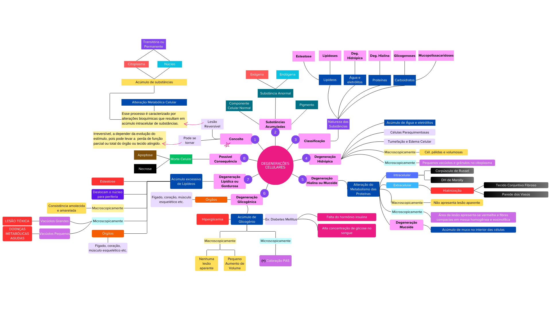 Transitória ou Permanente Deg. Esteatose Lipidoses Deg. Hialina Glicogenoses Mucopolissacaridoses Citoplasma Núcleo Exógena Endógena Água e Lipídeos Proteínas Acúmulo de substâncias Carboidratos eletrólitos Substância Anormal Alteração Metabólica Celular Componente Pigmento Celular Normal Esse processo é caracterizado por alterações bioquímicas que resultam em intracelular de Lesão Substâncias Natureza das Acúmulo de Água e eletrólitos Reversível Acumuladas Substâncias Irreversível, a depender da evolução do 2 Células Paraquimentosas pois pode levar a perda de função Pode se Conceito 1 3 tornar Classificação parcial ou total do órgão ou tecido atingido Tumefação e Edema Celular Macroscopicamente Cél. pálidas e volumosas Apoptose Possível Morte Celular 8 4 Degeneração Consequência DEGENERAÇÕES Microscopicamente Pequenos e grânulos no citoplasma Necrose CELULARES Corpúsculo de Russel Intracelular Degeneração Acúmulo excessivo Esteatose Lipídica ou 7 5 Degeneração DH de Marolly de Lipídeos Hialina ou Mucoide Gordurosa Alteração do Extracelular Tecido Conjuntivo Fibroso Metabolismo das Deslocam núcleo Hialinização 6 Proteínas Parede dos Vasos para periferia Fígado, coração, músculo Degeneração Órgãos esquelético etc. Glicogênica Macroscopicamente Não apresenta lesão aparente Consistência amolecida Macroscopicamente e amarelada Microscopicamente Acúmulo de Falta do hormônio insulina Area da lesão apresenta-se vermelha e fibras LESÃO Grandes Hiperglicemia -Ex: Diabetes Mellitus Microscopicamente Glicogênio compactas em massa homogênea e eosinofílica Degeneração DOENÇAS Alta concentração de glicose no Mucoide Acúmulo de muco no interior das células METABÓLICAS Pequenos sangue AGUDAS Macroscopicamente Microscopicamente Fígado, coração, esquelético Nenhuma Pequeno (+) Coloração PAS lesão Aumento de aparente Volume