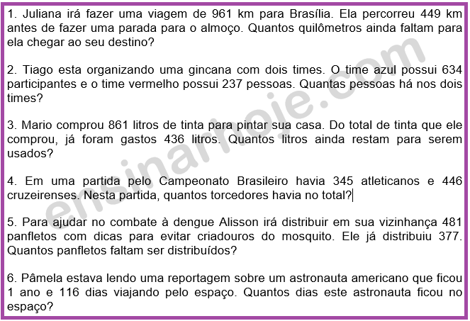 1. Juliana irá fazer uma viagem de 961 km para Ela percorreu 449 km antes de fazer uma parada para o almoço. Quantos quilômetros ainda faltam para ela chegar ao seu destino? 2. Tiago esta organizando uma gincana com dois times. time azul possui 634 participantes e time vermelho possui 237 pessoas. Quantas pessoas há nos dois times? 3. Mario comprou 861 litros de tinta para pintar sua casa. Do total de tinta que ele comprou, já foram gastos 436 litros. Quantos litros ainda restam para serem usados? 4. Em uma partida pelo Campeonato Brasileiro havia 345 atleticanos e 446 cruzeirenses. Nesta partida, quantos torcedores havia no total? 5. Para ajudar no combate à dengue Alisson irá distribuir em sua vizinhança 481 panfletos com dicas para evitar criadouros do mosquito. Ele já distribuiu 377 Quantos panfletos faltam ser distribuídos? 6. Pâmela estava lendo uma reportagem sobre um astronauta americano que ficou 1 ano e 116 dias viajando pelo espaço. Quantos dias este astronauta ficou no espaço?