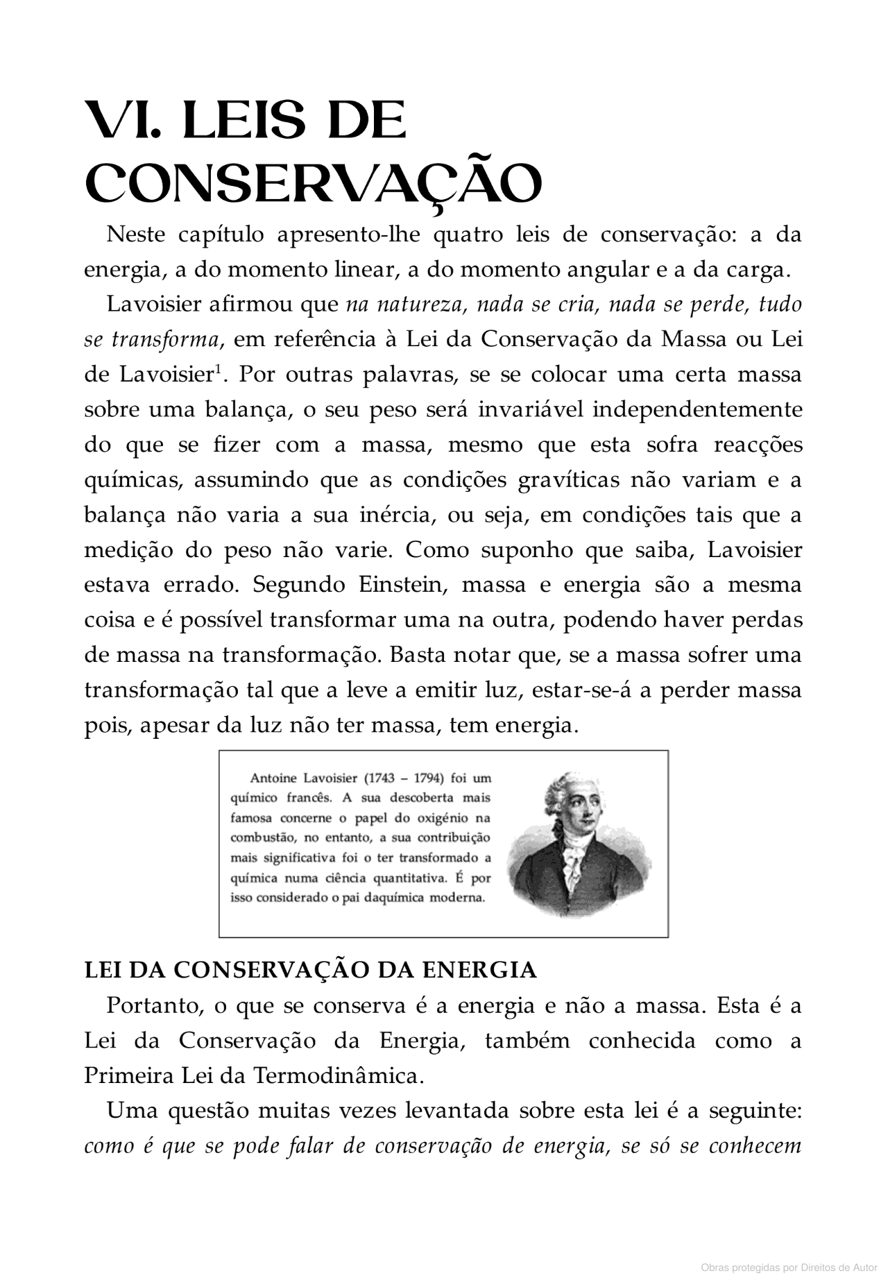 VI. LEIS DE CONSERVAÇÃO Neste capítulo apresento-lhe quatro leis de conservação: a da energia, a do momento linear, a do momento angular e a da carga. Lavoisier afirmou que na natureza, nada se cria, nada se perde, tudo se transforma, em referência à Lei da Conservação da Massa ou Lei de Por outras palavras, se se colocar uma certa massa sobre uma balança, o seu peso será invariável independentemente do que se fizer com a massa, mesmo que esta sofra químicas, assumindo que as condições gravíticas não variam e a balança não varia a sua inércia, ou seja, em condições tais que a medição do peso não varie. Como suponho que saiba, Lavoisier estava errado. Segundo Einstein, massa e energia são a mesma coisa e é possível transformar uma na outra, podendo haver perdas de massa na transformação. Basta notar que, se a massa sofrer uma transformação tal que a leve a emitir luz, estar-se-á a perder massa pois, apesar da luz não ter massa, tem energia. Antoine Lavoisier (1743 - 1794) foi um químico A sua descoberta mais famosa concerne o papel do oxigénio na combustão, no entanto, a sua contribuição mais significativa foi o ter transformado a química numa ciência quantitativa. É por isso considerado o pai daquímica moderna. LEI DA CONSERVAÇÃO DA ENERGIA Portanto, o que se conserva é a energia e não a massa. Esta é a Lei da Conservação da Energia, também conhecida como a Primeira Lei da Termodinâmica. Uma questão muitas vezes levantada sobre esta lei é a seguinte: como é que se pode falar de conservação de energia, se só se conhecem Obras protegidas por Direitos de Autor