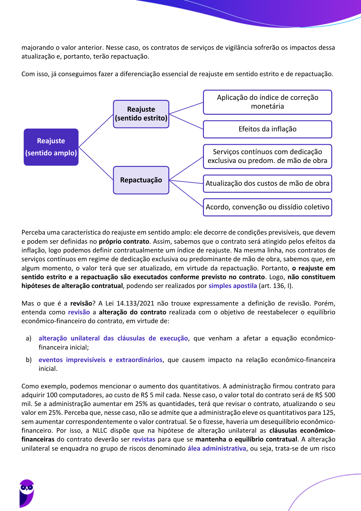 majorando o valor anterior. Nesse caso, os contratos de serviços de vigilância sofrerão os impactos dessa atualização e, portanto, terão repactuação. Com isso, já conseguimos fazer a diferenciação essencial de reajuste em sentido estrito e de repactuação. Perceba uma característica do reajuste em sentido amplo: ele decorre de condições previsíveis, que devem e podem ser definidas no próprio contrato. Assim, sabemos que o contrato será atingido pelos efeitos da inflação, logo podemos definir contratualmente um índice de reajuste. Na mesma linha, nos contratos de serviços contínuos em regime de dedicação exclusiva ou predominante de mão de obra, sabemos que, em algum momento, o valor terá que ser atualizado, em virtude da repactuação. Portanto, o reajuste em sentido estrito e a repactuação são executados conforme previsto no contrato. Logo, não constituem hipóteses de alteração contratual, podendo ser realizados por simples apostila (art. 136, I). Mas o que é a revisão? A Lei 14.133/2021 não trouxe expressamente a definição de revisão. Porém, entenda como revisão a alteração do contrato realizada com o objetivo de reestabelecer o equilíbrio econômico-financeiro do contrato, em virtude de: a) alteração unilateral das cláusulas de execução, que venham a afetar a equação econômico- financeira inicial; b) eventos imprevisíveis e extraordinários, que causem impacto na relação econômico-financeira inicial. Como exemplo, podemos mencionar o aumento dos quantitativos. A administração firmou contrato para adquirir 100 computadores, ao custo de R$ 5 mil cada. Nesse caso, o valor total do contrato será de R$ 500 mil. Se a administração aumentar em 25% as quantidades, terá que revisar o contrato, atualizando o seu valor em 25%. Perceba que, nesse caso, não se admite que a administração eleve os quantitativos para 125, sem aumentar correspondentemente o valor contratual. Se o fizesse, haveria um desequilíbrio econômico- financeiro. Por isso, a NLLC dispõe que na hipótese de alteração unilateral as cláusulas econômico- financeiras do contrato deverão ser revistas para que se mantenha o equilíbrio contratual. A alteração unilateral se enquadra no grupo de riscos denominado álea administrativa, ou seja, trata-se de um risco Reajuste (sentido amplo) Reajuste (sentido estrito) Aplicação do índice de correção monetária Efeitos da inflação Repactuação Serviços contínuos com dedicação exclusiva ou predom. de mão de obra Atualização dos custos de mão de obra Acordo, convenção ou dissídio coletivo Equipe Direito Administrativo, Herbert Almeida, Renan Araujo Aula 03 - Prof. Herbert Almeida CNU (Bloco 7 - Gestão Governamental e Administração Pública) Conhecimentos Específicos - Eixo Temático 4 - Compras na Administração Pública - 2024 (Pós-Edital) www.estrategiaconcursos.com.br 24580473191 - Fatima Cristina Cunha Maia Silva 63 154 cuja responsabilidade é imputável à administração. Assim, se a administração aumenta as quantidades ou altera os projetos, ela própria terá que arcar com os custos desta alteração. O segundo caso trata de situações excepcionais, como eventos da natureza (ex.: terremoto); eventos de terceiros (ex.: greve de caminhoneiros); alteração de tributos; atraso na liberação dos locais da obra, entre outros. Note que a revisão não decorre de algo periódico como a inflação ou a convenção coletiva de trabalho. Não há, por exemplo, um “índice” de revisão que poderia ser revisto no contrato. Daí porque a revisão representa uma efetiva alteração contratual, devendo ser firmada por intermédio de aditamento do contrato. Assim, tanto o reajuste como a revisão objetivam a manutenção do equilíbrio econômico-financeiro do contrato. Entretanto, o reajuste, nas suas duas formas, é previsível e consta no próprio contrato, devendo ser registrado por apostila. Por outro lado, a revisão é, a priori, imprevisível, constituindo alteração do contrato e devendo ser formalizada por aditamento. Já vimos, nesta aula, as hipóteses de revisão decorrentes de alteração unilateral (qualitativa e quantitativa). Em tópico específico, vamos estudar a teoria da imprevisão, que constitui a segunda hipótese de revisão dos contratos. Antes, porém, vamos aprofundar algumas outras questões sobre reajuste, repactuação e revisão. Manutenção do equilíbrio econ.- financ. do contrato Reajuste (sent. amplo) Previsível e periódico Critério definido no contrato Não é alteração contratual Formalizado por apostila Revisão Imprevisível (em regra) Não há como definir no contrato É alteração contratual Formalizada por aditamento Equipe Direito Administrativo, Herbert Almeida, Renan Araujo Aula 03 - Prof. Herbert Almeida CNU (Bloco 7 - Gestão Governamental e Administração Pública) Conhecimentos Específicos - Eixo Temático 4 - Compras na Administração Pública - 2024 (Pós-Edital) www.estrategiaconcursos.com.br 24580473191 - Fatima Cristina Cunha Maia Silva 64 154