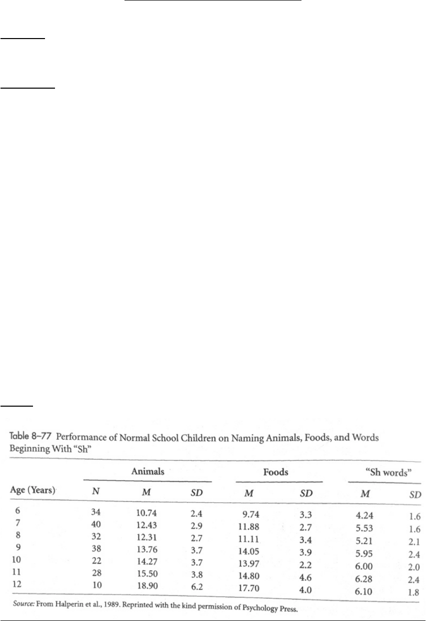 Teste de Fluência Verbal Semântica Objetivo: – É um teste sensível para disfunção frontais e associativas semânticas. Avalia: Linguagem (produção e fluência), perseveração, fluência verbal semântica. Descrição: A categoria mais comum é "animais" e o examinado é solicitado a produzir o máximo de nomes de animais possível dentro de um intervalo de um minuto. Categoria Animal: Fale todos os animais que você conseguir falar, vale qualquer tipo de bicho. OBS: (quando são lembrados animais cuja a denominação de gênero é semelhante (gato e gata) um deles não é pontuado, mas quando a denominação é diferente (cavalo e égua) vale. Nomes de animais extintos, imaginários ou mágicos (míticos) são aceitos, mas nomes próprios como Fido, Rex e Bob não. Categoria Frutas: Fale todas as frutas que você conseguir falar, vale qualquer tipo de fruta. TEMPO: Tempo: 1 minuto, marcado assim que terminar a instrução. OBSERVAÇÃO: É pontuada a denominação genérica de subcategorias de animais, por ex: peixe ou pássaro, mas se forem seguidas por exemplos da classe como peixe, tubarão, baleia, cancela a subcategoria e considera os exemplos que são em maior quantidade, e pássaro, beija-flor, bem-ti-vi, sabiá, cancela a subcategoria pássaro e considera os exemplos. Tabela NOME DO PACIENTE:________________________________________________ IDADE____________ SEXO____________ DATA DO TESTE: ______/ ______/ _________ ESCOLARIDADE: ____________________________________________________ APLICADOR: ________________________________________________________ Total de Nomes de Animais: __________ Total de Nomes de Frutas: ________ CATEGORIA ANIMAIS CATEGORIAS FRUTAS 1. 2. 3. 4. 5. 6. 7. 8. 9. 10. 11. 12. 13. 14. 15. 16. 17. 18. 19. 20. 21. 22. 23. 24. 25.