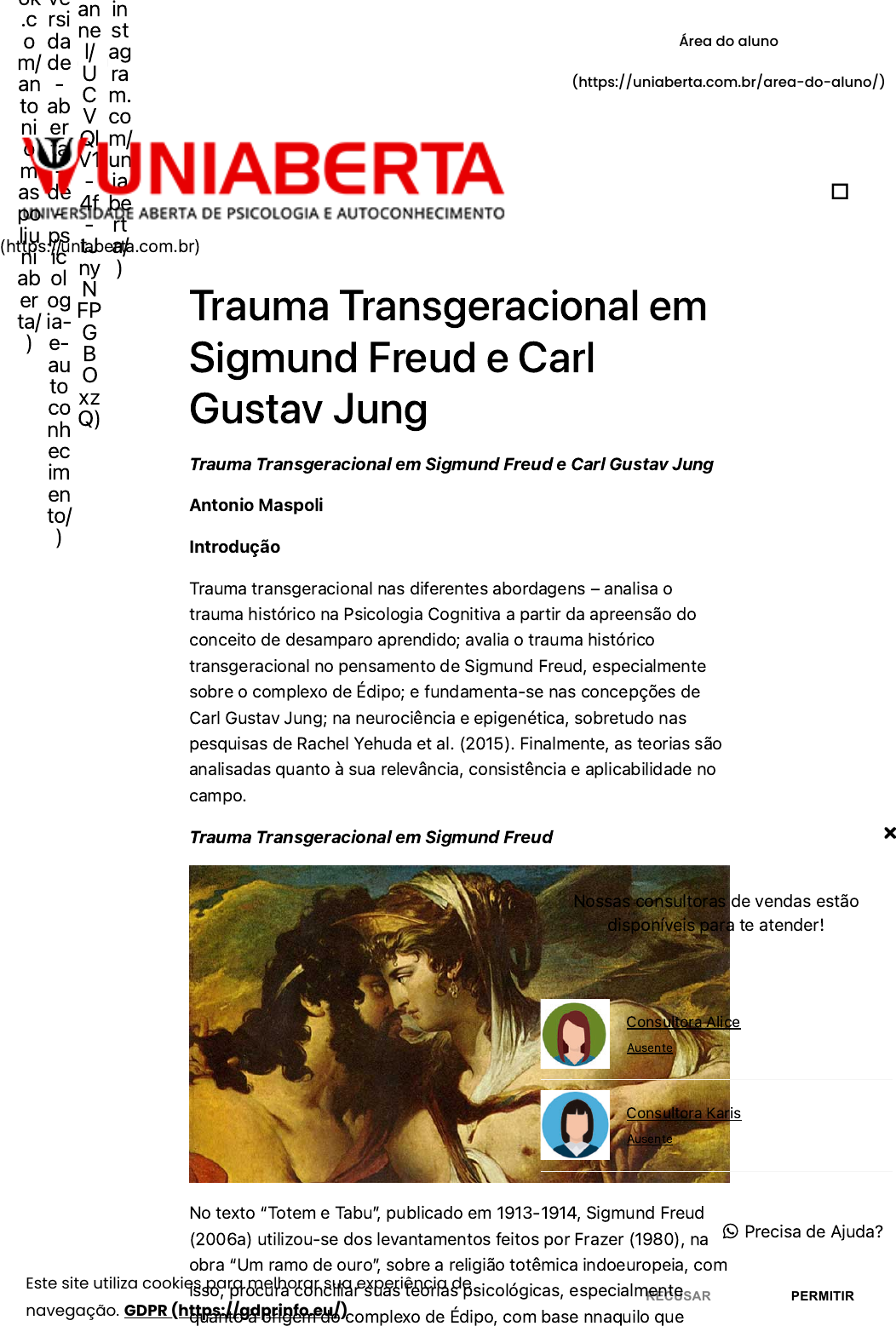 Trauma Transgeracional em Sigmund Freud e Carl Gustav Jung Trauma Transgeracional em Sigmund Freud e Carl Gustav Jung Antonio Maspoli Introdução Trauma transgeracional nas diferentes abordagens – analisa o trauma histórico na Psicologia Cognitiva a partir da apreensão do conceito de desamparo aprendido; avalia o trauma histórico transgeracional no pensamento de Sigmund Freud, especialmente sobre o complexo de Édipo; e fundamenta-se nas concepções de Carl Gustav Jung; na neurociência e epigenética, sobretudo nas pesquisas de Rachel Yehuda et al. (2015). Finalmente, as teorias são analisadas quanto à sua relevância, consistência e aplicabilidade no campo. Trauma Transgeracional em Sigmund Freud No texto “Totem e Tabu”, publicado em 1913-1914, Sigmund Freud (2006a) utilizou-se dos levantamentos feitos por Frazer (1980), na obra “Um ramo de ouro”, sobre a religião totêmica indoeuropeia, com isso, procura conciliar suas teorias psicológicas, especialmente quanto à origem do complexo de Édipo, com base nnaquilo que ok .c o m/ an to ni o m as po liu ni ab er ta/ ) ve rsi da de - ab er ta - de - ps ic ol og ia- e- au to co nh ec im en to/ ) an ne l/ U C V Ql V1 - 4f - tJ ny N FP G B O xz Q) in st ag ra m. co m/ un ia be rt a/ ) Área do aluno (https://uniaberta.com.br/area-do-aluno/) (https://uniaberta.com.br) � Este site utiliza cookies para melhorar sua experiência de navegação. GDPR (https://gdprinfo.eu/) PERMITIRRECUSAR Precisa de Ajuda? Nossas consultoras de vendas estão disponíveis para te atender! Consultora Alice Ausente Consultora Karis Ausente https://www.facebook.com/antoniomaspoliuniaberta/ https://www.linkedin.com/company/universidade-aberta-de-psicologia-e-autoconhecimento/ https://www.youtube.com/channel/UCVQlV1-4f-tJnyNFPGBOxzQ https://www.instagram.com/uniaberta/ https://uniaberta.com.br/area-do-aluno/ https://uniaberta.com.br/ https://gdprinfo.eu/ https://gdprinfo.eu/ https://gdprinfo.eu/ https://gdprinfo.eu/ https://gdprinfo.eu/ https://gdprinfo.eu/ https://gdprinfo.eu/ https://gdprinfo.eu/ https://gdprinfo.eu/ https://gdprinfo.eu/ https://gdprinfo.eu/ https://gdprinfo.eu/ https://gdprinfo.eu/ https://gdprinfo.eu/ https://gdprinfo.eu/ https://gdprinfo.eu/ https://gdprinfo.eu/ https://gdprinfo.eu/ https://gdprinfo.eu/ https://gdprinfo.eu/ javascript:; javascript:; javascript:; javascript:; javascript:; javascript:; javascript:; javascript:; javascript:; javascript:; javascript:; javascript:; javascript:; javascript:; javascript:; javascript:; javascript:; javascript:; javascript:; javascript:; javascript:; javascript:; javascript:; javascript:; javascript:; javascript:; javascript:; javascript:; javascript:; javascript:; javascript:; javascript:; javascript:; javascript:; javascript:; javascript:; javascript:; javascript:; javascript:; javascript:; javascript:; javascript:; javascript:; javascript:; javascript:; javascript:; javascript:; javascript:; javascript:; javascript:; observou em sua clínica psicológica, com o comportamento daqueles povos ditos primitivos pesquisados na biblioteca por Frazer. Freud comparou tais dados com os fatos observados em seus próprios pacientes – isso tudo ainda à época da Primeira Tópica. A partir desse estudo e de suas suposições, Freud admite coincidências com a estrutura da personalidade do homem atual. Entre essas coincidências citamos a teoria edipiana, os conceitos de culpa e outros. O primeiro ensaio do livro “O Horror ao Incesto” trata do tema demonstrado no título. A pesquisa sobre a origem desse horror é realizada através dos totens e tabus das sociedades ditas primitivas. Freud afirma que os totens e tabus ainda existem, em nossa sociedade, sob forma psicológica. Se os totens e, principalmente, os tabus existem, e de maneira mais objetiva na infância, pode-se supor que ou foram criados na infância ou foram transmitidos pela cultura. Não nos deteremos aqui descrevendo essas sociedades totêmicas, passando diretamente as conclusões que Freud extraiu delas: a) a sociedade totêmica tem por objetivo a exogamia (proibir o incesto); b) o ritual totêmico visa à manutenção desse estado; as evitações complementam as restrições de relação sexual, pois alguns casos não se encaixam nas proibições totêmicas, mas são igualmente indesejados pela sociedade; c) em geral, as proibições totêmicas ocultam o sentido de serem dirigidas essencialmente ao filho homem; d) há a generalização do horror ao incesto naquelas sociedades; e) se há tanta proibição, deduz-se que há muito desejo de fazer o proibido; f) esse horror ao incesto é uma característica essencialmente infantil nos dias de hoje; g) esse comportamento é igual ao da vida psíquica de um neurótico (infantilismo); h) o comportamento de o menino sentir-se atraído pela mãe e irmã é corrigido pela resolução do Complexo de Édipo; i) Essa resolução funda-se na rejeição e repressão que o ser humano faz aos primitivos desejos. Os desejos primitivos do homem mantêm-se atualmente sob forte repressão. A repressão é a base da cultura. É o preço que o homem paga para ser civilizado. A conclusão óbvia, em decorrências desses postulados, é que a neurose é comum a todos nós. Freud explica a continuidade do totem e especialmente dos tabus, pela transmissão intergeracional da psique coletiva, por intermédio da cultura. Ninguém pode ter deixado de observar, em primeiro lugar, que tomei como base de toda minha posição a existência de uma mente coletiva, em que ocorrem processos mentais exatamente como acontece na mente de um indivíduo. Em particular, supus que o sentimento de culpa por uma determinada ação persistiu por milhares de anos e tem permanecido operativo em gerações que não poderiam ter tido conhecimento dela. Supus que um processo emocional, tal como se poderia ter desenvolvido em gerações de filhos que foram maltratados pelos pais, estendeu-se a gerações novas livres de tal trat