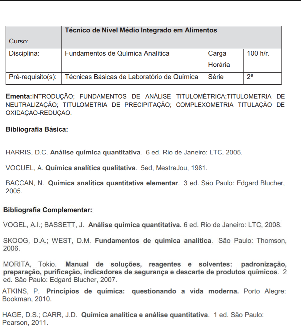 IFS FUNDAMENTOS DE QUÍMICA ANALÍTICA Profa. Conceição Barreto 1 Horário: Quinta-feira, 08:50 às 11:45 hrs. Teoria: Sala 27 J; Prática: Laboratório 35 E. 3. Avaliações A disciplina será avaliada por quatro notas. Cada nota terá contribuição igualitária de avaliações da teoria e da prática. 3.1. Teoria As avaliações da teoria serão realizadas através de provas convencionais sobre os assuntos abordados na sala de aula. As avaliações constarão dos seguintes conteúdos: 3.2. Prática A nota da parte prática será formada pela combinação das seguintes ações: 1. Uma prova teórica sobre as práticas (Valendo 70 % da nota); 2. Freqüência, pontualidade, conduta no laboratório, uso do avental, durante as aulas práticas, etc (valendo 30% da nota da prática); IFS FUNDAMENTOS DE QUÍMICA ANALÍTICA Profa. Conceição Barreto 2 É obrigatório o uso de avental durante as aulas práticas, assim como sapatos fechados e cabelos longos presos. Permite-se um atraso de no máximo 15 minutos. Após o início da prática não será permitida a entrada de alunos retardatários. 3.3. Assuntos das provas Bimestre Teoria Prática Primeiro Estatística aplicada à Quim. Anal. Concentrações das soluções Segundo Análise Volumétrica e Volumetria de Neutralização Práticas sobre volumetria de Neutralização Terceiro Volumetria de Precipitação e Volumetria de Complexação Práticas sobre Volumetria de Precipitação e Volumetria de Complexação Quarto Volumetria de Oxidação-redução Práticas sobre Volumetria de Oxidação-redução 4. Recomendação Cada aluno deve possuir uma calculadora científica, especialmente durante as avaliações. IFS FUNDAMENTOS DE QUÍMICA ANALÍTICA Profa. Conceição Barreto 3 PARTE 1. TEORIA IFS FUNDAMENTOS DE QUÍMICA ANALÍTICA Profa. Conceição Barreto 4 Capítulo 1. INTRODUÇÃO À QUÍMICA ANALÍTICA QUANTITATIVA 1.1. INTRODUÇÃO A Química Analítica envolve a identificação e determinação das quantidades relativas das espécies químicas presentes em uma amostra da matéria. Análise Qualitativa – revela a identidade química das espécies na amostra. Responde à pergunta (O que ?). Análise Quantitativa – estabelece a quantidade de uma ou mais destas espécies, ou analitos, em termos numéricos Responde à pergunta (Quanto?). 1.2. O PAPEL DA QUÍMICA ANALÍTICA NAS CIÊNCIAS A química analítica é uma ciência antiga. Tem aplicações na indústria (controle de qualidade das matérias-primas e do produto final, estabelecer a composição de novos produtos); medicina (diagnóstico de doenças e controle da saúde das pessoas); ecologia (controle da poluição ambiental) e outras ciências. 1.3. CLASSIFICAÇÃO DOS MÉTODOS DE ANÁLISE QUANTITATIVA Os resultados de uma análise quantitativa são calculados a partir de duas medidas: a primeira é a massa ou volume da amostra a ser analisada e a segunda é a medida de alguma quantidade que é proporcional à quantidade do analito na amostra. Vários parâmetros podem ser utilizados na classificação de um método analítico: 1.3.1. quantidade da amostra tomada para análise: Macroanálise – amostras pesam 0,1 g ou mais. Microanálise – amostras pesam entre 1 mg e 10 mg (0,001 – 0,010 g) Mesoanálise (Semimicroanálise) – amostras pesam entre micro e macro (0,01 – 0,1 g). Submicroanálise – amostras entre 0,1 – 1 mg. Ultramicroanálise – amostras pesam menos que 0,1 mg. 1.3.2. Tipo de medida final. Método Gravimétrico – método em que a determinação final é a medida exata do peso do analito ou algum composto quimicamente relacionado a ele. Método Volumétrico – método em que a determinação final é a medida do volume de uma solução que contém um reagente que vai interagir completamente com o analito Métodos Físico-químicos – métodos baseados na medida de alguma propriedade física ou química. Esses métodos necessitam de instrumentos especiais para fazer a medida e são conhecidos como métodos instrumentais. 1.3.3. Cronologia (Tempo): Métodos Clássicos – são os métodos de análise mais antigos. Compreende os métodos graviméticos e volumétricos. Métodos Modernos – são os métodos físico- químicos. “O bom químico de análises deve sempre apreciar a importância de desenvolver suas habilidades através da prática dos métodos clássicos para melhorar a qualidade dos procedimentos instrumentais” (Vogel) 1.4. ETAPAS DE UMA ANÁLISE QUANTITATIVA O processo total de análise consiste de 6 etapas. 1. DEFINIÇÃO, 2. AMOSTRAGEM, 3. MÉTODO, 4. SEPARAÇÃO, 5.QUANTIFICAÇÃO, 6. AVALIAÇÃO. 1.4.1. DEFINIÇÃO No curso de Técnicas de Química Analítica vocês trabalharão com amostras puras, mas as amostras reais são muito mais complexas. 1.4.2. AMOSTRAGEM É a obtenção de uma pequena quantidade do material cuja composição represente exatamente o todo do material que está sendo amostrado (Escolha de amostra representativa). Outro aspecto importante é a forma de transporte da amostra do campo para o laboratório sem alterações. 1.4.3. MÉTODO O químico deve conhecer todos os métodos disponíveis e só então decidir qual o mais adequado para o seu problema. É necessário pois fazer uma pesquisa bibliográfica. Na escolha do método analítico é necessário levar em conta os seguintes aspectos. Exatidão Limite de Detecção – é a quantidade mínima do analito que pode ser detectada. Seletividade – leva em consideração as interferências de outras espécies químicas na sua análise. Esta interferência pode ser para mais (causando erro positivo), ou para menos (causando erro negativo). 1.4.4. SEPARAÇÃO OU MASCARAMENTO Quando o método não é muito seletivo deve-se incluir uma etapa de separação de interferentes. 1.4.5. MEDIDA Medida de uma quantidade ou sinal relacionado com o analito. 1.4.6. TRATAMENTO DOS DADOS Cálculo e avaliação estatística do resultado. IFS FUNDAMENTOS DE QUÍMICA ANALÍT