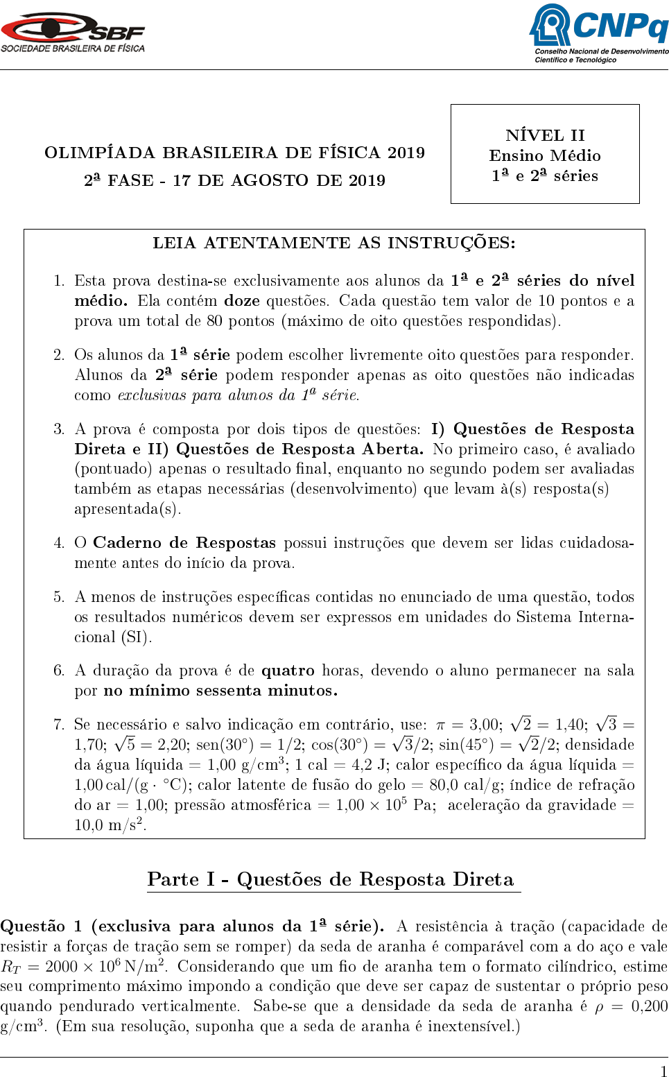 OLIMPÍADA BRASILEIRA DE FÍSICA 2019 2ª FASE - 17 DE AGOSTO DE 2019 NÍVEL II Ensino Médio 1ª e 2ª séries LEIA ATENTAMENTE AS INSTRUÇÕES: 1. Esta prova destina-se exclusivamente aos alunos da 1ª e 2ª séries do nível médio. Ela contém doze questões. Cada questão tem valor de 10 pontos e a prova um total de 80 pontos (máximo de oito questões respondidas). 2. Os alunos da 1ª série podem escolher livremente oito questões para responder. Alunos da 2ª série podem responder apenas as oito questões não indicadas como exclusivas para alunos da 1ª série. 3. A prova é composta por dois tipos de questões: I) Questões de Resposta Direta e II) Questões de Resposta Aberta. No primeiro caso, é avaliado (pontuado) apenas o resultado �nal, enquanto no segundo podem ser avaliadas também as etapas necessárias (desenvolvimento) que levam à(s) resposta(s) apresentada(s). 4. O Caderno de Respostas possui instruções que devem ser lidas cuidadosa- mente antes do início da prova. 5. A menos de instruções especí�cas contidas no enunciado de uma questão, todos os resultados numéricos devem ser expressos em unidades do Sistema Interna- cional (SI). 6. A duração da prova é de quatro horas, devendo o aluno permanecer na sala por no mínimo sessenta minutos. 7. Se necessário e salvo indicação em contrário, use: π = 3,00; √ 2 = 1,40; √ 3 = 1,70; √ 5 = 2,20; sen(30◦) = 1/2; cos(30◦) = √ 3/2; sin(45◦) = √ 2/2; densidade da água líquida = 1,00 g/cm3; 1 cal = 4,2 J; calor especí�co da água líquida = 1,00 cal/(g · ◦C); calor latente de fusão do gelo = 80,0 cal/g; índice de refração do ar = 1,00; pressão atmosférica = 1,00× 105 Pa; aceleração da gravidade = 10,0 m/s2. Parte I - Questões de Resposta Direta Questão 1 (exclusiva para alunos da 1ª série). A resistência à tração (capacidade de resistir a forças de tração sem se romper) da seda de aranha é comparável com a do aço e vale RT = 2000 × 106N/m2. Considerando que um �o de aranha tem o formato cilíndrico, estime seu comprimento máximo impondo a condição que deve ser capaz de sustentar o próprio peso quando pendurado verticalmente. Sabe-se que a densidade da seda de aranha é ρ = 0,200 g/cm3. (Em sua resolução, suponha que a seda de aranha é inextensível.) 1 Questão 2 (exclusiva para alunos da 1ª série). Uma esteira transporta cascalho até uma caçamba de comprimento L = 2,00 m localizada à sua frente. A �gura abaixo, na qual d = 1,50 m e h = 2,50 m, representa esquematicamente a situação de seu funcionamento. Suponha que a esteira se mova com velocidade constante e que o cascalho não rola nem escorrega sobre ela. Desconsiderando as dimensões do cascalho e o efeito resistivo do ar, determine o intervalo de velocidades no qual a esteira pode operar sem que o cascalho caia fora da caçamba. Questão 3. Para algumas situações especí�cas, é necessário que equipamentos eletrônicos funcionem adequadamente mesmo quando submetidos a acelerações extremas de até 8 g, onde g é a aceleração da gravidade. Uma forma de testar esses equipamentos é através de uma plataforma oscilante. O teste é realizado �xando o equipamento à plataforma e posto a oscilar. Se a amplitude de oscilação da plataforma é ajustada para 2,00 cm, qual deve ser o ajuste de sua frequência de oscilação para que o equipamento seja testado dentro do intervalo de acelerações requerido? Questão 4. Um avião ultraleve tem uma massa total (com o piloto) de 500 kg e uma velocidade de estol, velocidade mínima do avião para se sustentar no ar, igual a V = 24,0 m/s. Considere que, sob as superfícies inferiores de suas asas, o ar escoa com velocidade 25% menor que V e, sobre as superfícies superiores das asas, o ar escoa com uma velocidade 25% maior que V . Estime a área total das asas do avião, sabendo que a densidade do ar é 1,20 kg/m3. Questão 5. A �gura abaixo mostra um tubo utilizado para medir a velocidade do som em gases. O interior do tubo é preenchido com gás hidrogênio a temperatura de 25 ◦C e um pó muito �no e pouco denso. A extremidade direita do tubo possui um pistão móvel, e a extremidade esquerda possui um alto-falante que emite na frequência de 1000 Hz. Ajustando o comprimento do tubo por meio do pistão móvel até que ele entre em ressonância com a frequência do alto- falante, observa-se a formação de pequenos montes de pó, sendo que o espaçamento médio entre os picos desses montes é d = 63,5 cm. Nessas condições, qual é a velocidade do som no gás hidrogênio? 2 Questão 6. Uma bolha de ar de 10,0 cm3 escapa de um navio naufragado a 50,0 m de profundidade, onde a temperatura é 15,0 ◦C, e emerge até a superfície onde a temperatura é 25,0 ◦C. Considere que o ar se comporta como um gás ideal e, à medida que se desloca, o ar da bolha se equilibra termicamente com a água ao redor. Determine o volume da bolha ao chegar à superfície. Parte II - Questões de Resposta Aberta Questão 7 (exclusiva para alunos da 1ª série). Uma carga de m = 5,00 kg pode deslizar na superfície lisa, sem atrito, de um plano inclinado de θ = 30,0◦. A carga está presa por uma corda ao centro de uma polia móvel que por sua vez se acopla a uma polia �xa através de outra corda. Essa tem uma de suas extremidades �xas, enquanto a outra é puxada por uma força horizontal constante ~F . Veja �gura abaixo. Assuma que as cordas e polias são ideais e que o sentido positivo da aceleração da caixa aponta para cima ao longo do plano inclinado. Determine a aceleração da caixa quando a intensidade da força horizontal aplicada é F = |~F | = 10,0 N. Questão 8 (exclusiva para alunos da 1ª série). Satélites geoestacionários estão em órbitas tais que, sob o ponto de vista de um observador na Terra, permanecem �xos. Esses satélites são principalmente utilizados por redes de comunicação que atendem a uma região �xa da Terra.