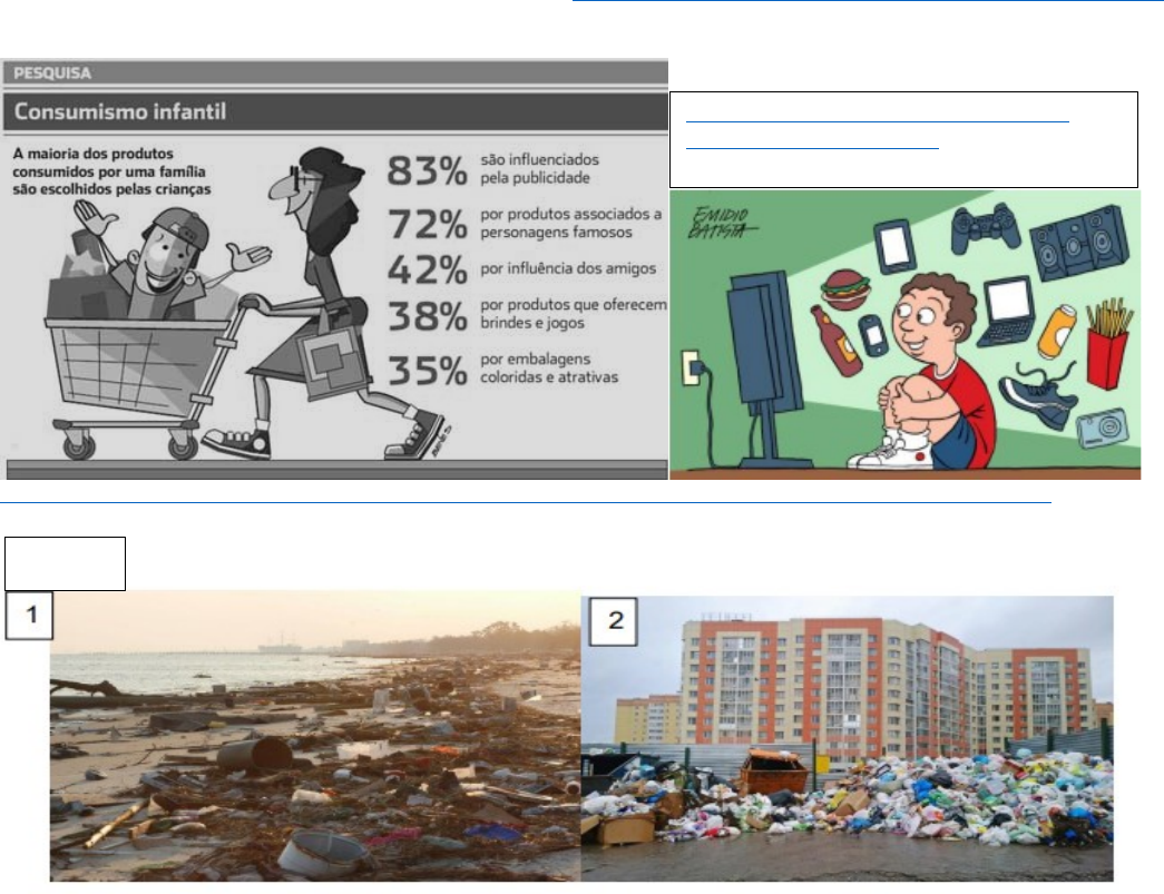 EMEF CALDAS JUNIOR CIÊNCIAS DA NATUREZA – PROFESSORA VANIA MENEGOLLA – 6º/7º ANO LIXO E CONSUMISMO O lixo é um problema gritante que a sociedade vem enfrentando! Cada vez mais, vem aumentando a quantidade de lixo em todo lugar, e quem paga por isso somos nós, seres humanos e o ambiente como um todo. Atualmente o lixo doméstico é um dos principais responsáveis pela poluição ambiental. As embalagens são frequentemente encontradas nas ruas, parques, rios e praias, poluindo o ambiente, entupindo bueiros, provocando enchentes, favorecendo a proliferação de doenças e ameaçando a vida de pessoas e animais. E o que faremos para contribuir com a diminuição da produção diária de lixo doméstico? Um bom início é o consumo consciente! Leia as informações sobre consumo e consumismo: Consumo é quando a gente compra as coisas que nós realmente precisamos, nem mais, nem menos, mas na quantidade necessária. Consumismo é quando nós exageramos no consumo, comprando tudo que queremos sem realmente precisar e sem pensar antes de comprar. A publicidade colabora muito para o consumismo, principalmente entre as crianças. https://www.pmav.es.gov.br/uploads/files/5-ano-24-a-28-de-agosto.pdf Figura 1 http://revistaprimicias.blogspot.com/2017/04/mentalidade-de-consumo.html Figura 2 https://www.folhavitoria.com.br/geral/blogs/educacaoeempreendedorismo/2013/05/04/consumismo-infantil-palestra-gratuita/ Figura 3 PLANO DE AULA DE SUBSTITUIÇÃO – CIÊNCIAS DA NATUREZA 6º E 7º ANO 1) Imprimir uma cópia do texto para cada estudante. 2) Realizar leitura silenciosa individual e leitura em voz alta. 3) Colar o texto no caderno. 4) Passar as questões no quadro, conforme o tempo disponível. 1) Com base nas informações da Figura 1 e em seus conhecimentos sobre o assunto, responda: a) O que é consumo? b) Por que precisamos consumir? c)Temos a necessidade de estar sempre consumindo? d) Quais as consequências do consumo exagerado? e) O que pode ser feito para conscientizar as pessoas sobre esse exagero? 2) A partir do que você está vendo na Figura 2 e de seus conhecimentos, responda: a) O que você acha que o menino está vendo na TV? b) As propagandas estão falando sobre quais produtos? c) Pela expressão do menino, você considera que qual poderá ser a reação dele quando seus pais ou responsáveis chegarem em casa? d) E você, que tipo de propagandas te atrai na televisão? Você considera que tudo o que vê e gosta é necessário para seu consumo? Justifique. e) Você acha que quanto mais, melhor? Justifique. f) Para você, querer é poder no mundo do consumo? g) O que você gostaria de mudar nas suas atitudes quanto ao consumo? h) Quais seriam as vantagens de brincar com poucos brinquedos? 3) Com base nas imagens da Figura 3, responda. a) Que locais são esses das imagens? b) De que forma os resíduos foram descartados em cada um deles? Foram descartados de forma adequada? c) Em quais dessas imagens os resíduos podem ser foco de transmissão de doenças? Por quê? d) Qual é a forma mais adequada de descartar os resíduos das nossas casas? 4)Escreva e desenhe como você pode reutilizar três itens de lixo seletivo. EMEF CALDAS JUNIOR CIÊNCIAS DA NATUREZA – 9º ANO EFEITO ESTUFA E AQUECIMENTO GLOBAL Fonte: História das cavernas ao terceiro milênio. Pg. 249 a 254. PLANO DE AULA DE SUBSTITUIÇÃO – 9º ANO CIÊNCIAS DA NATUREZA – PROFESSORA VANIA MENEGOLLA 1) Imprimir uma cópia do texto para cada estudante. 2) Realizar leitura silenciosa individual e leitura em voz alta. 3) Colar o texto no caderno. 4) Passar as questões no quadro, conforme o tempo disponível. 1) Com base na leitura dos textos, responda: a) O efeito estufa é um vilão ou é benéfico? Explique. b) Quais tipos de produção de energia não agridem o ambiente? c) Quais os efeitos indesejáveis para o ambiente decorrentes dos processos de obtenção de energia? d) Como a sociedade contribui para o aquecimento global? e) Que atitudes você pode tomar para ajudar a manter os recursos do planeta e diminuir o aquecimento global? f) Quais os gases responsáveis pelo aumento do efeito estufa? g) Qual é a relação entre efeito estufa e aquecimento global? h) Qual é a sua opinião sobre o vegetarianismo e o veganismo? Você considera que essas formas de alimentação ajudam na diminuição do aquecimento global? i) Quais são os combustíveis fósseis? Por que eles recebem esse nome? j) O segundo texto fala que a impermeabilização do solo, contribui para as alterações climáticas. No que consiste a impermeabilização do solo? 2) Observe com atenção a charge dos pinguins e explique como você compreendeu a ideia do autor. 3) Faça a leitura da charge da bandeira do Brasil e responda: a) A bandeira nacional é um símbolo cujas cores representam nossas riquezas. Segundo a CHARGE, pode-se dizer que estamos perdendo uma das mais importantes riquezas. Qual? b) No centro da questão, apontada pela CHARGE, temos o desmatamento. O caminhão, carregando a madeira retirada, segue por uma estrada e sai da margem. O que isso significa? Que crítica está sendo feita a partir do desenho? c) Qual é a relação entre a CHARGE e a expressão “a Terra tem febre”? image3.png image4.png image5.png image6.png image7.png image8.png image9.png image1.jpeg image2.png