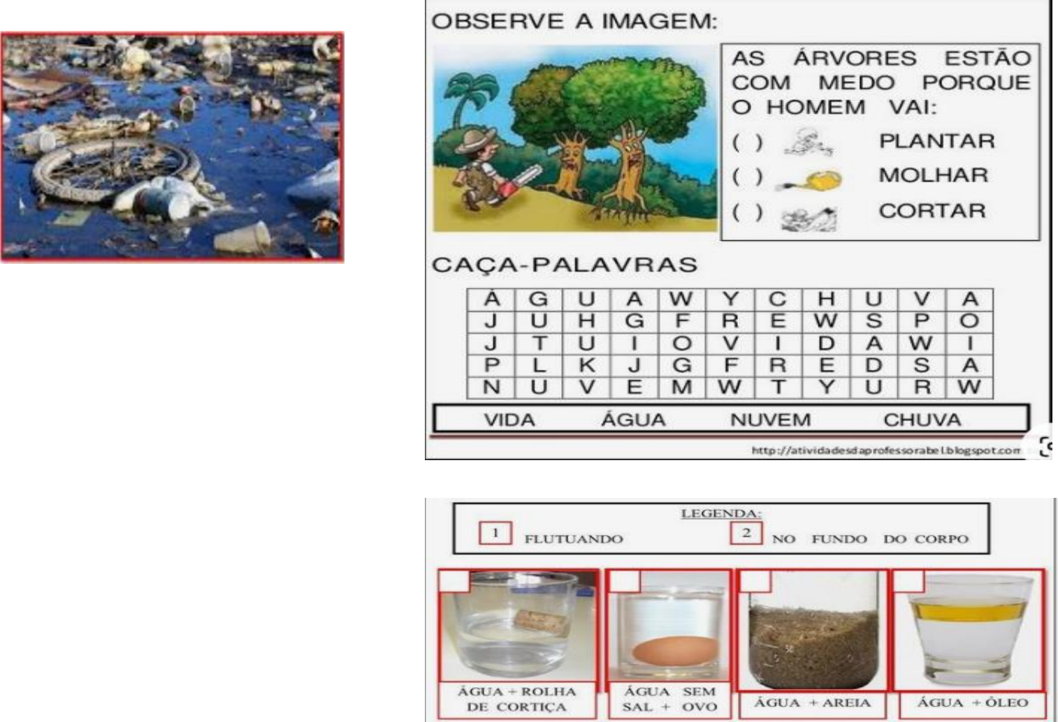 OBSERVE COMO ESTÁ O RIO DA FIGURA ABAIXO: A)QUAIS SÃO OS LIXOS QUE ESTÃO DENTRO DO RIO? ( ) RODA DE BICICLETA ( ) BOLAS ( ) LATAS ( ) GARRAFAS ( ) CACHORROS ( ) SACOS ( ) MADEIRAS ( ) CADEIRAS B)VOCÊ ACHA QUE ESTA ÁGUA DO RIO É: ( ) BOA PARA BEBER. ( ) CONTAMINADA, NÃO SERVE PARA BEBER. C)A ÁGUA PARA BEBER DEVE SER: ( ) ÁGUA SALGADA E BARRENTA. ( ) ÁGUA TRANSPARENTE E SEM CHEIRO. D)QUAL É O LÍQUIDO MAIS SAUDÁVEL PARA BEBER: ( ) REFRIGERANTE ( ) ÁGUA POTÁVEL E)QUAL ÁGUA VOCÊ PREFERE BEBER: ( ) ÁGUA COM GÁS ( ) ÁGUA SEM GÁS F) CLASSIFIQUE COMO FICAM OS MATERIAIS MISTURADOS CONFORME A LEGENDA: