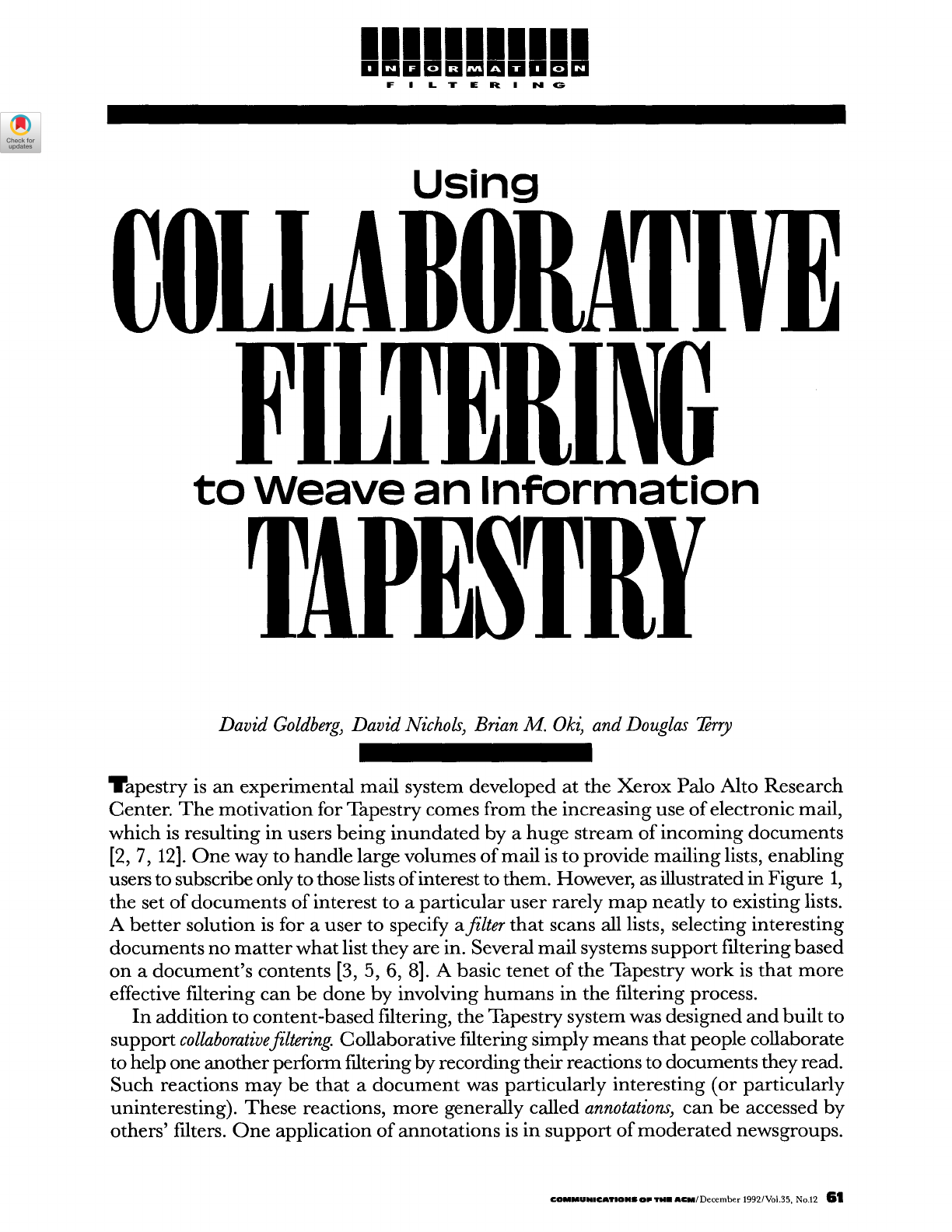 In addition to content-based filtering, the Tapestry system was designed and built to