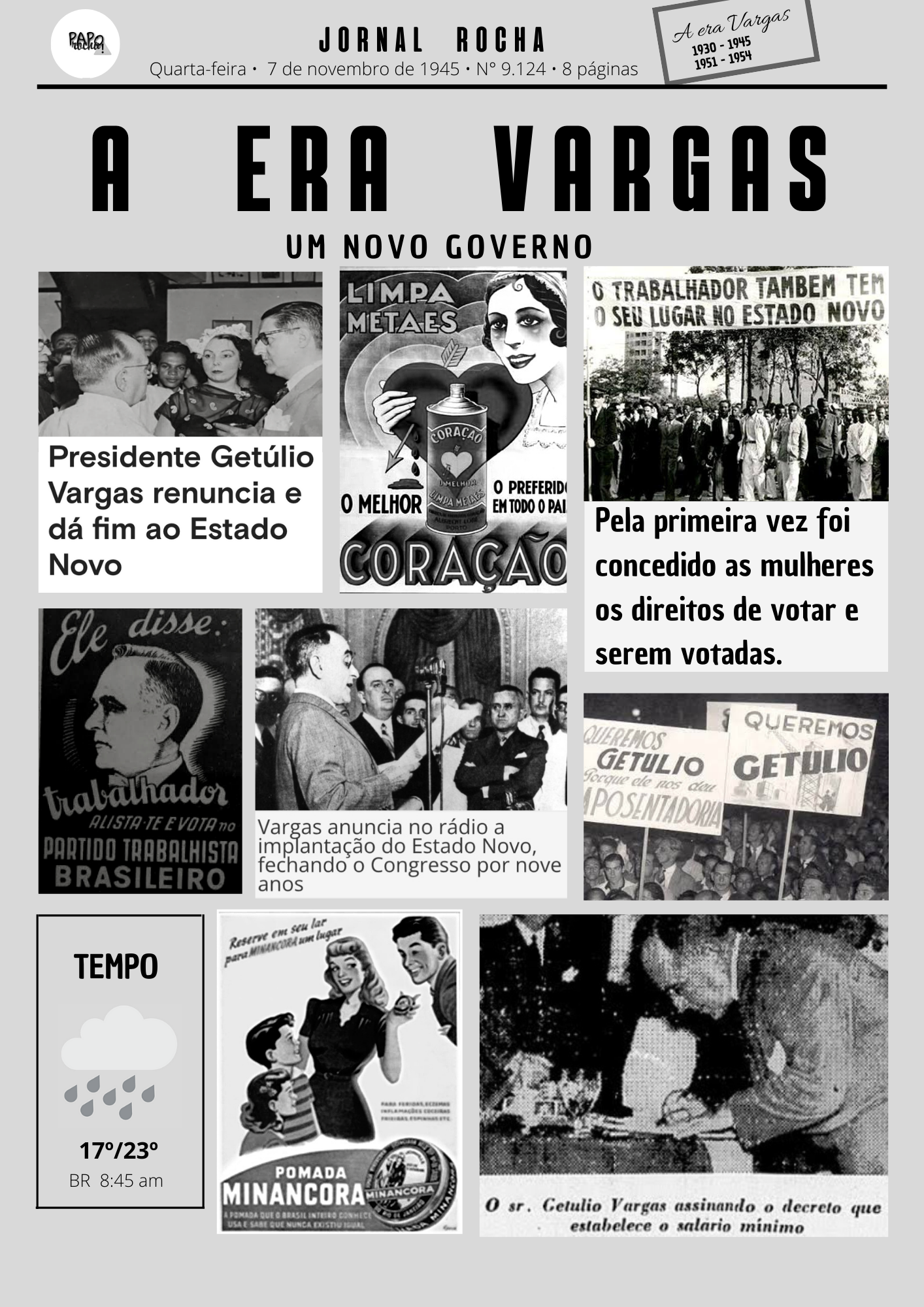 PAPO JORNAL ROCHA A era Quarta-feira 7 de novembro de 1945 N° 9.124.8 páginas A ERA VARGAS UM NOVO GOVERNO LIMPA 0 TRABALHADOR TAMBEM TEM METAES 0 SEU LUGAR NO ESTADO NOVO CORACAO Presidente Getúlio Vargas renuncia e 0 PREFERIDO 0 MELHOR EM TODO 0 PAI dá fim ao Estado Pela primeira vez foi Novo CORACAO concedido as mulheres os direitos de votar e Ele serem votadas. QUEREMOS GETULIO trabalhador Torque ele deu GETULIO ALISTA TE E VOTA no Vargas anuncia no rádio a PARTIDO TRABALHISTA implantação do Estado Novo, BRASILEIRO fechando o Congresso por nove anos Reserve em seu lar TEMPO para POMADA BR 8:45 am MINANCORA MINANCORA o sr. Vargas assinando o decreto que POMADA BRASIL NUNCA estabelece salario