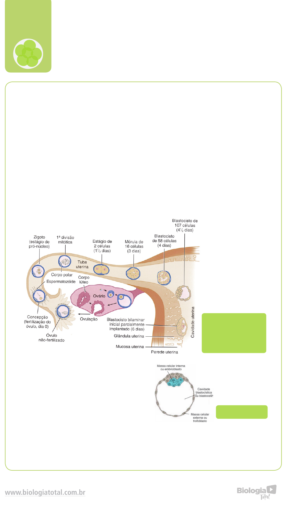 www.biologiatotal.com.br CLIVAGEM E INÍCIO DA IMPLANTAÇÃO RESUMO DA AULA CLIVAGEM • Cerca de 30 horas após a fertilização, a 1ª divisão mitótica do zigoto se completa e as duas primeiras células filhas são formadas. • A partir do estágio de duas células, o zigoto passará por sucessivas divisões mitóticas que irão aumentar o número de células, em um processo chamado de clivagem ou segmentação. • Na clivagem, as células tornam-se menores a cada divisão, visto que essas divisões não são acompanhadas por crescimento celular. Essas células resultantes do processo de clivagem são chamadas de blastômeros. • 3 dias após a fertilização, o zigoto chega ao estágio de 16 a 32 blastômeros, e passa a ser chamado de mórula. • Quando a mórula penetra na cavidade uterina, ocorre a formação do blastocisto. Sequência de eventos pré- implantação: Fertilização, clivagem e formação do blastocisto. Com 6 dias o blastocisto está parcialmente implantado no endométrio. • O blastocisto é constituído por 3 camadas: trofoblasto, embrioblasto e uma cavidade blastocística. O embrioblasto dá origem ao embrião, enquanto o trofoblasto será responsável pela formação do córion (parte fetal da placenta). Representação da estrutura do blastocisto. IMPLANTAÇÃO • Tem início no final da 1ª semana, mas só irá se concluir na 2ª semana de desenvolvimento. • O blastocisto se adere ao endométrio e, posteriormente, se implanta nele. Cerca de 75% das gestações que não prosseguem devem-se a falhas no processo de implantação. www.biologiatotal.com.br Rompimento da zona pelúcida • A zona pelúcida previne a implantação do blastocisto fora do local adequado. • Quando ela se rompe, o blastocisto maduro torna-se apto a iniciar o processo de implantação. • Nesta fase, o útero está preparado para receber o concepto. • Entre o 5° e 7° dia após a fertilização, o blastocisto se adere ao epitélio endometrial. A parte superior da figura traz a representação do ciclo menstrual. Na implantação, o útero encontra-se na fase secretora ou progestacional (C). Em (D) está indicado o período de máxima receptividade. Abaixo o sítio normal de implantação está indicado pela cor verde. (A) Fase menstrual | (B) Fase proliferativa | (C) Fase secretora | (D) Janela de implantação – Período de máxima receptividade | (1) Cavidade uterina | (2) Istmo da tuba uterina | (3) Tuba uterina | (4) Cérvice uterina • Implantação ectópica: quando o blastocisto implanta-se fora do sítio normal, como nas tubas uterinas, ovários, cavidade abdominal, entre outros locais. Nessas circunstâncias, normalmente, o desenvolvimento não prossegue. Além disso, podem ocorrer consequências graves à saúde materna. Adesão do blastocisto e diferenciação do trofoblasto • Alguns fatores são fundamentais para adesão do blastocisto, tais como microvilosidades das células endometriais, moléculas celulares de adesão, citocinas, prostaglandinas, genes homebox, fatores de crescimento e metaloproteinases de matriz. • Desprovido da zona pelúcida, o blastocisto já pode interagir com o epitélio endometrial diretamente. Quando essa adesão acontece, o trofoblasto diferencia-se em duas camadas: citotrofoblasto e sinciciotrofoblasto. Início da implantação do blastocisto. • O citotrofoblasto é formado por células em alta atividade mitótica que se dividem e migram para formar a massa crescente de sinciciotrofoblasto. Quando chegam ao sinciciotrofoblasto, essas células se fundem e perdem o envoltório celular, formando uma massa celular multinucleada (sincicio). www.biologiatotal.com.br • O sinciciotrofoblasto produz enzimas líticas e fatores que causam apoptose em células do epitélio endometrial no local da adesão. Com isso, o sinciciotrofoblasto consegue penetrar no estroma endometrial, erodindo também a parede dos capilares sanguíneos endometriais. O sinciciotrofoblasto também é responsável pela produção da gonadotrofina coriônica humana (hCG). • Ao final da primeira semana (7° dia), o blastocisto encontra-se superficialmente implantado. Embrioblasto reorganiza-se em epiblasto e hipoblasto • Até o final da primeira semana (7° dia), além da diferenciação do trofoblasto, inicia-se também a diferenciação do embrioblasto em epiblasto e hipoblasto. Sequência mostrando a implantação nos dias 7, 8 e 9. Observe a expansão do sinciciotrofoblasto.