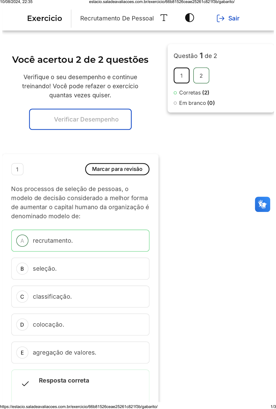 Você acertou 2 de 2 questões Verifique o seu desempenho e continue treinando! Você pode refazer o exercício quantas vezes quiser. Verificar Desempenho A B C D E 1 Marcar para revisão Nos processos de seleção de pessoas, o modelo de decisão considerado a melhor forma de aumentar o capital humano da organização é denominado modelo de: recrutamento. seleção. classificação. colocação. agregação de valores. Resposta correta Questão 1 de 2 Corretas �2� Em branco �0� 1 2 Exercicio Recrutamento De Pessoal Sair 10/08/2024, 22:35 estacio.saladeavaliacoes.com.br/exercicio/66b81526ceae25261c821f3b/gabarito/ https://estacio.saladeavaliacoes.com.br/exercicio/66b81526ceae25261c821f3b/gabarito/ 1/3 A B Parabéns, você selecionou a alternativa correta. Confira o gabarito comentado! Gabarito Comentado O modelo de decisão considerado a melhor forma de aumentar o capital humano da organização é o modelo de recrutamento, pois é o processo que busca atrair candidatos para a empresa. 2 Marcar para revisão Luiz está acompanhando certo gerente para avaliação de possíveis fontes de recrutamento para a empresa. A empresa cresceu nos últimos anos e o volume de trabalho alcançou o máximo da capacidade produtiva e de atendimento que a atual estrutura suporta. Esse gerente está pensando em anunciar as novas vagas de emprego em jornal, agência especializada em recrutamento e também na internet, em sites e redes sociais. Desse modo, é correto afirmar que Luiz está auxiliando o gerente a selecionar meios e canais de comunicação para: Divulgar os novos serviços da empresa. Encontrar novos fornecedores de materiais e produtos. 10/08/2024, 22:35 estacio.saladeavaliacoes.com.br/exercicio/66b81526ceae25261c821f3b/gabarito/ https://estacio.saladeavaliacoes.com.br/exercicio/66b81526ceae25261c821f3b/gabarito/ 2/3 C D E Atrair candidatos para a nova realidade da empresa e novas vagas de emprego. Selecionar as mídias de maior alcance e de valor mais acessível para a criação do site da empresa. Buscar novos clientes para a empresa. Resposta correta Parabéns, você selecionou a alternativa correta. Confira o gabarito comentado! Gabarito Comentado A resposta correta é: Atrair candidatos para a nova realidade da empresa e novas vagas de emprego. A empresa está crescendo e precisa de mais funcionários. O gerente está pensando em anunciar as novas vagas de emprego em jornal, agência especializada em recrutamento e também na internet, em sites e redes sociais. Luiz está auxiliando o gerente a selecionar meios e canais de comunicação para atrair candidatos para a nova realidade da empresa e novas vagas de emprego. 10/08/2024, 22:35 estacio.saladeavaliacoes.com.br/exercicio/66b81526ceae25261c821f3b/gabarito/ https://estacio.saladeavaliacoes.com.br/exercicio/66b81526ceae25261c821f3b/gabarito/ 3/3