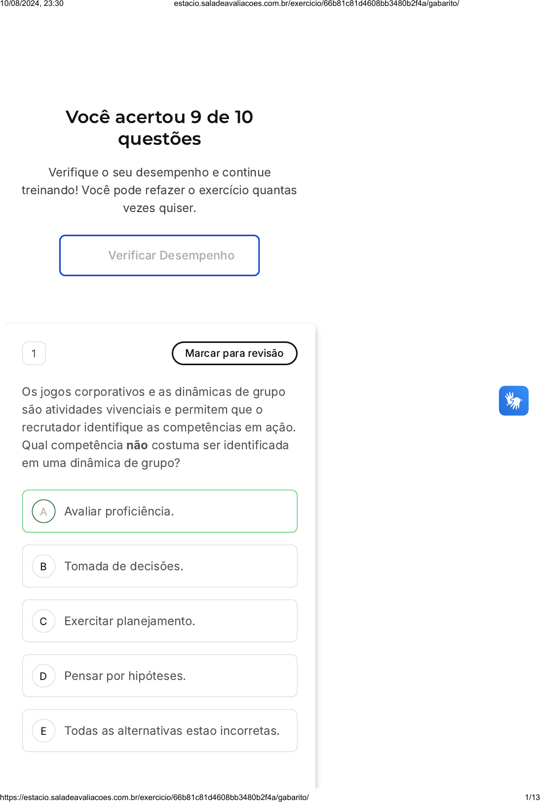 Você acertou 9 de 10 questões Verifique o seu desempenho e continue treinando! Você pode refazer o exercício quantas vezes quiser. Verificar Desempenho A B C D E 1 Marcar para revisão Os jogos corporativos e as dinâmicas de grupo são atividades vivenciais e permitem que o recrutador identifique as competências em ação. Qual competência não costuma ser identificada em uma dinâmica de grupo? Avaliar proficiência. Tomada de decisões. Exercitar planejamento. Pensar por hipóteses. Todas as alternativas estao incorretas. 10/08/2024, 23:30 estacio.saladeavaliacoes.com.br/exercicio/66b81c81d4608bb3480b2f4a/gabarito/ https://estacio.saladeavaliacoes.com.br/exercicio/66b81c81d4608bb3480b2f4a/gabarito/ 1/13 A B Resposta correta Parabéns, você selecionou a alternativa correta. Confira o gabarito comentado! Gabarito Comentado A resposta correta é: Avaliar proficiência. Avaliar proficiência é uma competência que não é identificada em uma dinâmica de grupo, pois essa competência é avaliada em uma entrevista individual, onde o recrutador pode observar o candidato em ação. As outras competências são identificadas em uma dinâmica de grupo, pois são competências que podem ser desenvolvidas e aprimoradas por meio da interação com outras pessoas. Portanto, a resposta correta é: Avaliar proficiência. ----- 2 Marcar para revisão O recrutador precisa ficar atento para não ter atitudes inadequadas durante uma entrevista. Que tipo de atitude o recrutador pode tomar com o candidato sem correr o risco de ser inapropriado? Apressar o candidato para terminar a entrevista no prazo. Definir como conduzirá a entrevista. 10/08/2024, 23:30 estacio.saladeavaliacoes.com.br/exercicio/66b81c81d4608bb3480b2f4a/gabarito/ https://estacio.saladeavaliacoes.com.br/exercicio/66b81c81d4608bb3480b2f4a/gabarito/ 2/13 C D E Fazer comentários negativos sobre a empresa. Fazer perguntas de cunho pessoal. Todas as alternativas estão incorretas. Resposta correta Parabéns, você selecionou a alternativa correta. Confira o gabarito comentado! Gabarito Comentado A alternativa correta é a que afirma que o recrutador pode definir como conduzirá a entrevista. Isso é apropriado porque permite que o recrutador estabeleça as expectativas e o fluxo da entrevista, garantindo que o candidato saiba o que esperar. As outras alternativas sugerem comportamentos que podem ser considerados inadequados ou desrespeitosos, como apressar o candidato, fazer comentários negativos sobre a empresa ou fazer perguntas de cunho pessoal. 3 Marcar para revisão As ferramentas que podem ser utilizadas no processo seletivo tem com o objetivo de avaliar os candidatos e selecionar os perfis mais indicados para determinado cargo/função. São ferramentas utilizadas durante o processo seletivo de seleção de pessoal, exceto: 10/08/2024, 23:30 estacio.saladeavaliacoes.com.br/exercicio/66b81c81d4608bb3480b2f4a/gabarito/ https://estacio.saladeavaliacoes.com.br/exercicio/66b81c81d4608bb3480b2f4a/gabarito/ 3/13 A B C D E Simulações / cases. Entrevista comportamental. Dinâmicas de grupo. Debate eleitoral. Testes psicológicos. Resposta correta Parabéns, você selecionou a alternativa correta. Confira o gabarito comentado! Gabarito Comentado Diversas ferramentas podem ser utilizadas para avaliar um candidato durante uma seleção, entre elas: Entrevistas técnicas e comportamentais Testes técnicos e psicológicos Apresentação de cases Simulações e dinâmicas de grupos O debate eleitoral não é uma ferramenta utilizada para avaliar um candidato durante uma seleção, pois não é uma ferramenta que avalia as competências técnicas e comportamentais do candidato. 4 Marcar para revisão �Adaptado de FCC 2014� Leia o texto: Questão 5 de 10 Corretas �9� Incorretas �1� Em branco �0� 1 2 3 4 5 6 7 8 9 10 Exercicio Selecao De Pessoal Sair 10/08/2024, 23:30 estacio.saladeavaliacoes.com.br/exercicio/66b81c81d4608bb3480b2f4a/gabarito/ https://estacio.saladeavaliacoes.com.br/exercicio/66b81c81d4608bb3480b2f4a/gabarito/ 4/13 A B C D E As ferramentas de recrutamento e seleção agilizam todo o processo de contratação de um candidato, além de fazer toda a gestão do processo seletivo online através de um software ATS completo para apoiar os profissionais de RH que desejam ter mais autonomia e agilidade em todas as etapas de contratação. Disponível em https://forbusiness.vagas.com.br/blog/melhores- ferramentas-de-recrutamento-e-selecao/. Uma ferramenta para perceber as necessidades do cliente é o rapport, que significa: Gerar confiança no cliente para poder opinar com maior segurança no momento em que o cliente necessitar de apoio. Vender uma boa imagem da organização. Entrar no mundo do cliente e fazer com que ele perceba que está sendo compreendido. Receber o cliente bem e sempre com um café à mesa. Facilitar todo o processo de atendimento. Resposta correta Parabéns, você selecionou a alternativa correta. Confira o gabarito comentado! Gabarito Comentado 10/08/2024, 23:30 estacio.saladeavaliacoes.com.br/exercicio/66b81c81d4608bb3480b2f4a/gabarito/ https://estacio.saladeavaliacoes.com.br/exercicio/66b81c81d4608bb3480b2f4a/gabarito/ 5/13 O termo rapport é um conceito oriundo da psicologia, que se refere a uma técnica utilizada para estabelecer uma conexão de sintonia e empatia com outra pessoa. A palavra tem origem no termo francês rapporter, que significa "trazer de volta". O rapport acontece quando há uma sensação de sincronização entre duas ou mais pessoas, pois elas se relacionam de maneira agradável. Teoricamente, o rapport engloba três componentes comportamentais: atenção mútua, positividade mútua e coordenação. Para amenizar os desconfortos causados pelo estresse momentâneo, é crucial que o recrutador estabeleça uma técnica chamada rapport, ou seja, criar um ambiente propício e psicologicamente saudável para a condução da entrevista, deixando o candidato à vontade, visando 