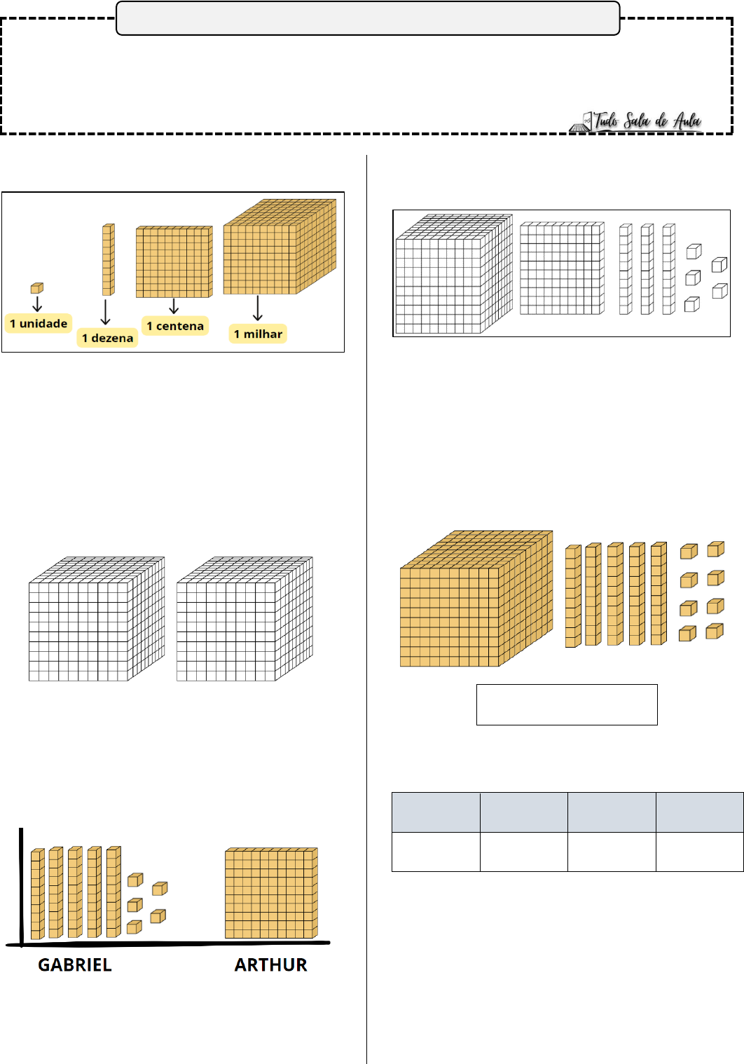 Estudante: __________________________________________________________________ Professor (a): _____________________________________________ Data: ___/___/______ Escola: _________________________________________________ Turma: _____________ 1. Observe o material dourado abaixo. Analise as afirmativas a seguir e classifique em verdadeira (V) ou falsa (F). a) ( ) 1 dezena é igual a 10 unidades. b) ( ) 1 centena é igual a 5 dezenas. c) ( ) 1 centena é igual a 100 unidades. d) ( ) 1 milhar é igual a 10 dezenas. 2. Observe os cubos abaixo. Se cada cubo representa um milhar, quantas centenas possuem nos dois cubos? _______________________________________ 3. Observe a seguir o gráfico do resultado final de um jogo de dominó entre Gabriel e Arthur. Tendo em vista que cada partida vale 5 pontos, se continuassem o jogo, quantas rodadas Gabriel precisaria vencer para empatar com Arthur? _______________________________________ 4. Emanoel representou o valor que tinha guardado em material dourado. Veja a seguir. Quanto Emanoel tem guardado? a) R$ 1.315,00. b) R$ 1.135,00. c) R$ 1.131,00. d) R$ 1.115,00. 5. Anote a representação do material dourado a seguir. De acordo com o número encontrado, preencha a tabela corretamente. UM C D U 6. Eduardo trabalha com estocagens e organiza as caixas em pilhas de 10 unidades. Com renovação de estoque, ele formou 7 pilhas de caixas em um dia. Quantas dezenas de caixas Eduardo organizou nesse dia? a) 7 dezenas. b) 10 dezenas. c) 70 dezenas. d) 100 dezenas. ATIVIDADE DE MATEMÁTICA 7. Observe a seguir as pontuações de 3 amigos que estavam participando de uma gincana que durou dois dias. a) Quem venceu a gincana? _______________________________________ b) Quem obteve a menor pontuação? _______________________________________ 8. Júlio desenhou uma peça de material dourado semelhante à imagem abaixo. Quantas peças iguais ele deve desenhar para obter um milhar de cubinhos? _______________________________________ 9. Observe o quadro com material dourado. Preencha a tabela a seguir com a representação do material dourado. UM C D U 10. Resolva as continhas a seguir. a) b) c)