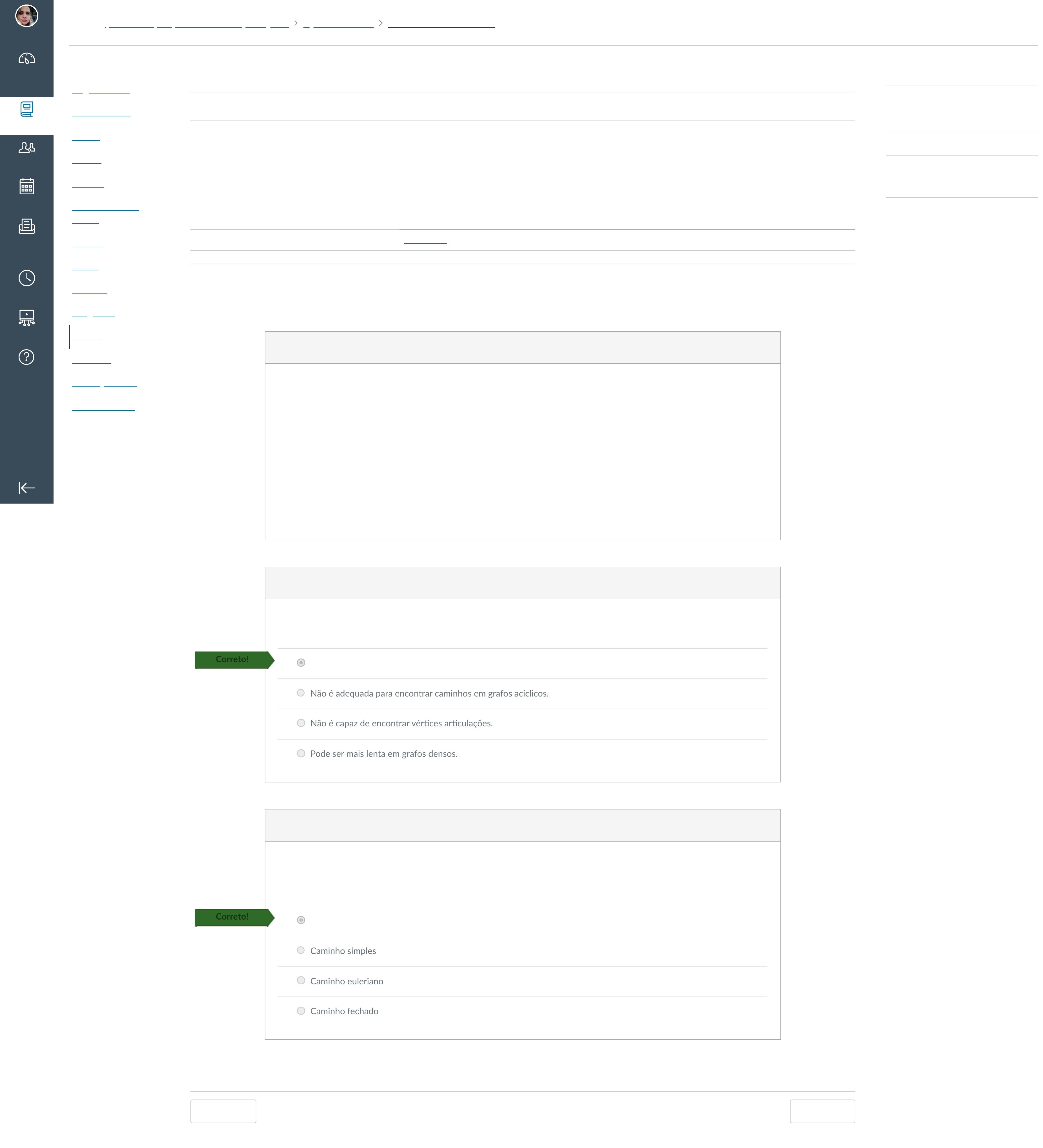(1525101) Tópicos em Computação I Ques�onários Prac�ce Exercise #00 Prac�ce Exercise #00 Entrega 3 set em 23:59 Pontos 5 Perguntas 3 Disponível até 3 set em 23:59 Limite de tempo Nenhum Este teste foi travado 3 set em 23:59. Histórico de tenta�vas Tenta�va Tempo Pontuação MAIS RECENTE Tenta�va 1 5 minutos 5 de 5 Pontuação deste teste: 5 de 5 Enviado 2 set em 13:36 Esta tenta�va levou 5 minutos. 1 / 1 ptsPergunta 1 Sua Resposta: O que é um grafo direcionado e não direcionado? Em um grafo não direcionado, as arestas que a conexão entre dois vér�ces é bidirecional, ou seja, se há uma aresta que liga o vér�ce A ao vér�ce B, então também há uma aresta que liga o vér�ce B ao vér�ce A. Em um grafo direcionado, as arestas têm direção. Isso significa que a conexão entre dois vér�ces é unidirecional, ou seja, se há uma aresta que liga o vér�ce A ao vér�ce B, isso não implica que existe uma aresta que liga o vér�ce B ao vér�ce A. 2 / 2 ptsPergunta 2 Qual é a principal desvantagem da busca em profundidade (DFS)? Pode entrar em loops infinitos em grafos desconexos. Correto!Correto! Não é adequada para encontrar caminhos em grafos acíclicos. Não é capaz de encontrar vér�ces ar�culações. Pode ser mais lenta em grafos densos. 2 / 2 ptsPergunta 3 Em um grafo direcionado, um caminho que percorre uma sequência de vér�ces e arestas, começando e terminando no mesmo vér�ce, é chamado de: Caminho cíclico Correto!Correto! Caminho simples Caminho euleriano Caminho fechado Pontuação do teste: 5 de 5 Anterior Próximo Detalhes do envio: Tempo: 5 minutos Pontuação atual: 5 de 5 Pontuação man�da: 5 de 5 Graduação Presencial Assíncr… Página inicial Atendimento Teams Avisos Tarefas Biblioteca PUC Minas Fóruns Notas Pessoas Programa Testes Módulos Avaliação CPA PUC Carreiras Conta Painel de controle Cursos Grupos Calendário Caixa de entrada Histórico Studio Ajuda https://pucminas.instructure.com/courses/156029 https://pucminas.instructure.com/courses/156029/quizzes https://pucminas.instructure.com/courses/156029/quizzes/421321 https://pucminas.instructure.com/courses/156029/quizzes/421321/history?version=1 https://pucminas.instructure.com/courses/156029/modules/items/3384506 https://pucminas.instructure.com/courses/156029/modules/items/3384514 https://pucminas.instructure.com/courses/156029 https://conteudo.virtual.pucminas.br/canvas/crm/index.php?user_sis_user_id=1078276@sga.pucminas.br&course_sis_course_id=sga_54419_128_2023_2_1525101&course_id=156029 https://teams.microsoft.com/dl/launcher/launcher.html?url=teams&type=meetup-join&enableMobilePage=true&suppressPrompt=true&tenantId=14cbd5a7-ec94-46ba-b314-cc0fc972a161 https://pucminas.instructure.com/courses/156029/announcements https://pucminas.instructure.com/courses/156029/assignments https://conteudo.virtual.pucminas.br/canvas/biblioteca_puc/index.php?user_sis_user_id=1078276@sga.pucminas.br https://pucminas.instructure.com/courses/156029/discussion_topics https://pucminas.instructure.com/courses/156029/grades https://pucminas.instructure.com/courses/156029/users https://pucminas.instructure.com/courses/156029/assignments/syllabus https://pucminas.instructure.com/courses/156029/quizzes https://pucminas.instructure.com/courses/156029/modules https://conteudo.virtual.pucminas.br/canvas/avaliacao_cpa_2018/index.php?user_sis_user_id=1078276@sga.pucminas.br&course_sis_course_id=sga_54419_128_2023_2_1525101 https://carreiras.pucminas.br/ https://pucminas.instructure.com/profile/settings https://pucminas.instructure.com/ https://pucminas.instructure.com/courses https://pucminas.instructure.com/groups https://pucminas.instructure.com/calendar https://pucminas.instructure.com/conversations https://pucminas.instructure.com/accounts/1/external_tools/33?launch_type=global_navigation http://help.instructure.com/