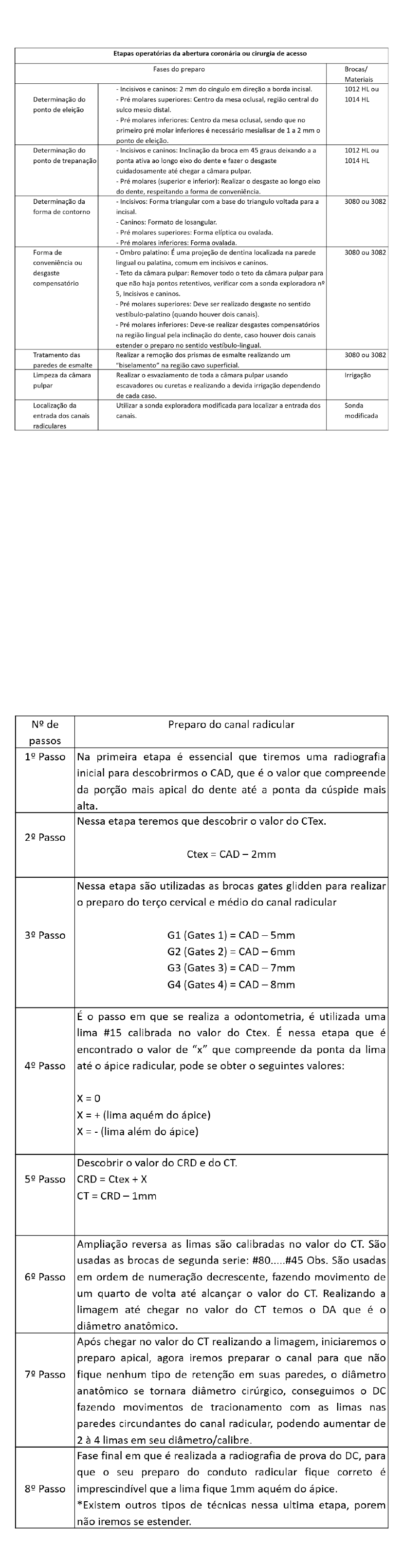 TAGS biopulpectomia diagnóstico endodontia etapa necropulpectomia odonto odontologia resumo técnica Artigo anterior Odontologia do Esporte Próximo artigo Miosite Ossificante Traumática Publicidade Home Endodontia Endodontia Etapas Para o Preparo e Terapia Endodôntica A endodontia é uma especialidade da odontologia voltada para o cuidado e tratamento do endodonto e da região periapical. Para entendermos melhor como a endodontia funciona voltaremos a alguns conceitos de anatomia que serão essenciais para a o entendimento da especialidade. Anatomicamente, o órgão dental é constituído de esmalte, dentina, cemento e em seu interior possui uma câmara, denominada de câmara pulpar nela se encontram nervos e vasos sanguíneos. O que sustentam os dentes em sua posição é o osso alveolar, cemento radicular e ligamento periodontal que fazem parte do periodonto de sustentação. A área de atuação do endodontista é a cavidade pulpar, polpa e dentina que é compreendida pelo endodonto e também é de grande interesse a região periapical que é constituída de cemento, osso, ligamento periodontal e parede alveolar. Etapas para o inicio da realização do tratamento endodôntico Para a realização do tratamento endodôntico, precisamos realizar previamente o correto diagnostico e logo após iniciar o plano de tratamento. Diagnóstico e plano de tratamento Raio-X inicial com posicionador (Medir o CAD) Anestesia e isolamento absoluto do dente a ser tratado Etapas operatórias Nomenclatura CAD: Comprimento aparente do dente; CTex: Comprimento de trabalho de exploração; X: Distância que compreende da ponta do instrumento (lima) até o final do conduto radicular; CRD: Comprimento real do dente; CT: Comprimento de trabalho. CTG: Comprimeto de trabalho das Gates CTes: Comprimento de trabalho de esvaziamento Para a realização do selamento do preparo utilizaremos as seguintes medicações – MIC (medicação intra- canal). Quer aprender mais sobre Endodontia? Clique aqui. Autor: Bruno Gusso. Acadêmico do curso de Odontologia da Universidade Positivo Membro acadêmico do Banco de dentes – FOUP Membro acadêmico da Liga sem Dor Curitiba Paraná Membro acadêmico do Programa de Iniciação Científica da Universidade Positivo Jefferson Oliveira Founder e Editor do Odonto Up. Cirurgião-Dentista Especialista em Implantodontia pela Universidade Positivo. Artigos relacionados SEM COMENTÁRIOS Deixe uma resposta: POSTAR COMENTÁRIO Publicidade SOBRE A ODONTOUP Somos a maior plataforma de conteúdos sobre odontologia do país. Oferecemos uma experiência de estudo personalizada de acordo com a necessidade de cada um. Uma jornada que prioriza a praticidade e acessibiliza o conhecimento. Somos acolhimento e otimização, construímos uma comunidade de profissionais que escolheram dar um Up na carreira. Nosso propósito é facilitar a formação de bons profissionais de odontologia. Contato: contato@odontoup.com.br SIGA A ODONTOUP © 2023 Odonto Up Todos os direitos reservados Por Jefferson Oliveira - 0 Síndrome de Apneia e Hipopneia Obstrutiva do Sono (SAHOS) OCLUSÃO | DTM & DOR OROFACIAL Protocolo de Abertura Coronária DESTAQUE Miosite Ossificante Traumática CIRURGIA E TRAUMATOLOGIA BUCOMAXILOFACIAL Comentário Nome* Email:* Site Save my name, email, and website in this browser for the next time I comment. Sair da versão mobile 03/04/2023 07:05 Página 1 de 1