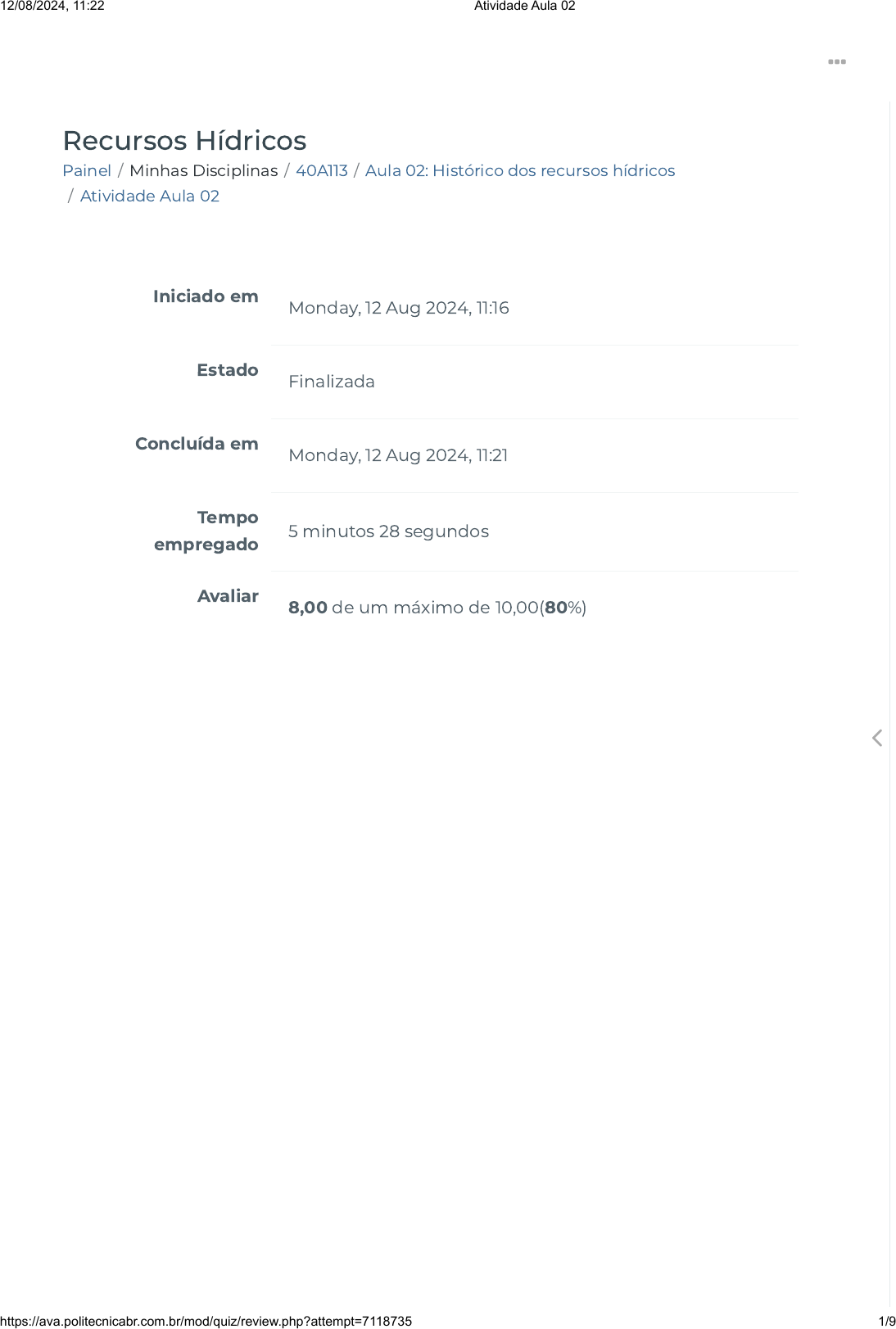 Painel / Minhas Disciplinas / 40A113 / Aula 02: Histórico dos recursos hídricos / Atividade Aula 02 Recursos Hídricos Iniciado em Monday, 12 Aug 2024, 11:16 Estado Finalizada Concluída em Monday, 12 Aug 2024, 11:21 Tempo empregado 5 minutos 28 segundos Avaliar 8,00 de um máximo de 10,00(80%) 12/08/2024, 11:22 Atividade Aula 02 https://ava.politecnicabr.com.br/mod/quiz/review.php?attempt=7118735 1/9 https://ava.politecnicabr.com.br/my/ https://ava.politecnicabr.com.br/my/ https://ava.politecnicabr.com.br/course/view.php?id=1055 https://ava.politecnicabr.com.br/course/view.php?id=1055#section-3 https://ava.politecnicabr.com.br/mod/quiz/view.php?id=33936 https://ava.politecnicabr.com.br/ Questão 1 Correto Atingiu 2,00 de 2,00 Quanto as atividades humanas e os desa�os à sustentabilidade, marque Verdadeiro ou Falso: ( ) Outra área que demanda grande quantidade de água é o setor industrial, responsável pelo consumo de 20% da água potável utilizada no mundo. Os países desenvolvidos são os que retiram maior quantidade de água para este �m. Um dos maiores desa�os da indústria atualmente é conseguir atender o aumento da demanda de produtos industrializados sem que isso impacte as práticas sustentáveis de exploração de recursos naturais como a água. ( ) A urbanização crescente e acelerada que vem ocorrendo nos países também leva ao aumento da demanda mundial por água. Atualmente, mais da metade da população mundial já vive em áreas urbanas e estima-se que até 2050 esse valor passe a dois terços da população, o que resultaria em cerca de 9 bilhões de pessoas. ( ) A agricultura é uma atividade econômica que apresenta um enorme consumo de água, sendo responsável pela demanda global de 70% desse recurso. Cabe destacar que este volume varia de acordo com cada país. A agricultura de sequeiro é a forma predominante de cultivo encontrada no mundo. Trata-se de um sistema utilizado em regiões que apresentam baixos índices pluviométricos e solos �rmes, como nos planaltos africanos e no sertão nordestino. Para que esses tipos de cultivos tenham acesso à água, máquinas revolvem os terrenos, trazendo à tona a umidade natural do solo. Escolha uma opção: a. F, F, F. b. F, V, V. c. F, F, V. 12/08/2024, 11:22 Atividade Aula 02 https://ava.politecnicabr.com.br/mod/quiz/review.php?attempt=7118735 2/9 https://ava.politecnicabr.com.br/ d. V, F, V. e. V, V, V. 12/08/2024, 11:22 Atividade Aula 02 https://ava.politecnicabr.com.br/mod/quiz/review.php?attempt=7118735 3/9 https://ava.politecnicabr.com.br/ Questão 2 Correto Atingiu 2,00 de 2,00 Marque Verdadeiro ou Falso, referente os programas de desenvolvimento e monitoramento dos recursos hídricos: A água é, atualmente, uma forma de investimento no mundo inteiro, haja vista que sem água não há desenvolvimento econômico, social ou ambiental. Como visto na seção anterior, a distribuição temporal e espacial da água no planeta é bastante desigual, assim como sua qualidade, o que torna indispensável o desenvolvimento de programas adequados para o monitoramento e a conservação dos recursos hídricos. Conhecer as características físicas e químicas das águas, assim como os aspectos geográ�cos dos corpos hídricos e de seu entorno, é fundamental para de�nir e construir a infraestrutura necessária ao aproveitamento desses recursos. Isso porque, se o crescimento e desenvolvimento de áreas urbanas ocorrerem sem prévio estudo e avaliação do potencial hídrico de cada região, há um grande risco de acontecerem severos danos ao meio, como inundações, secas, erosão de leitos de rios e deserti�cação de terrenos, para citar apenas alguns exemplos. Uma das principais formas de preservar e, ao mesmo tempo, explorar os recursos hídricos de forma sustentável é desenvolver programas adequados de monitoramento e gestão das águas. Esses programas devem fornecer dados acurados e con�áveis, obtidos em curto período de tempo, para que sejam condizentes com o cenário atual de cada região. Entretanto, comumente é difícil avaliar de forma clara a situação dos corpos hídricos em escala global. Essa realidade é ainda mais evidente em países em desenvolvimento (que abrangem a maior parcela de água doce no mundo), devido à ausência de planejamento e à di�culdade na obtenção de dados hidrológicos. Felizmente, apesar de ainda escassas, algumas iniciativas de controle e gestão têm sido realizadas nas últimas décadas, e as atuais redes de monitoramento hidrométrico podem ser encontradas desde a administração voluntária de pequenas bacias hidrográ�cas no Brasil, até iniciativas maiores, em escala continental. Escolha uma opção: Verdadeiro 12/08/2024, 11:22 Atividade Aula 02 https://ava.politecnicabr.com.br/mod/quiz/review.php?attempt=7118735 4/9 https://ava.politecnicabr.com.br/ Falso 12/08/2024, 11:22 Atividade Aula 02 https://ava.politecnicabr.com.br/mod/quiz/review.php?attempt=7118735 5/9 https://ava.politecnicabr.com.br/ Questão 3 Correto Atingiu 2,00 de 2,00 Assinale a alternativa correta. Programas de avaliação e monitoramento dos recursos hídricos Para compreendermos melhor como os programas de monitoramento de recursos hídricos são importantes para o processo da gestão sustentável da água, é importante conhecer antes o conceito de hidrologia. A hidrologia é a ciência que tem como objeto de estudo a ocorrência e distribuição das águas no planeta, espacial e temporalmente. Também, de acordo com a World Metereological Organization (WMO, ou Organização Meteorológica Mundial) e a Organização das Nações Unidas para Educação, Ciência e Cultura (Unesco), a hidrologia deve levar em consideração as propriedades físicas, químicas e biológicas das águas, além de considerar sua interação com o ambiente físico e com os ecossistemas (WMO, 2009). A hidrologia, portanto, avalia e monitora os recursos hídricos. Um programa de monitoramento de ág