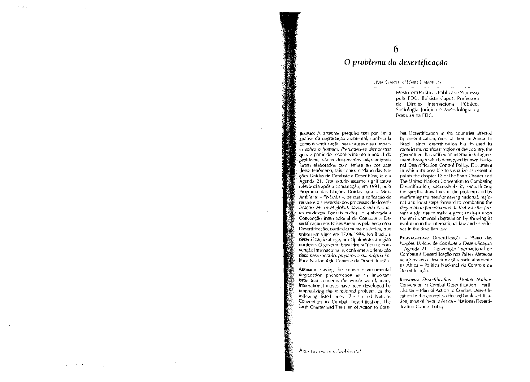 O problema da desertificação LÍVIA GAIO ILB Bôyo CAMPFJ.LD Mestre em Polílicas Públicas e Pr<x.essij pela FDC.". Bolsista Capes. Professora de Direito Internacional Público, Sociologia (urídita f Metodologia da Pesquisa na FDC. RESUMO: A presente pesquisa tem por íim a análise da degradai,ao ambiental, conhecida como ri esert i ficarão, suas causas e seu impai, to sobro o homem. Preie.ndeu-se demonstrai 1 que, a partii do reconhecimento mundial do problema, vário', documentos internacionais íoram elaborados corn ênfase ao combate desse fenômeno, tais tomo- o Plano das Na- ções Unidas de Combate à Deserl i ficarão e A Agenda 21. Este Miúdo assume significativa relevância após a constalação, cm !H91, pulo Programa das Nações Unidas para o Meio Ambiente - PNUMA -, de que a aplicarão de recursos c a reversão dos processos de deserti- ficacão, em nível global, haviam sido bastan- tes rni«destos. Por tais razões, íoi elaborada a Convenção Internacional de Combale à De- sertiíicacão nos Países Afetados pela Seca c/ou Desertificdção, particularmente nu África, que' entrou em vigor em 17.0(1.1994. No Brasil, à desprtificação atingi', principalmente, a região nordeste. Ü governo brasileiro ratifitou 3 con- venção internacional e, conforme a orienta cão dada nesse acordo, preparou a sua própria Po- lítica Nacional do tonlrole da Desertifii ação. ABSTUACT: Having thc known environniental degradai ion plienomenon as a n importam issue that conrerns lhe whole world, man^ intornational moves nave been developed by wiphasî ing the muntioniíd prtiblem, as the following listed onos: 'tlie United Nations Convi-ntion to Cornbat Deserlification, The Earih Charter and The Plsn of Action to Com- bal Desertifii.ation In tlii; counlries by descrtifiuiüon, most of thcm in África In Brazil, sinvic; descrtificalion ha; ft>cuseri its rootsin thenoitheast region oílheiountvy, the governmenl lias ratified an intcrnational agiee- menl through which developed its own Natio- nal Deserlification Control Poliiy Dói umünt in whkh it's fiossíble to visualize as essential poirits the chapter l 2 of The tanh Charter and The United Nations Convenlion to Conibaling Deserlification, successively by empathizjng the specific draw line.s of the probleni and hy rcaffirrning the need of having nalional, regio- nal and local steps forwdrd to combaling lhe degradation phenomenon. In that way the pre- sent study tries to rnake s great analysis upon the enví'onmenLal degradation by showing its ev(jlutii>n in thc internai i ijna l law and iís refle- «es in lhe Brdzilian law. PALAVBAS-CHAVL: Dcsertifi(.ação - Plano das Nâ õei Unidas de Combale á Desem ficada o - Agenda 2] - Convenção Internacional de Combale à Desert i Reação nos Paists Afetados pela Seca e/ou Deserlificação, particularmenle na África - Política Nacional df- Controle da Desertificação. KEVWOBDS: Desertification - United Nations Convenlion tu Curnbat Desertilication - Earth Charter - Plan of Aciion to Combat Deserlifi- cation in lhe countrics affected by düsertifica- lion. most of lhem m Aínca - National Deserti- fication Conirol Policv 130 LÍVIA GAIHHUÍ Bósio CAMPFILO O problema da dc-scrtiíicaçào 131 SUMARIO: 1, O reconhecimento do problema em nível mun- dial - 2. O conceito de dcsertificaçâo - 3. A= causas da desertificacào: 3.1 Ação dos fatores climáticos no proces- so de desertificação; 3.2 A relação entre o homem e um "meio ambiente difícil": 3.2.1 Pecuária; 3.2.2 Agricultura - 4. O impacto da desertificação sobre o homem - 5. A l Conferência das Nações Unidas sobre Desertificação: 5.1 O plano de ação das Nações Unidas para combater a de- sertificação (PACD) - 6. A Conferência das Nações Unidas sobre o Meio Ambiente e Desenvolvimento (CNUMAD), a Agenda 21 e a desertificação - 7. A Convenção Internacio- nal de Combate à Desertificação nos Países Afetados por Seca Grave e/ou Desertificação, Particularmente na África: 7.1 Definição dos termos, objetivos, princípios e obriga- ções das partes; 7.2 Os programas de ação: NAP's, RAP's e SRAP's; 73 Desertificação e desenvolvimento partici- pativo (bottom-up approach) - 8. A Política Nacional de Controle da Desertiíicação: o Brasil e as suas respectivas Áreas Suscetíveis à Desertificação (ASD's) -- 9. Resolução Conama 238 de 22.12.1997 - 10. A construção partici- pativa do Programa de Ação Nacional de Combate à De- sertificação e Mitigação dos Efeitos da Seca (PAN-Brasilt -11. Conclusão. l . O RECONHECIMENTO DO PROBLEMA EM NlVEL MUNDIAI No início do século XX, o inundo necessitava do irigo e pagava um bom preço por ele. Os fazendeiros do meio-oesie americano aravam e plantavam o trigo como nunca, principalmente após a colheita fenomenal de 1926. Devido ao clima seco, tais fazendeiros buscaram expandir a agricultura era mais terras, visando a um maior lucro, não demonstrando qualquer preocupação com a ocorrência de danos ao solo.1 Em 1930. em meio à Grande Depressão, os povos das grandes planícies do meio-oeste americano temeram o fim do mundo, vez que a terra se encontrava demasiadamente ressecada e, no verão, regi s travam-se as mais altas tempera- turas. Desde enlüo. grandes tempestades levantavam o solo frouxo. Formando uma cortina de poeira que circulava pelos campos e destruía a lavoura de irigo que ainda resistia à seca/ MACINTOSH. Phyllis. D ese n i fica ri (ir,: Farths Silent Scourge. Texto publicado em 2004. Disponível tm: <hílp://usiufo.siaTe.gov/product.s/pubs/deserrilic/expe- TÍence.hun>. Acesso em 10.01.2006 MACINTOSH, Phyllis. Desmifkarion: Líarths Silent Scourge. Texic. publicado em 2004. Disponível em: <h 11 p://usiulo.st aTt.gov/produc rs/pubs/deserrific/expe- rienre.htm> Acesso cm 10 Oi .2006 Paul tionnifield' relaia que nu domingo, 14.04.1935. "o dia estava morno e agradável", quando: [ . . . j "uma bnsa delicada choramingou íora do