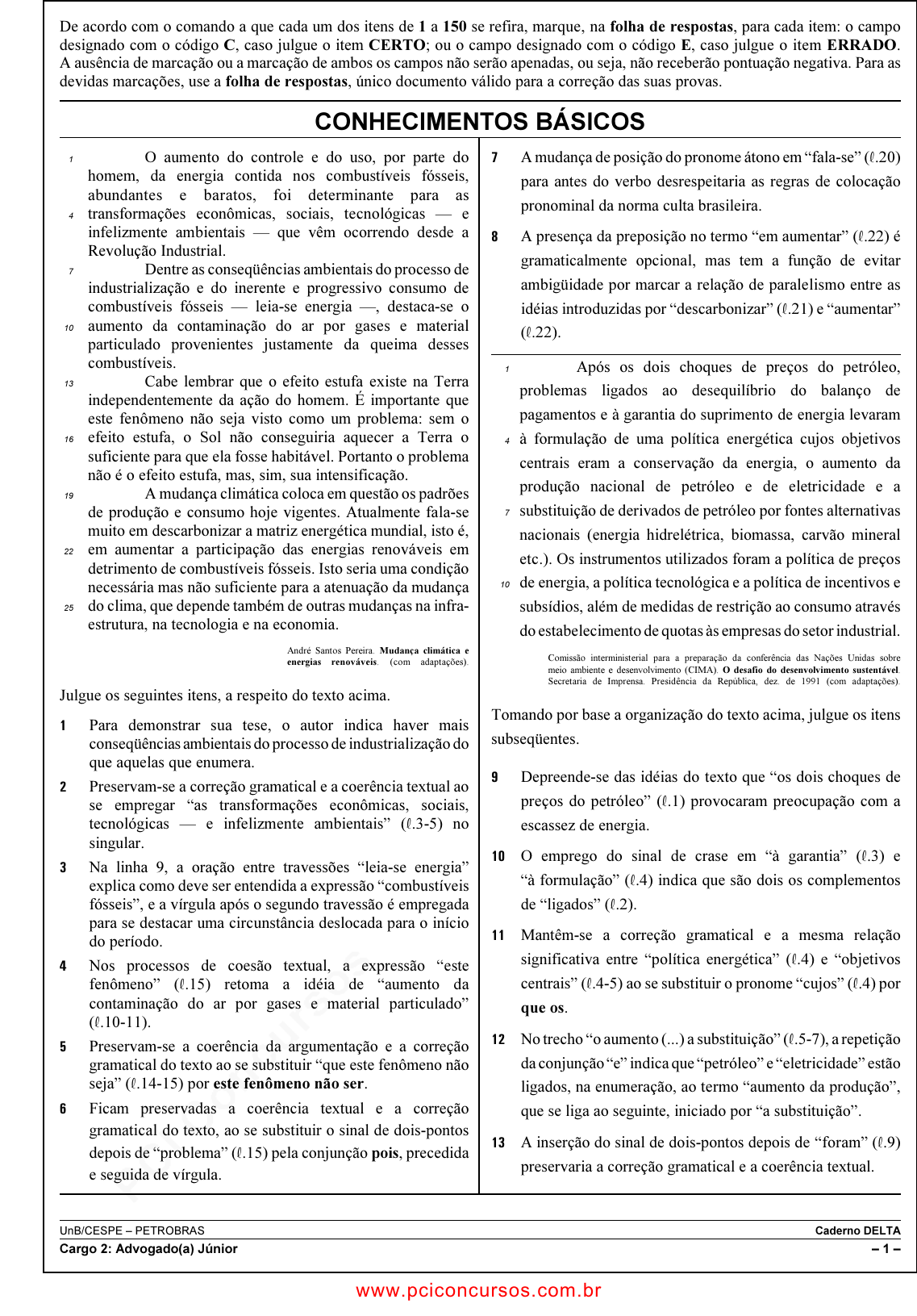 pcimarkpci MDAwMDowMDAwOjAwMDA6MDAwMDowMDAwOmZmZmY6YmI0ODowMGJk:TW9uLCAxMiBBdWcgMjAyNCAxMToyODozNCAtMDMwMA== www.pciconcursos.com.br UnB/CESPE – PETROBRAS Caderno DELTA Cargo 2: Advogado(a) Júnior – 1 – De acordo com o comando a que cada um dos itens de 1 a 150 se refira, marque, na folha de respostas, para cada item: o campo designado com o código C, caso julgue o item CERTO; ou o campo designado com o código E, caso julgue o item ERRADO. A ausência de marcação ou a marcação de ambos os campos não serão apenadas, ou seja, não receberão pontuação negativa. Para as devidas marcações, use a folha de respostas, único documento válido para a correção das suas provas. CONHECIMENTOS BÁSICOS O aumento do controle e do uso, por parte do1 homem, da energia contida nos combustíveis fósseis, abundantes e baratos, foi determinante para as transformações econômicas, sociais, tecnológicas — e4 infelizmente ambientais — que vêm ocorrendo desde a Revolução Industrial. Dentre as conseqüências ambientais do processo de7 industrialização e do inerente e progressivo consumo de combustíveis fósseis — leia-se energia —, destaca-se o aumento da contaminação do ar por gases e material10 particulado provenientes justamente da queima desses combustíveis. Cabe lembrar que o efeito estufa existe na Terra13 independentemente da ação do homem. É importante que este fenômeno não seja visto como um problema: sem o efeito estufa, o Sol não conseguiria aquecer a Terra o16 suficiente para que ela fosse habitável. Portanto o problema não é o efeito estufa, mas, sim, sua intensificação. A mudança climática coloca em questão os padrões19 de produção e consumo hoje vigentes. Atualmente fala-se muito em descarbonizar a matriz energética mundial, isto é, em aumentar a participação das energias renováveis em22 detrimento de combustíveis fósseis. Isto seria uma condição necessária mas não suficiente para a atenuação da mudança do clima, que depende também de outras mudanças na infra-25 estrutura, na tecnologia e na economia. André Santos Pereira. Mudança climática e energias renováveis. (com adaptações). Julgue os seguintes itens, a respeito do texto acima. � Para demonstrar sua tese, o autor indica haver mais conseqüências ambientais do processo de industrialização do que aquelas que enumera. � Preservam-se a correção gramatical e a coerência textual ao se empregar “as transformações econômicas, sociais, tecnológicas — e infelizmente ambientais” (R.3-5) no singular. � Na linha 9, a oração entre travessões “leia-se energia” explica como deve ser entendida a expressão “combustíveis fósseis”, e a vírgula após o segundo travessão é empregada para se destacar uma circunstância deslocada para o início do período. � Nos processos de coesão textual, a expressão “este fenômeno” (R.15) retoma a idéia de “aumento da contaminação do ar por gases e material particulado” (R.10-11). � Preservam-se a coerência da argumentação e a correção gramatical do texto ao se substituir “que este fenômeno não seja” (R.14-15) por este fenômeno não ser. � Ficam preservadas a coerência textual e a correção gramatical do texto, ao se substituir o sinal de dois-pontos depois de “problema” (R.15) pela conjunção pois, precedida e seguida de vírgula. � A mudança de posição do pronome átono em “fala-se” (R.20) para antes do verbo desrespeitaria as regras de colocação pronominal da norma culta brasileira. � A presença da preposição no termo “em aumentar” (R.22) é gramaticalmente opcional, mas tem a função de evitar ambigüidade por marcar a relação de paralelismo entre as idéias introduzidas por “descarbonizar” (R.21) e “aumentar” (R.22). Após os dois choques de preços do petróleo,1 problemas ligados ao desequilíbrio do balanço de pagamentos e à garantia do suprimento de energia levaram à formulação de uma política energética cujos objetivos4 centrais eram a conservação da energia, o aumento da produção nacional de petróleo e de eletricidade e a substituição de derivados de petróleo por fontes alternativas7 nacionais (energia hidrelétrica, biomassa, carvão mineral etc.). Os instrumentos utilizados foram a política de preços de energia, a política tecnológica e a política de incentivos e10 subsídios, além de medidas de restrição ao consumo através do estabelecimento de quotas às empresas do setor industrial. Comissão interministerial para a preparação da conferência das Nações Unidas sobre meio ambiente e desenvolvimento (CIMA). O desafio do desenvolvimento sustentável. Secretaria de Imprensa. Presidência da República, dez. de 1991 (com adaptações). Tomando por base a organização do texto acima, julgue os itens subseqüentes. Depreende-se das idéias do texto que “os dois choques de preços do petróleo” (R.1) provocaram preocupação com a escassez de energia. � O emprego do sinal de crase em “à garantia” (R.3) e “à formulação” (R.4) indica que são dois os complementos de “ligados” (R.2). �� Mantêm-se a correção gramatical e a mesma relação significativa entre “política energética” (R.4) e “objetivos centrais” (R.4-5) ao se substituir o pronome “cujos” (R.4) por que os. �� No trecho “o aumento (...) a substituição” (R.5-7), a repetição da conjunção “e” indica que “petróleo” e “eletricidade” estão ligados, na enumeração, ao termo “aumento da produção”, que se liga ao seguinte, iniciado por “a substituição”. �� A inserção do sinal de dois-pontos depois de “foram” (R.9) preservaria a correção gramatical e a coerência textual. www.pciconcursos.com.br pcimarkpci MDAwMDowMDAwOjAwMDA6MDAwMDowMDAwOmZmZmY6YmI0ODowMGJk:TW9uLCAxMiBBdWcgMjAyNCAxMToyODozNCAtMDMwMA== www.pciconcursos.com.br UnB/CESPE – PETROBRAS Caderno DELT