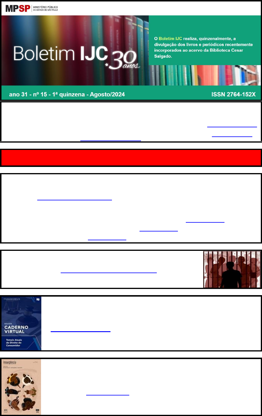 BOLETIM IJC, ano 31, no 15, ago. 2024 - ISSN 2764-152X. Página 1 Ministério Público do Estado de São Paulo Diretoria-Geral Centro de Documentação e Biblioteca Biblioteca "Cesar Salgado" - Setor de Divulgação bibliotecário responsável: João Evangelista de Souza Lima Neto fone: (11) 3119-9025 / e-mail: bibliomp@mpsp.mp.br Números anteriores Sobre o Boletim Fique por dentro do IJC VIOLÊNCIAS LGBTFÓBICAS NA CIDADE DE SÃO PAULO * Os dois bancos de dados disponíveis captam de forma diferente o fenômeno da LGBTfobia: Estudo do Instituto Pólis identificou que o padrão territorial da LGBTfobia registrada pela Segurança Pública é diferente daquele identificado nos atendimentos do sistema de Saúde. * Notícia do Instituto Pólis, em 06/2024. CLIQUE AQUI para ler a íntegra da notícia. CLIQUE AQUI para ler a íntegra do Estudo citado na notícia. SISTEMA PRISIONAL Veja a mais recente doutrina sobre Sistema Prisional incorporada à Biblioteca Digital do MP-SP. TEMAS ATUAIS DO DIREITO DO CONSUMIDOR Nesta edição do Boletim IJC está disponível a versão digital do número 58 do CADERNO VIRTUAL com a seguinte Edição Especial: “Temas atuais do Direito do Consumidor”. DIREITO E RELAÇÕES RACIAIS Nesta edição do Boletim IJC está disponível a versão digital do volume 10, número 16 da INSURGÊNCIA com o seguinte Dossiê Temático: “Direito e relações raciais”. mailto:bibliomp@mpsp.mp.br https://mpspbr.sharepoint.com/:b:/s/bibliotecadigitalmpsp/EdV2dXEkPvlGjas46TYQgwkBYEsiTZ2z6_eDbOdS4dRCOg?e=14kE0f http://www.mpsp.mp.br/portal/page/portal/documentacao_e_divulgacao/doc_biblioteca/bibli_servicos_produtos/bibli_boletim/bibli_bol_2006/Sobre_o_Boletim.jpg http://www.mpsp.mp.br/portal/page/portal/documentacao_e_divulgacao/doc_biblioteca/bibli_servicos_produtos/BibliotecaDigital/BibDigitalLivros/TodosOsLivros/Violencia-LGBTfobica-na-cidade-de-Sao-Paulo_limites-ao-direito.pdf https://polis.org.br/estudos/violencias-lgbtfobicas-na-cidade-de-sp/ https://polis.org.br/estudos/violencias-lgbtfobicas-na-cidade-de-sp/ http://www.mpsp.mp.br/portal/page/portal/documentacao_e_divulgacao/doc_biblioteca/bibli_servicos_produtos/BibliotecaDigital/BibDigitalLivros/TodosOsLivros/Violencia-LGBTfobica-na-cidade-de-Sao-Paulo_limites-ao-direito.pdf https://mpspbr.sharepoint.com/:b:/s/bibliotecadigitalmpsp/ETSFSofpzrBAt0wDTYkDbdoBv9l-kGFJ5Qwrzc9dffuPyA?e=zw3Iod https://mpspbr.sharepoint.com/:b:/s/bibliotecadigitalmpsp/ETHo7ALPd3hAttJdpFCFz44BrbQ3S0u1qlDoF7sXWD9jgw?e=pGwgnC https://mpspbr.sharepoint.com/:b:/s/bibliotecadigitalmpsp/EZdreBnMeqpDtYO_-z7iDIYBoP6i6PkwtZAhdhkEbiws0g?e=2Mv5x8 BOLETIM IJC, ano 31, no 15, ago. 2024 - ISSN 2764-152X. Página 2 DERECHOS DE LAS PERSONAS EN MOVILIDAD HUMANA, tensiones y desafíos en el desarrollo normativo y jurisprudencial Nesta edição do Boletim IJC está disponível a versão digital do número 32 da IURIS DICTIO com o seguinte Dossiê: “Derechos de las personas en movilidad humana, tensiones y desafíos en el desarrollo normativo y jurisprudencial”. MUDANÇAS SOCIAIS, DIREITOS E DILEMAS Nesta edição do Boletim IJC está disponível a versão digital do número 119 da LUA NOVA com a seguinte Temática: “Mudanças sociais, direitos e dilemas”. MEDO E A CRUELDADE COMO DISPOSITIVOS (NECRO)POLÍTICOS DA CONTEMPORANEIDADE Nesta edição do Boletim IJC está disponível a versão digital do volume 5, número 1 da METAXY com a seguinte Temática: “Medo e a crueldade como dispositivos (necro)políticos da contemporaneidade”. ARTIGOS EM DESTAQUE Veja alguns dos artigos apresentados pelas revistas incluídas neste Boletim IJC: “ACORDO DE NÃO PERSECUÇÃO PENAL E CONTROLE JUDICIAL DA RECUSA PELO MINISTÉRIO PÚBLICO: análise da posição dos tribunais brasileiros e da normativa dos ministérios públicos sobre os fundamentos da recusa e o seu controle”, na REVISTA DOS TRIBUNAIS. “VIOLÊNCIA CONTRA A MULHER DURANTE A GESTAÇÃO: entre a invisibilidade do fenômeno e os desafios da responsabilização do agressor”, na REVISTA DE CIÊNCIAS JURÍDICAS E SOCIAIS DA UNIPAR. “FENÓMENOS ESTRANHOS NA JURISDIÇÃO: adjudicação sem convicção e convicção sem adjudicação”, na REVISTA DE PROCESSO. “A TRANSIÇÃO DA LIBERDADE JURÍDICA À AUTONOMIA PRIVADA NA RELAÇÃO MÉDICO-PACIENTE E SEUS REFLEXOS NA SAÚDE SUPLEMENTAR”, na REVISTA BRASILEIRA DE DIREITO CIVIL. “UMA LACUNA CONSTITUCIONAL? o foro dos procuradores de justiça”, na REVISTA ACADÊMICA [DA] ESCOLA SUPERIOR DO MINISTÉRIO PÚBLICO DO ESTADO DO CEARÁ. “O DIREITO ÀS POLÍTICAS PÚBLICAS E À PROMOÇÃO DA SAÚDE PARA O DESENVOLVIMENTO DAS MULHERES”, na REDES: Revista Eletrônica Direito e Sociedade. “JUSTIÇA COMO EQUIDADE E DESENVOLVIMENTO DAS LIBERDADES NO DIREITO FUNDAMENTAL A RENDA BÁSICA FAMILIAR”, na LEXCULT: Revista Eletrônica do Centro Cultural Justiça Federal. “DERECHO A LA ENERGÍA DESDE LOS DERECHOS HUMANOS: transición profunda hacia viviendas adecuadas, un ambiente sano y modos de vida dignos”, na LETRAS VERDES: Revista Latinoamericana de Estudios Socioambientales. https://mpspbr.sharepoint.com/:b:/s/bibliotecadigitalmpsp/Ed0YOv4JE7dHrD4vEYQ6TzgBCyOu69QsNVpDy6fmTMhpdQ?e=ZSgZr3 https://mpspbr.sharepoint.com/:b:/s/bibliotecadigitalmpsp/EVgTS-c6RhlJrSnDB9CI2xYB4asV0Hjr0lCbEWvWJ3tA_A?e=pJ4bKe https://mpspbr.sharepoint.com/:b:/s/bibliotecadigitalmpsp/EXLx7i8nnGxCgky-ZnB93-wBJ7_nwwoz_2u1pGNs7_N9PA?e=fYH8ew https://mpspbr.sharepoint.com/:b:/s/bibliotecadigitalmpsp/EQi6eIhIA_9LoTeu-24DnIEBVoPjkCqCn-t7r1qOSNwuzw?e=OtpOau https://mpspbr.sharepoint.com/:b:/s/bibliotecadigitalmpsp/EdayvZX6jJRNp7Zs8ovsxX8B2DFqY1Ljtv1EJMkzXlYm3Q?e=A1dyQv https://mpspbr.sharepoint.com/:b:/s/bibliotecadigitalmpsp/EdayvZX6jJRNp7Zs8ovsxX8B2DFqY1Ljtv1EJMkzXlYm3Q?e=A1dyQv https://mpspbr.sharepoint.com/:b:/s/bibliotecadigitalmpsp/EY8LSVCSG7JLsvZrFmIXKUIBKDiBTZaS264px1q-E6dyyQ?e=Nsb9Ng https://mpspbr.sharepoint.com/:b:/s/bibliotecadigitalmpsp/EUyeDaUwpHNLsPOHGBskXhEBcnxXL01tHVcJ