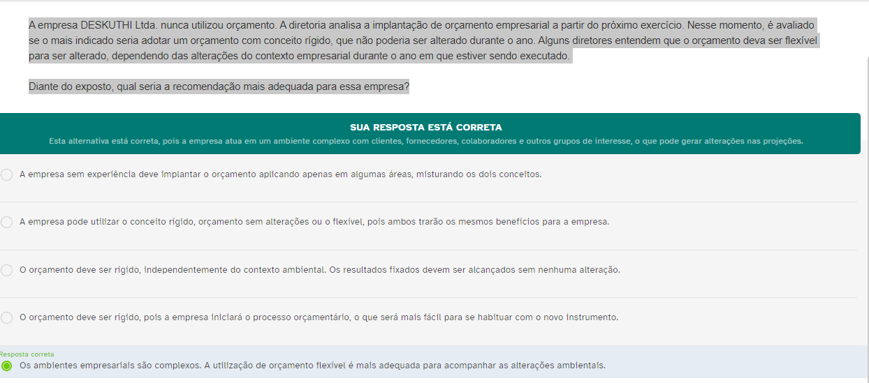 A empresa DESKUTHI Ltda. nunca utilizou orçamento. A diretoria analisa a implantação de orçamento empresarial a partir do próximo exercício. Nesse momento, é avaliado se o mais indicado seria adotar um orçamento com conceito rígido, que não poderia ser alterado durante ano. Alguns diretores entendem que orçamento deva ser flexível para ser alterado, dependendo das alterações do contexto empresarial durante ano em que estiver sendo executado. Diante do exposto, qual seria a recomendação mais adequada para essa empresa? SUA RESPOSTA ESTÁ CORRETA Esta alternativa está correta, pois a empresa atua em um ambiente complexo com clientes, fornecedores, colaboradores e outros grupos de interesse, que pode gerar alterações nas projeções. A empresa sem experiência deve implantar orçamento aplicando apenas em algumas areas, misturando os dois conceitos. A empresa pode utilizar conceito orçamento sem alterações ou pois ambos os mesmos benefícios para a empresa. orçamento deve ser independentemente do contexto Os resultados fixados devem ser alcançados sem nenhuma alteração. orçamento deve ser rígido, pois a empresa iniciará 0 processo orçamentário, que será mais fácil para se habituar com novo instrumento. Resposta correta Os ambientes empresariais são complexos. A utilização de orçamento flexível é mais adequada para acompanhar as alterações ambientais.