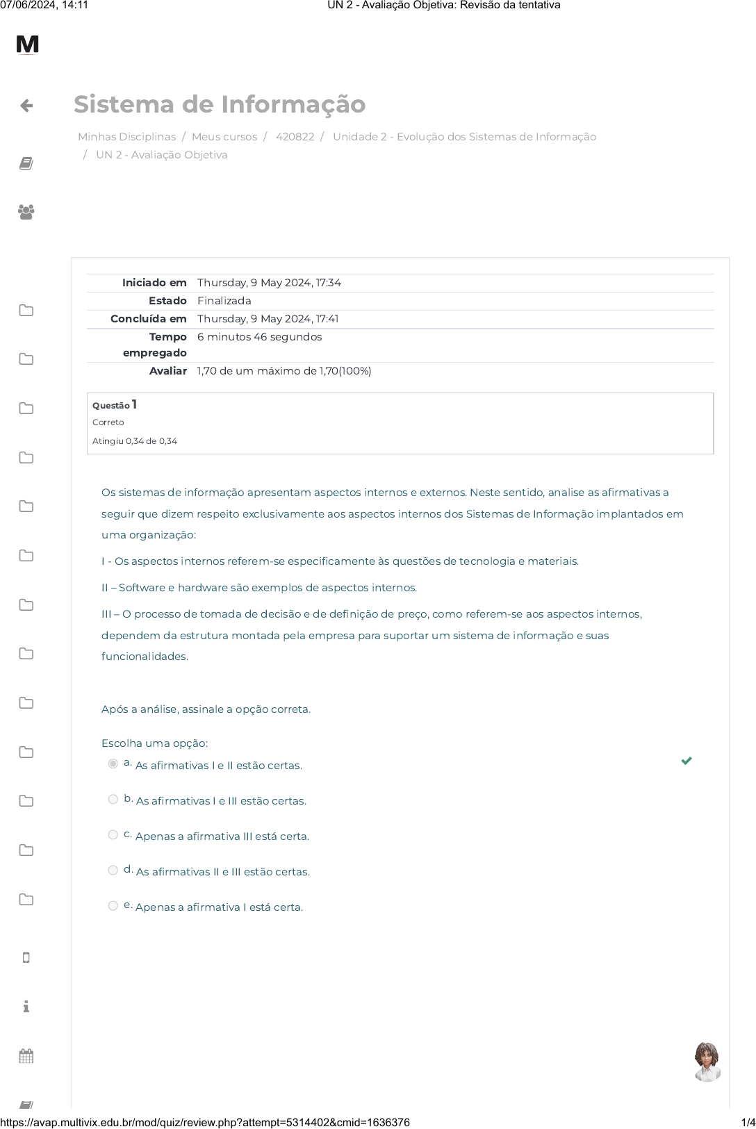 Minhas Disciplinas / Meus cursos / 420822 / Unidade 2 - Evolução dos Sistemas de Informação / UN 2 - Avaliação Objetiva Sistema de Informação Iniciado em Thursday, 9 May 2024, 17:34 Estado Finalizada Concluída em Thursday, 9 May 2024, 17:41 Tempo empregado 6 minutos 46 segundos Avaliar 1,70 de um máximo de 1,70(100%) Questão 1 Correto Atingiu 0,34 de 0,34 Os sistemas de informação apresentam aspectos internos e externos. Neste sentido, analise as a�rmativas a seguir que dizem respeito exclusivamente aos aspectos internos dos Sistemas de Informação implantados em uma organização: I - Os aspectos internos referem-se especi�camente às questões de tecnologia e materiais. II – Software e hardware são exemplos de aspectos internos. III – O processo de tomada de decisão e de de�nição de preço, como referem-se aos aspectos internos, dependem da estrutura montada pela empresa para suportar um sistema de informação e suas funcionalidades. Após a análise, assinale a opção correta. Escolha uma opção: a. As a�rmativas I e II estão certas. b. As a�rmativas I e III estão certas. c. Apenas a a�rmativa III está certa. d. As a�rmativas II e III estão certas. e. Apenas a a�rmativa I está certa. 07/06/2024, 14:11 UN 2 - Avaliação Objetiva: Revisão da tentativa https://avap.multivix.edu.br/mod/quiz/review.php?attempt=5314402&cmid=1636376 1/4 https://avap.multivix.edu.br/my/ https://avap.multivix.edu.br/course/view.php?id=26313 https://avap.multivix.edu.br/course/view.php?id=26313§ion=3 https://avap.multivix.edu.br/mod/quiz/view.php?id=1636376 https://avap.multivix.edu.br/my/ https://avap.multivix.edu.br/course/view.php?id=26313 https://avap.multivix.edu.br/user/index.php?id=26313 https://avap.multivix.edu.br/course/view.php?id=26313§ion=1 https://avap.multivix.edu.br/course/view.php?id=26313§ion=2 https://avap.multivix.edu.br/course/view.php?id=26313§ion=3 https://avap.multivix.edu.br/course/view.php?id=26313§ion=4 https://avap.multivix.edu.br/course/view.php?id=26313§ion=5 https://avap.multivix.edu.br/course/view.php?id=26313§ion=6 https://avap.multivix.edu.br/course/view.php?id=26313§ion=7 https://avap.multivix.edu.br/course/view.php?id=26313§ion=8 https://avap.multivix.edu.br/course/view.php?id=26313§ion=9 https://avap.multivix.edu.br/course/view.php?id=26313§ion=10 https://avap.multivix.edu.br/course/view.php?id=26313§ion=11 https://avap.multivix.edu.br/course/view.php?id=26313§ion=12 https://avap.multivix.edu.br/course/view.php?id=26313§ion=13 https://avap.multivix.edu.br/hooks/portal/ https://avap.multivix.edu.br/mod/page/view.php?id=1252%2F%22%20target%3D%22_blank https://avap.multivix.edu.br/calendar/view.php/ https://avap.multivix.edu.br/local/staticpage/view.php?page=biblioteca https://avap.multivix.edu.br/ https://avap.multivix.edu.br/ https://avap.multivix.edu.br/ https://avap.multivix.edu.br/ https://avap.multivix.edu.br/ Questão 2 Correto Atingiu 0,34 de 0,34 Questão 3 Correto Atingiu 0,34 de 0,34 A partir do conhecimento construído sobre Dados, Informação e Conhecimento, avalie as assertivas a seguir e a relação proposta entre elas. (1) A medida que novas tecnologias para registro e processamento de informação iam surgindo no século XX, a necessidade sobre o entendimento e manipulação dos sistemas foram sendo incorporadas aos equipamentos. PORQUE (2) Levou a uma profunda revolução na capacidade de registrar, processar, disseminar e buscar informações, o que ocasionou, por sua vez, mudanças ainda mais profundas na vida das pessoas e das organizações empresariais e governanças coorporativas. A respeito dessas duas assertivas, assinale a opção correta. Escolha uma opção: a. As duas assertivas são verdadeiras e a segunda não justi�ca a primeira. b. A primeira assertiva é falsa e a segunda é verdadeira. c. As duas assertivas são falsas. d. As duas assertivas são verdadeiras e a segunda justi�ca a primeira. e. A primeira assertiva é verdadeira e a segunda é falsa. A evolução dos sistemas da informação foi um grande passo para o mundo tecnológico, analise as assertivas a seguir e a relação proposta entre elas. (1) Com a evolução tecnológica, a abordagem sistêmica da informação começou a ser uma tendência e uma necessidade nas organizações. PORQUE (2) Os Sistemas de Informação vieram a dar ao computador uma nova dimensão, transformando-o de mero processador de dados em elemento preponderante na racionalização e na dinamização do trabalho na empresa. A respeito dessas duas assertivas, assinale a opção correta. Escolha uma opção: a. A primeira assertiva é falsa e a segunda é verdadeira. b. As duas assertivas são falsas. c. As duas assertivas são verdadeiras e a segunda não justi�ca a primeira. d. As duas assertivas são verdadeiras e a segunda justi�ca a primeira. e. A primeira assertiva é verdadeira e a segunda é falsa. 07/06/2024, 14:11 UN 2 - Avaliação Objetiva: Revisão da tentativa https://avap.multivix.edu.br/mod/quiz/review.php?attempt=5314402&cmid=1636376 2/4 https://avap.multivix.edu.br/my/ https://avap.multivix.edu.br/course/view.php?id=26313 https://avap.multivix.edu.br/user/index.php?id=26313 https://avap.multivix.edu.br/course/view.php?id=26313§ion=1 https://avap.multivix.edu.br/course/view.php?id=26313§ion=2 https://avap.multivix.edu.br/course/view.php?id=26313§ion=3 https://avap.multivix.edu.br/course/view.php?id=26313§ion=4 https://avap.multivix.edu.br/course/view.php?id=26313§ion=5 https://avap.multivix.edu.br/course/view.php?id=26313§ion=6 https://avap.multivix.edu.br/course/view.php?id=26313§ion=7 https://avap.multivix.edu.br/course/view.php?id=26313§ion=8 https://avap.multivix.edu.br/course/view.php?id=26313§ion=9 https://avap.multivix.edu.br/course/view.php?id=26313§ion=10 https://avap.multivix.edu.br/course/view.php?id=26313§ion=11 https://avap.multivix.edu.br/course/view.php?id=26313§ion=12 https://avap.multivix.edu.br/c