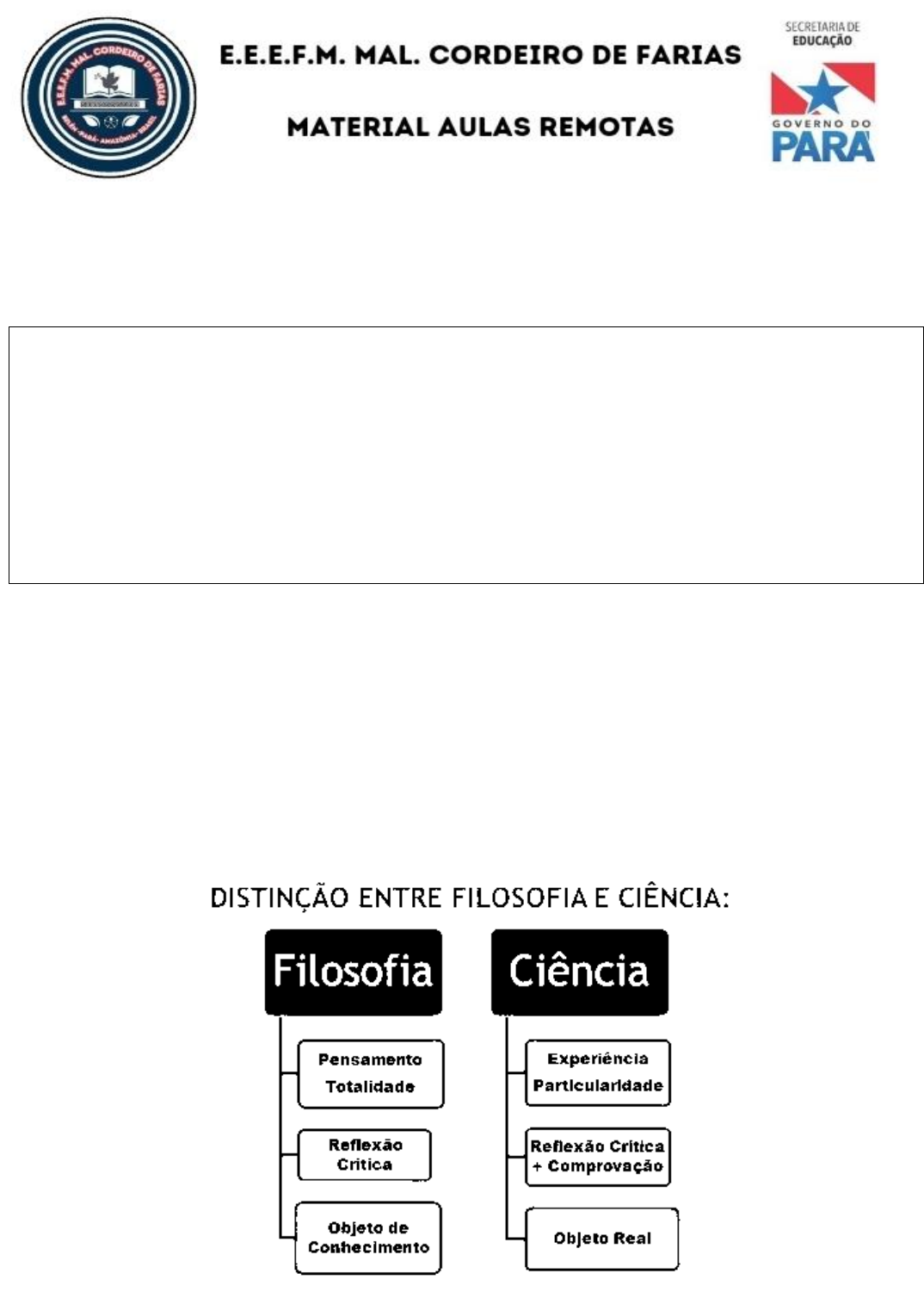 COMPONENTE CURRICULAR: FILOSOFIA Professor(a): ALINE G. ROSSI MORAES Série: 2º ANO Vamos aos estudos! 1- O que você vai encontrar por aqui... • Revisão assunto trabalhado na 2ª Avaliação Filosofia e Ciência 2- Revisão Com base nas informações reflita sobre as mesmas e em seguida responda a atividade no caderno. Saudações iniciais- Acolhimento Preparados para continuar? Recomeçando a trilhar o Projeto de Vida! Olá, queridos alunos, bem-vindos ao 2º semestre na Escola Mal. Cordeiro de Farias. Que bom estarmos juntos para as conquistas que ainda podemos fazer este ano. Quero lembrá-los que todo o esforço que é feito em busca do sonho e propósito de vida faz a diferença no alcance dos seus objetivos. Estamos juntos! Com afeto, profa. Aline Rossi Escola Integral de tempo Integral Escolha da Escolha, onde o seu sonho é prioridade. 2º ANO A ciência é uma explicação criteriosa que prescinde a dúvida e o método científico. A ciência e a Filosofia caminham juntas, porém são saberes distintos e precisam ser reconhecidos como tais. A ciência hoje caminha para a melhoria da qualidade de vida, bem como para o desenvolvimento das tecnologias, porém não pode jamais esquecer que o seu real objetivo é proteger, cuidar e preservar a vida seja ela de qualquer ser. A ciência está para a vida, assim como a vida está para a ciência. Assim com o a ciência não p ode ser reconhecida como filosofia a ciência não é religião, nem pensamento político, cada saber tem a sua definição e agrega o saber humano na sua inteireza. Vamos a atividade... ATIVIDADE RESPONDA NO CADERNO 1ª) Observe e responda no caderno: De acordo com a imagem e o assunto estudado, explique a imagem anterior. 2ª) O que é ciência? Explique. 3ª) Qual a diferença entre filosofia e ciência? Cite. 4ª) Como a ciência contribui para a evolução Tecnológica da sociedade aos dias de hoje? Cite e explique. 5ª) Como o tema Ciência se relaciona como tema trabalho, neocapitalismo e inteligência artificial? Explique. Parabéns! Você concluiu a revisão com sucesso! Entregue as respostas no seu caderno no dia da aula de Filosofia presencial. Grande abraço! Profa. Aline Rossi Vamos recordar o seu projeto de vida? Você já deve ter refletido sobre o seu futuro e as suas expectativas para como chegar nele tendo os seus objetivos concretizados. Um sonho sem projeto é a penas um sonho! Na escola Mal. Cordeiro de Farias, além de nos preocuparmos com o seu desempenho acadêmico, o seu sonho é uma prioridade para nós! Estamos na reta final do ano letivo, é necessário reorganizar a agenda pessoal para ver se as suas atitudes estão te ajudando a estar na direção do seu sonho. Que estes dias você pare para refletir e colocar no papel qual o seu sonho, o que você precisa fazer para realizá-lo e quando e como irá fazer para concretizar esse plano. Lembre-se estamos cm você.