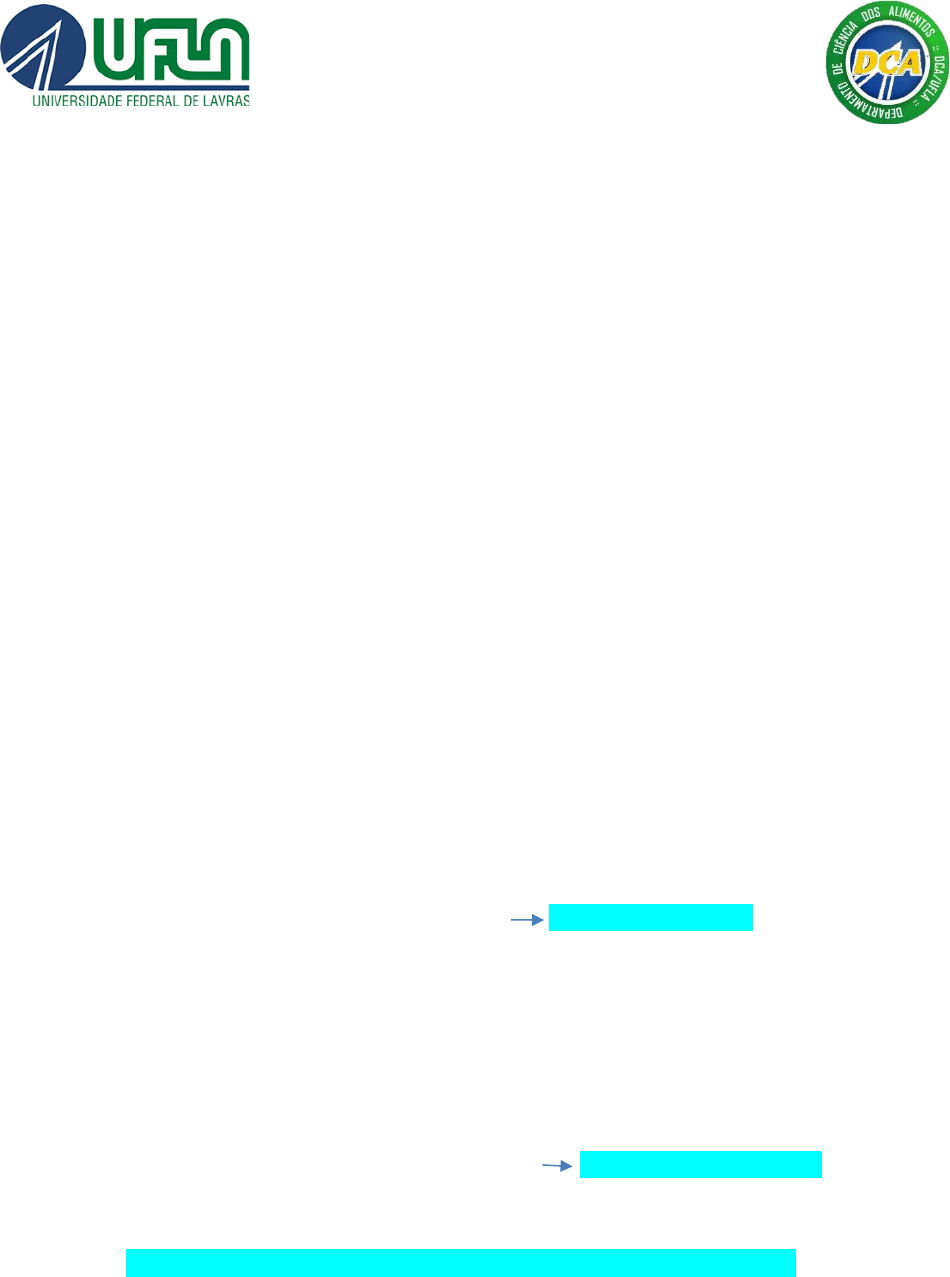 UNIVERSIDADE FEDERAL DE LAVRAS BROMATOLOGIA (GCA-137) Teste 01 - Aula Prática: Cálculo do teor de umidade 1) Uma amostra de farinha de grão de bico foi analisada para quantificação do seu teor de umidade. A partir do experimento em estufa à 105 °C, os seguintes dados foram obtidos: Cápsula = 58,7234 g; Amostra integral = 8,2934 g; Cápsula + amostra seca = 65,1273g. Determine o teor de umidade e de matéria seca desse alimento. Resolução Questão 1 Umid. = (Cápsula + Amostra integral) – (Cápsula + Amostra seca) Umid. = (58,7234 + 8,2934) – (65,1273) Umid. = 1,8895 g de umidade perdida durante o processo de secagem. 1,8895 g de água -------- 8,2934 g de MI X g de água -------- 100 g de MI X = 22,783 g de água 22,78% de umidade Matéria Integral = Matéria seca – Umid. 100 = Matéria seca – 22,78 Matéria seca = 100 – 22,78 Matéria seca = 77,22 77,22% de matéria seca O alimento apresenta 22,78 % de umidade e 77,22 % de matéria seca. 2) Durante a produção de geleia, o momento correto de interromper o processo de concentração do produto pode ser determinado a partir do seu teor de umidade. Assim, após 2 horas de processamento, uma amostra apresentou o teor de sólidos totais de 57,4% (m/m). O padrão de umidade estabelecido pelo controle de qualidade da indústria é de 30% (m/m). Considere que a massa inicial da mistura de ingredientes da geleia era de 1500,00 kg com 34,7% de sólidos e determine a quantidade de água (Kg) que ainda precisa ser removida para que a geleia fique pronta para o envase. Resolução Questão 2 Início: 1500kg ; 34,7% Sólidos Meio: ? ; 57,4% Sólidos Fim: ? ; 30% Umidade 70% sólidos C1M1 = C2M2 34,7 x 1500kg = 57,4 x M2 M2 = 906,79 kg de doce em produção. C2M2 = C3M3 57,4 x 906,79kg = 70 x M3 M3 = 743,57 kg de doce pronto M2 – M1 = 906,79 – 743,57 = 163,22kg de água que ainda precisa ser removida. 3) A redução do teor de umidade é uma das maneiras de aumentar a vida de prateleira de muitos alimentos, como as frutas. Com o objetivo de produzir uva passa, um lote de 50 Kg da fruta in natura (74,5% de umidade) foi submetido ao processo de secagem. Após 5 horas de secagem, a bandeja com o produto apresentou peso de 25 Kg. Considere que o padrão estabelecido pelo setor de controle de qualidade da empresa para uva passa é de 92,9% de sólidos totais. Responda às seguintes questões: a) O processo de secagem pode ser interrompido no tempo de 5 horas? b) Caso o produto não esteja pronto no tempo de 5 horas, qual seria a quantidade de água (Kg) que ainda precisaria ser removida? Resolução Questão 3 Dados: Massa uva passa in natura = 50kg U = 74,5% MS = 100-74,5=25,5% Massa uva passa ápos 5h= 25kg U = ? MS = ? Massa uva passa seca = ? U = 7,1% MS = 100 - 7,1 = 92,9% Questão 3 a) C1M1 = C3M3 25,5 x 50 = 92,9 x M3 M3 = 13,72kg de uva passa seca (produto pronto). O processo não deve ser interrompido após 5 horas porque a massa de produto final (13,72kg) que será obtida é diferente da medida (25 kg). Ou C1M1 = C2M2 25,5 x 50 = C2 x 25 C2 = 51 % de MS. O processo não deve ser interrompido após 5 horas porque a porcentagem de sólidos totais durante o processo (51%) é inferior ao nível exigido pela empresa (92,9%). Questão 3 b) M2 – M1 = 25– 13,72 = 11,28 kg de água ainda deve ser removida para que a uva passa fique de acordo com o teor de sólidos totais estabelecido pelo controle de qualidade.