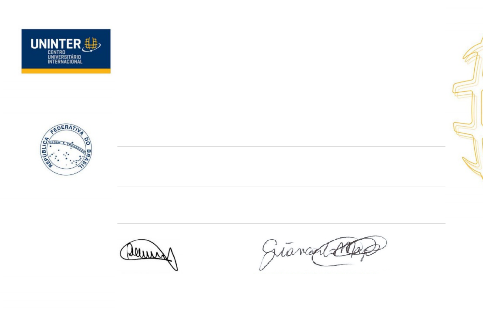 CERTIFICADOCERTIFICADO O Reitor do Centro Universitário Internacional UNINTER, confere aO Reitor do Centro Universitário Internacional UNINTER, confere a ROSILDA DE SOUSA MOURAROSILDA DE SOUSA MOURA inscrito sob o CPF de número 011.780.353-79inscrito sob o CPF de número 011.780.353-79 o certificado de participação e aproveitamento no eventoo certificado de participação e aproveitamento no evento CURSO DE EXTENSÃO | JOGOS E BRINCADEIRAS NA ALFABETIZAÇÃOCURSO DE EXTENSÃO | JOGOS E BRINCADEIRAS NA ALFABETIZAÇÃO Ofertado na modalidade Ofertado na modalidade - EAD, com carga horária de 40 hora/aula ofertado no período de- EAD, com carga horária de 40 hora/aula ofertado no período de 16 de outubro de 2023 A 23 de fevereiro de 2024.16 de outubro de 2023 A 23 de fevereiro de 2024. Prof. Dr. Benhur Etelberto GaioProf. Dr. Benhur Etelberto Gaio ReitorReitor Prof. Esp. Celso Giancarlo Duarte De MazoProf. Esp. Celso Giancarlo Duarte De Mazo Coordenador de Extensão e Assuntos ComunitáriosCoordenador de Extensão e Assuntos Comunitários Nome: ROSILDA DE SOUSA MOURA Curso: CURSO DE EXTENSÃO | JOGOS E BRINCADEIRAS NA ALFABETIZAÇÃO Área: Educação Registro Uninter: 4600430 Nível: Extensão Período da Realização: 16/10/2023 a 23/02/2024 COMPONENTES CURRICULARES C.H. NOTA FREQ.(%) DOCENTE CURSO DE EXTENSÃO | JOGOS E BRINCADEIRAS NA ALFABETIZAÇÃO 40h 80 100 ANDRESSA MARIANNE SALLES TOTAL: 40h DISCIPLINAS 01. O brincar e a criança 02. As consequências da falta de brincadeiras e jogos na formação bio - psico - social do sujeito 03. O lúdico na formação do educador 04. Vygostsky: Jogos e brincadeiras no desenvolvimento da linguagem 05. Piaget: jogos e brincadeiras no desenvolvimento infantil 06. O brincar e o desenvolvimento psicomotor 07. Construção de jogos para o processo de alfabetização Histórico vinculado ao Certificado registrado sob o n.º 2678380 no Livro Eletrônico de Registros de Certificados de cursos do Centro Universitário Internacional - UNINTER, inscrito sob o CNPJ 02.261.854/0001-57 em conformidade RESOLUÇÃO Nº 7 DE 18 DE DEZEMBRO DE 2018 do Ministério da Educação e Cultura. Validação eletrônica disponível em < https://extensaocommerce.uninter.com/certificado >, para validar o certificado utilize o CPF e a chave de acesso. Chave de acesso: u2024S2678380D4600430
