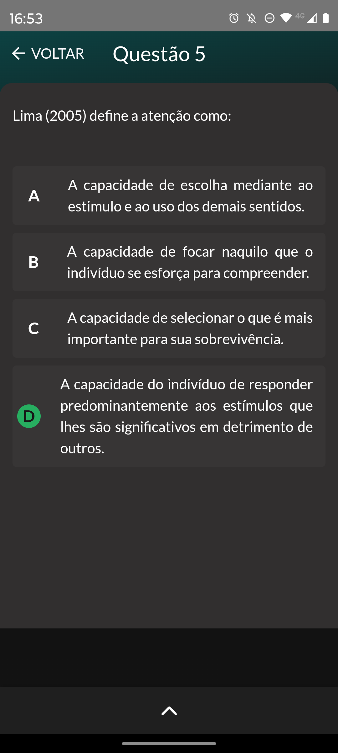 16:53 4G VOLTAR Questão 5 Lima (2005) define a atenção como: A capacidade de escolha mediante ao A estimulo e ao uso dos demais sentidos. A capacidade de focar naquilo que indivíduo se esforça para compreender. A capacidade de selecionar que é mais C importante para sua sobrevivência. A capacidade do indivíduo de responder predominantemente aos estímulos que D lhes são significativos em detrimento de outros.