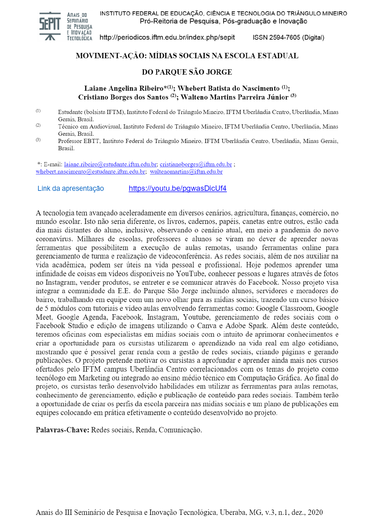 08/04/2024, 10:29 v.3 n.1, Dezembro, (2020): Anais do III Seminário de Pesquisa e Inovação Tecnológica | Anais do Seminário de Pesquisa e I… https://periodicos.iftm.edu.br/index.php/sepit/issue/view/37 1/3 Início / Arquivos / v.3 n.1, Dezembro, (2020): Anais do III Seminário de Pesquisa e Inovação Tecnológica v.3 n.1, Dezembro, (2020): Anais do III Seminário de Pesquisa e Inovação Tecnológica Publicado: 05/02/2021 FICHA TECNICA PDF CIÊNCIAS AGRÁRIAS AVALIAÇÃO COMPORTAMENTAL DE ANIMAIS DE COMPANHIA DURANTE O ISOLAMENTO SOCIAL PDF EFEITO DE DOSES DE NÍQUEL NO CULTIVO DE ALFACE AMERICANA PDF PRODUÇÃO DE ALFACE AMERICANA SOB ADUBAÇÃO MOLÍBDICA PDF Ariadne Freitas Silva, Robson Martins de Oliveira, Janaina Palermo Mendes, Liza Caroline Silva Rodrigues Lavínia Aris de Souza Costa, Eduardo Bucsan Emrich, Fábio Janoni Carvalho Lavínia Aris de Souza Costa, Eduardo Bucsan Emrich, Fábio Janoni Carvalho https://periodicos.iftm.edu.br/index.php/sepit/index https://periodicos.iftm.edu.br/index.php/sepit/index https://periodicos.iftm.edu.br/index.php/sepit/issue/archive https://periodicos.iftm.edu.br/index.php/sepit/issue/view/37 https://periodicos.iftm.edu.br/index.php/sepit/article/view/1210 https://periodicos.iftm.edu.br/index.php/sepit/article/view/1210/472 https://periodicos.iftm.edu.br/index.php/sepit/article/view/1160 https://periodicos.iftm.edu.br/index.php/sepit/article/view/1160 https://periodicos.iftm.edu.br/index.php/sepit/article/view/1160/467 https://periodicos.iftm.edu.br/index.php/sepit/article/view/1165 https://periodicos.iftm.edu.br/index.php/sepit/article/view/1165/468 https://periodicos.iftm.edu.br/index.php/sepit/article/view/1166 https://periodicos.iftm.edu.br/index.php/sepit/article/view/1166/469 08/04/2024, 10:29 v.3 n.1, Dezembro, (2020): Anais do III Seminário de Pesquisa e Inovação Tecnológica | Anais do Seminário de Pesquisa e I… https://periodicos.iftm.edu.br/index.php/sepit/issue/view/37 2/3 DETERMINAÇÃO DA CAPACIDADE DE USO DA TERRA DE ALGUNS SETORES DE PRODUÇÃO DO INSTITUTO FEDERAL DO TRIÂNGULO MINEIRO PDF PRODUTIVIDADE DE HIBRIDOS DE MILHO EM SISTEMA AGROSSILVIPASTOROIL DE TERCEIRO ANO COM EUCALIPTO PDF CIÊNCIAS HUMANAS E SOCIAIS MOVIMENT-AÇÃO: MÍDIAS SOCIAIS NA ESCOLA ESTADUAL DO PARQUE SÃO JORGE PDF DO LEGAL AO OPERACIONAL: UM OLHAR SOBRE AS MEDIDAS SOCIOEDUCATIVAS PDF VALORIZAÇÃO DOS PROFESSORES DA REDE MUNICIPAL DE UBERABA – MUDANÇAS NA APARÊNCIA PDF O PROCESSO DE INCLUSÃO NA EDUCAÇÃO DE SURDOS NO CONTEXTO DA EDUCAÇÃO FÍSICA ESCOLAR: uma revisão sistemática da literatura PDF COMPORTAMENTO DO CONSUMIDOR FEMININO DE SERVIÇOS DE BELEZA E ESTÉTICA NO CONTEXTO DA PANDEMIA DE COVID-19 PDF LIQUIDEZ E RENTABILIDADE: ANÁLISE DE UMA EMPRESA FAMILIAR DO AGRONEGÓCIO Paulo Henrique de Sousa Filho, Flávia Donato, Leirian Paloma dos Santos Silva, Marco Tulio Cardoso Carminati, Matheus Neves Ferreira, José Luiz Rodrigues Torres Luis Augusto Silva Domingues, Marcos Vinicius Siqueira de Souza Laiane Angelina Ribeiro, Whebert Batista do Nascimento, Cristiano Borges dos Santos, Walteno Martins Parreira Júnior Márcia de Souza Oliveira Paes Leme Alberto, Camila Maximiano Miranda Silva Juliene Silva Vasconcelos, Antônio Bosco de Lima Rafaela Pinheiro Lacerda, Wesley Antônio Gonçalves Jéssica Aparecida Silva Loiola, Guilherme de Freitas Borges https://periodicos.iftm.edu.br/index.php/sepit/article/view/1176 https://periodicos.iftm.edu.br/index.php/sepit/article/view/1176 https://periodicos.iftm.edu.br/index.php/sepit/article/view/1176/470 https://periodicos.iftm.edu.br/index.php/sepit/article/view/1196 https://periodicos.iftm.edu.br/index.php/sepit/article/view/1196 https://periodicos.iftm.edu.br/index.php/sepit/article/view/1196/471 https://periodicos.iftm.edu.br/index.php/sepit/article/view/1163 https://periodicos.iftm.edu.br/index.php/sepit/article/view/1163/460 https://periodicos.iftm.edu.br/index.php/sepit/article/view/1164 https://periodicos.iftm.edu.br/index.php/sepit/article/view/1164/461 https://periodicos.iftm.edu.br/index.php/sepit/article/view/1179 https://periodicos.iftm.edu.br/index.php/sepit/article/view/1179 https://periodicos.iftm.edu.br/index.php/sepit/article/view/1179/464 https://periodicos.iftm.edu.br/index.php/sepit/article/view/1180 https://periodicos.iftm.edu.br/index.php/sepit/article/view/1180 https://periodicos.iftm.edu.br/index.php/sepit/article/view/1180/465 https://periodicos.iftm.edu.br/index.php/sepit/article/view/1172 https://periodicos.iftm.edu.br/index.php/sepit/article/view/1172 https://periodicos.iftm.edu.br/index.php/sepit/article/view/1172/462 https://periodicos.iftm.edu.br/index.php/sepit/article/view/1174