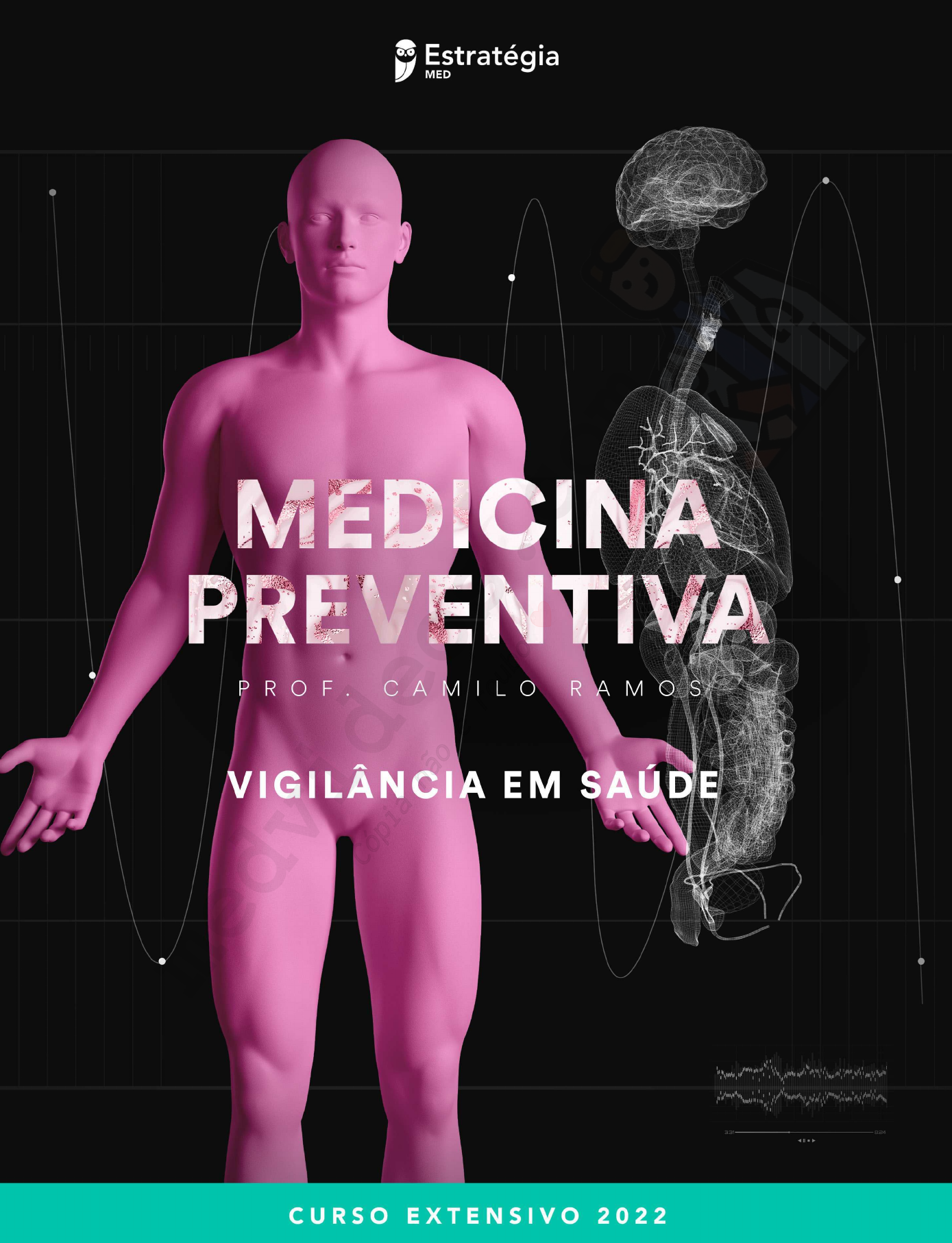 m e d v i d e o s . c o m Có pi a nã o é ro ub o ♥ m e d v i d e o s . c o m Có pi a nã o é ro ub o ♥ m e d v i d e o s . c o m Có pi a nã o é ro ub o ♥ Estratégia MED 2Prof. Camilo Ramos | Vigilância em SaúdeMEDICINA PREVENTIVA PROF. CAMILO RAMOS APRESENTAÇÃO: Estrategista, bem-vindo(a)! Sou o professor Camilo Ramos, especialista em Radiologia e Diagnóstico por Imagem, mestre em Clínica das Doenças Tropicais e seu professor de Medicina Preventiva do Estratégia MED. Seu sonho de ser um especialista e ter seu Registro de Qualificação de Especialista (RQE) começa aqui, passo a passo, focando em cada tópico, e não “no tanto que falta para aprender”. Neste livro digital, estudaremos a Vigilância em Saúde e seus quatro componentes: vigilâncias epidemiológica, sanitária, ambiental e em saúde do trabalhador. Preparei um material completo para você, mas, ao mesmo tempo, sem excessos de leis ou de tópicos que não importam para prova! Aqui, estudamos o que cai! Conheça um pouco da minha história e veja que, com a dedicação necessária, pavimentamos nosso caminho, ainda que não obrigatoriamente seguindo os caminhos “clássicos”. Sou natural de Belém (Pará), filho de pai ambulante e mãe dona de casa. Ensino fundamental em escola pública, médio como bolsista e finalmente o vestibular: o sonho da medicina. Passei meus seis anos de graduação na Universidade do Estado do Pará (UEPA) e, conforme avançava, eu ia enfrentando o dilema do caminho a escolher como especialidade no pós-formatura, porém a formatura, por si só, já é um sonho, e como pensar racionalmente em dois sonhos ao mesmo tempo?!?! Não tive acesso a cursos preparatórios, por questões de limitação financeira — e isso me deixava desmotivado e “esperando o pior” quando viessem os resultados das provas, de modo que m e d v i d e o s . c o m Có pi a nã o é ro ub o ♥ m e d v i d e o s . c o m Có pi a nã o é ro ub o ♥ Estratégia MED 3Prof. Camilo Ramos | Vigilância em SaúdeMEDICINA PREVENTIVA estudava pela internet, selecionando as principais provas do Brasil e resolvendo-as diariamente, com a “fixação dos 80%” de aproveitamento (era 2012, logo ali, mas o ensino a distância ainda engatinhava). Perceba o impacto que o ESTRATÉGIA MED promove, democratizando o acesso a um material de alto nível! Recém-formado, fui aprovado em Clínica Médica e Ginecologia e Obstetrícia nas seleções em Belém. Contudo, fui ao serviço militar mantendo a vaga trancada e, durante aquele ano, optei por mudar de ares: rumo ao centro do Brasil. Prestei novamente provas e fui aprovado na seleção unificada do DF (SES-DF) e em primeiro lugar no Hospital das Forças Armadas (HFA/DF), ambos em Clínica Médica e em Brasília. Iniciei a Residência, porém motivos familiares me trouxeram para o Norte de volta antes do término, então tive de resgatar o “Arquivo das Provas Antigas” e lá fui de novo prestar prova. Novo ano de seleção, e fui aprovado em Radiologia e Diagnóstico por Imagem na Santa Casa do Pará (onde cursei) e, ainda, em primeiro lugar, também nessa área, na Universidade Federal do Maranhão. Segui o mundo das seleções, sendo aprovado ainda em concursos públicos para médico nos níveis municipal, estadual e federal, tal como no Mestrado em Doenças Tropicais que cursei na Universidade Federal do Pará. As frustrações por vezes ocorrem, inevitáveis — a diferença é em como lidamos com elas, devendo torná-las um combustível premium aditivado para nossa motivação. Então, Estrategista, minha vida sempre encontrou sentido enfrentando desafios de provas e seleções e, agora, seu desafio é meu desafio! Torço por você! Conte comigo, mande suas dúvidas (camilo.ramos@estrategiamed. com.br) e saiba que você não está só. Com os melhores votos de sucesso, Prof. Camilo Ramos. Esses três anos como concurseiro de Residência Médica e sendo aprovado em diversas regiões do Brasil me proporcionaram um know how que quero dividir com você! Na primeira prova, até o mosquito que voa no seu ouvido parece um concorrente duro. Quando a confiança vem, o dia da prova é um dia divertido de saber que está indo alcançar sua vitória. @camilo.f.ramos @estrategiamed /estrategiamed Estratégia MED t.me/estrategiamedm e d v i d e o s . c o m Có pi a nã o é ro ub o ♥ mailto:camilo.ramos@estrategiamed.com.br mailto:camilo.ramos@estrategiamed.com.br https://www.instagram.com/camilo.f.ramos/?utm_medium=copy_link https://www.instagram.com/profbruno.souza/ https://www.instagram.com/estrategiamed/ https://www.instagram.com/estrategiamed/ https://www.facebook.com/estrategiamed1 https://www.facebook.com/estrategiamed1 https://www.youtube.com/channel/UCyNuIBnEwzsgA05XK1P6Dmw https://www.youtube.com/channel/UCyNuIBnEwzsgA05XK1P6Dmw?app=desktop https://t.me/estrategiamed https://t.me/estrategiamed m e d v i d e o s . c o m Có pi a nã o é ro ub o ♥ Estratégia MED 4 MEDICINA PREVENTIVA Vigilância em Saúde Prof. Camilo Ramos | Curso Extensivo | Maio 2022 SUMÁRIO ENGENHARIA REVERSA 6 1.0 VIGILÂNCIA EM SAÚDE 7 2.0 VIGILÂNCIA EPIDEMIOLÓGICA 13 2.1 ATUAÇÃO DA VIGILÂNCIA EPIDEMIOLÓGICA 13 3.0 VIGILÂNCIA SANITÁRIA 20 3.1 AÇÕES DA VIGILÂNCIA SANITÁRIA 21 3.2 ANVISA 26 4.0 VIGILÂNCIA AMBIENTAL 30 5.0 VIGILÂNCIA EM SAÚDE DO TRABALHADOR 34 6.0 RESUMÃO 37 7.0 LISTA DE QUESTÕES 41 8.0 REFERÊNCIAS BIBLIOGRÁFICAS 42 9.0 VERSÕES DAS AULAS 43 10.0 CONSIDERAÇÕES FINAIS 44 m e d v i d e o s . c o m Có pi a nã o é ro ub o ♥ m e d v i d e o s . c o m Có pi a nã o é ro ub o ♥ Estratégia MED 5 MEDICINA PREVENTIVA Vigilância em Saúde Prof. Camilo Ramos | Curso Extensivo | Maio 2022 ENGENHARIA REVERSA Estrategista, a Engenharia Reversa é a técnica vitoriosa do Grupo Estratégia para ser o maior aprovador em concursos no Brasil. Partimos das provas, realizando estatísticas do que mais cai (e como cai) para trazer-lhe um ensino totalmente di