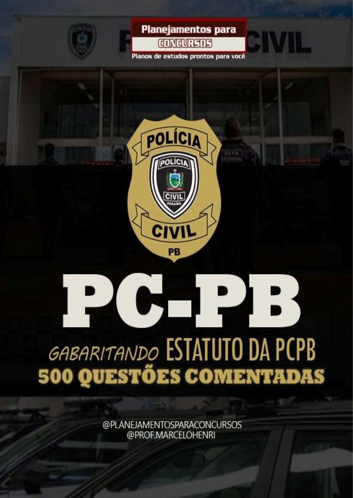 Copyright – Todos os direitos reservados – 2017 – 2021 IG@planejamentosparaconcursos - IG@prof.marcelohenri Copyright – Todos os direitos reservados – 2017 – 2021 IG@planejamentosparaconcursos - IG@prof.marcelohenri 01 – São princípios básicos do sistema policial de carreira: a) Seleção de valores profissionais, morais, intelectuais e regionais para provimento dos cargos policiais civis; b) Progressão sucessiva, regular e equilibrada dos policiais civis, garantindo- lhes, em igualdade de condições, idênticas oportunidades. c) Categorias funcionais, estruturadas em graus crescentes de atribuições, responsabilidades funcionais e capacidades técnicas; d) Responsabilidade e respeito à atividade profissional; e) Dever de legalidade, impessoalidade, moralidade, publicidade e eficiência; Gabarito: LETRA B – Art. 1º,III. No item A) não existe regionais; C) São níveis e não graus; D e E não estão dispostas na lei. 02 – As categorias funcionais de nível médio, integrantes do GRUPO Polícia Civil e Justiça que estarão sujeitas ao Regime estabelecido no estatuto da PCPB, são: a) Perito Criminal b) Perito de Trânsito c) Auxiliar de Perito d) Perito Odonto-Legal e) Delegado de Polícia Gabarito: LETRA C “ Nível Médio – Agente de Investigação, Papiloscopista Policial, Escrivão de Polícia e Auxiliar de Perito.” 03 – A nomeação far-se-á exclusivamente de qual forma: a) Efetivo, apenas. b) Efetivo para os cargos “ad nutum de livre nomeação e livre exoneração”. c) Comissão, apenas. d) Efetivo quando se tratar de cargo integrante de classe inicial de categoria funcional; e) Em comissão, quando se tratar de cargo não isolado ou em virtude da Lei, assim deva ser provido. Gabarito: LETRA D – Art. 5º, I. Não será apenas efetivo, podendo ser, também, em comissão. Os cargos Efetivos não são ad nutum. Os cargos em comissão são isolados, conforme inciso II, art. 5º. 04 – A posse ficará condicionada para quem satisfizer algumas exigências, quais não fazem parte dos requisitos necessários? Copyright – Todos os direitos reservados – 2017 – 2021 IG@planejamentosparaconcursos - IG@prof.marcelohenri a) Ser Brasileiro b) Estar em gozo com os direitos políticos. c) Ter procedimento irrepreensível. d) Gozar de boa saúde física e psíquica, comprovada por inspeção médica. e) Ter 18 anos de idade incompletos. Gabarito: LETRA E – Art. 7º, II. A idade deve ser 18 anos completos. 05 – Conforme Estatuto da PCPB, é correto afirma que: a) Possuir temperamento adequado para o cargo de provimento efetivo é um requisito para ingresso nos quadros da PCPB. b) Ter sido habilitado em concurso público de provas e aprovado no curso de formação respectiva, realizados ambos pelo conselho superior da PCPB. c) Ser aprovado apenas nas provas objetivas, uma vez que a prova de títulos não é reconhecida pela CF/88. d) Será demitido mediante processo disciplinar regular o funcionário policial, que ao ingressar nos Quadros da Secretaria da Segurança, omitir fato que impossibilitaria a sua matrícula na Academia de Polícia, salvo se a atividade policial exigir. e) Não estar quite com as obrigações eleitorais, é um requisito para tomar posse no cargo público. Gabarito: Letra A – Art. 8º, I. Na letra D não existe condição para omitir fato relevante na atividade policial. Letra B, o correto é Academia de Polícia. 06 – Conforme o Estatuto da PCPB, é correto afirmar que: a) Não haverá posse nos casos de progressão, ascensão funcional, e aumento por mérito. b) Haverá posse nos casos de Progressão, apenas. c) Não haverá posse nos casos de Ascensão funcional, apenas. d) Haverá posse nos casos de progressão, ascensão funcional, e aumento por mérito. e) Não haverá posse nos casos de progressão, ascensão funcional, e aumento por mérito, salvo nos casos em que forem determinados exclusivamente pelo Governador. Gabarito: LETRA A – Literalidade do Art. 11, parágrafo único. Copyright – Todos os direitos reservados – 2017 – 2021 IG@planejamentosparaconcursos - IG@prof.marcelohenri 07 – Defina o termo Posse para o Estatuto da PCPB: a) É a aprovação na prova objetiva e de títulos. b) É o pleno exercício das atribuições. c) É o ato de ser alocado para atribuições do cargo efetivo, salvo o cargo de comissão. d) É o exercício do cargo em comissão. e) É o ato que completa a investidura em cargo público. Gabarito: LETRA D – Confirme dispõe o caput do Art. 11, a posse é o ato que completa a investidura do cargo público. 08 – São competentes para dar posse aos Secretários: a) Governador do Estado. b) Dirigente do órgão central. c) Chefe da PCPB. d) Chefes de divisões e) Coordenadores de Departamentos. Gabarito: LETRA A – Art. 14 – São competentes para dar posse: I – O Governador do Estado, aos Secretários e estes as demais autoridades que lhe sejam diretamente subordinado. 09 – Conforme o Estatuto da PCPB, sobre a posse, é correto afirmar que: a) Pode ser realizada por procuração em casos especiais. b) Não poderá ocorrer através de procuração, salvo nos casos autorizados pelo Governador do Estado. c) Poderá ocorrer apenas em caso de urgência e grave calamidade pública, onde seja necessário o aumento dos quadros de policiais. d) Poderá ocorrer, apenas nos casos em que estiver presente no país. e) Não poderá ocorrer em nenhuma hipótese. Gabarito: LETRA A - Art. 15 – Poderá haver posse por procuração, quando se tratar de funcionário ausente do País, em missão do Governo, ou ainda, em casos especiais, a juízo de autoridade competente. 10 – A posse dar-se-á em quanto tempo: Copyright – Todos os direitos reservados – 2017 – 2021 IG@planejamentosparaconcursos - IG@prof.marcelohenri a) 60 dias. b) 30 dias. c) 15 dias. d) 90 dias. e) 120 dias. Gabarito: LETRA B - Art. 17 – A posse dar-se-á no prazo de trinta (30) dias, contados da publicação 