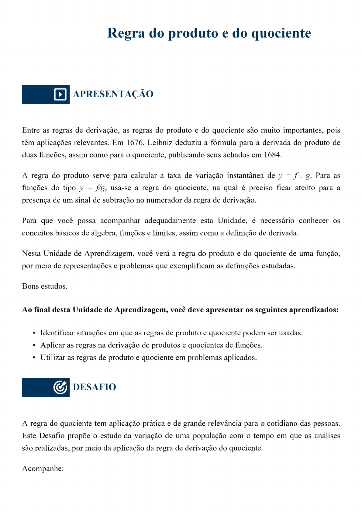 Com as informações que você recebeu do biólogo, busque respostas para as seguintes questões: a) A que taxa a população está variando no momento em que a toxina é introduzida? b) Em que instante a população começa a diminuir? INFOGRÁFICO As regras da soma e da multiplicação por uma constante, bem como a regra da potência, são muito utilizadas na resolução de problemas envolvendo derivadas. No entanto, nem todas as funções podem ser descritas apenas por meio de soma e multiplicação por constante. Assim, é importante conhecer as regras do produto e do quociente. Neste Infográfico, você vai ver, em detalhes, essas duas regras básicas de derivação. CONTEÚDO DO LIVRO Alguns pontos são muito importantes no estudo da derivada de um produto ou quociente. Vale destacar, por exemplo, que a derivada de um produto não é igual ao produto das derivadas; o mesmo vale, em geral, para o quociente. Outro aspecto a se destacar nessas regras é que elas se parecem, por exemplo: na regra do quociente, o numerador se parece com a regra do produto, a não ser pelo fato de que tem um sinal negativo, o que torna a ordem dos termos muito importante. No capítulo Regra do produto e do quociente, da obra Cálculo: limites de funções de uma variável e derivadas, base teórica desta Unidade de Aprendizagem, você vai ver demonstrações das regras em detalhes, assim como diversos exemplos resolvidos. Boa leitura. paulo Realce paulo Realce paulo Realce paulo Realce paulo Realce SAIBA MAIS Para ampliar o seu conhecimento a respeito desse assunto, veja abaixo as sugestões do professor: Regras do produto e quociente Neste vídeo, o professor Gustavo Viegas explica as regras de derivação, contextualizando com o momento histórico em que elas foram descobertas. Ainda, trabalha com exemplos detalhados. Veja a seguir. Conteúdo interativo disponível na plataforma de ensino! Regra do produto para derivadas No vídeo a seguir, você vai ver a regra do produto para derivadas a partir de exemplos numéricos e dicas. Confira. Conteúdo interativo disponível na plataforma de ensino! Regra do quociente para derivadas No vídeo a seguir, você vai ver mais sobre a regra do quociente para derivadas a partir de um exemplo detalhado. Conteúdo interativo disponível na plataforma de ensino! Lista de exercícios Para aprender a regra do produto e do quociente, é importante que você treine fazendo diversas atividades. Para tanto, baixe a lista de exercícios a seguir e resolva as questões. Conteúdo interativo disponível na plataforma de ensino!