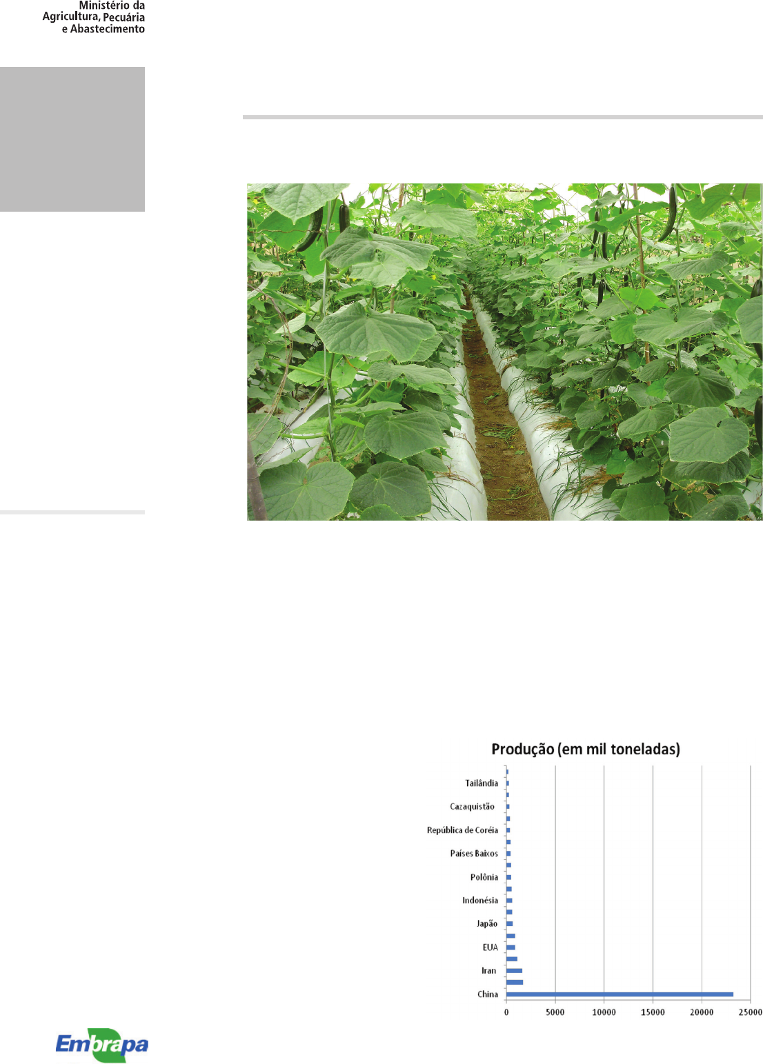 ISSN 1415-3033 A cultura do pepino C irc ul ar T éc ni ca Brasília, DF Março, 2013 Autores 113 Fo to : A gn al do C ar va lh o Importância socioeconômica O pepino (Cucumis sativus) tem grande importância econômica e social dentro do agronegócio de hortaliças no Brasil. É muito apreciado e consumido em todas as regiões brasileiras. O fruto pode ser consumido na forma crua em saladas, sanduíches, sopas ou em conservas. Além disto, pode ser utilizado em cosméticos e medicamentos devido a suas propriedades nutracêuticas. A China é responsável por aproximadamente 60% da produção mundial de pepino, seguida pela Turquia, Irã, Rússia e Estados Unidos (Figura 1). A produção anual brasileira de pepino ultrapassa 200.000 t. (Tabela 1), a seguir. Em relação à produção por região, a região Sudeste é responsável por mais de 50% do total da produção brasileira (EMBRAPA HORTALIÇAS, 2010), Agnaldo Donizete Ferreira de Carvalho Eng. Agr., DSc. Embrapa Hortaliças agnaldo.carvalho@embrapa.br Geovani Bernardo Amaro Eng. Agr., DSc. Embrapa Hortaliças geovani.amaro@embrapa.br José Flávio Lopes Eng. Agr., DSc. Embrapa Hortaliças jose.lopes@embrapa.br Nirlene Junqueira Vilela Econ., MSc. Embrapa Hortaliças nirlene.vilela@embrapa.br Miguel Michereff Filho Eng. Agr., DSc. Embrapa Hortaliças miguel.michereff@embrapa.br Romério Andrade Eng. Agr. Emater-DF romerioandrade@ig.com.br Figura 1. Produção mundial de pepinos (Fonte: FAO, 2010). A cultura do pepino2 sendo que o estado de São Paulo é o principal produtor desta hortaliça (IEA, 2009). Além da importância econômica e alimentar, o cultivo de pepino, têm grande importância social, gerando muitos empregos diretos e indiretos, desde o cultivo até a sua comercialização. Tabela 1. Participação regional na produção de pepino brasileira, em 2006. Fonte: Embrapa Hortaliças (2010). No mercado brasileiro, existe predominância das cultivares híbridas de pepino em relação às cultivares de polinização aberta. A comercialização de sementes no Brasil gera aproximadamente sete milhões de reais ao ano. Composição Aproximadamente 95% do pepino é composto por água, sendo relativamente rico em fibras, daí a sua importância para o sistema digestivo. Possui baixo teor de calorias e contém pequenas quantidades de vitamina C, folato, potássio e vitamina A, que está contida na casca e que geralmente não é aproveitada. Na Tabela 2 estão apresentados os valores nutricionais de cada 100 gramas de pepino (Cucumis sativus) com casca. Cultivares Existem no mercado brasileiro quatro tipos de pepino: “caipira”, “conserva”, “aodai ou comum” e “japonês ou aonaga”. O pepino tipo caipira se caracteriza por frutos verde-claros com listras longitudinais e uma mancha denominada de “barriga branca”, comumente encontrada em frutos provenientes de cultivos sem tutoramento. Os frutos são colhidos com aproximadamente 15 cm de comprimento e 5 a 6 cm de diâmetro, dependendo das exigências de cada mercado. O fruto pode ser triloculado ou pentaloculado (Figura 2) e possui sabor agradável, livre de amargor. Cultivares com acúleos brancos são os preferidos, pois apresentam maior conservação pós-colheita. Região Produção Participação (mil t) (%) Sudeste 113,64 52,83 Sul 46,55 21,64 Nordeste 27,47 12,77 Centro-Oeste 19,72 9,17 Norte 7,73 3,59 Produção brasileira 215,12 – Tabela 2. Valores nutricionais para cada 100 g de pepino com casca Componente Quantidade Componente Quantidade (mg) Água (%) 96,00 Fósforo 17,86 Calorias 17,86 Ferro 0,36 Proteína QNS* Potássio 150 Gordura QNS Sódio 3,57 Ácido Graxo Saturado QNS Cálcio 14,29 Ácido Graxo Monoinsaturado QNS Colesterol 0,00 Ácido Graxo Poliinsaturado QNS Tiamina 0,04 Vitamina A (Retinol Equivalente) 3,57 Riboflavina 0,04 Carboidrato (g) 3,57 Niacina 0,36 Vitamina A (UI) 35,71 Ácido Ascórbico 3,58 Fonte: (EMEDIX, 2011) * QNS= Quantidade não significativa Figura 2. Pepino Caipira. Fo to : G eo va ni A m ar o A cultura do pepino 3 O pepino do tipo aodai é caracterizado por frutos de coloração verde-escura e formato cilíndrico (Figura 3). Seus frutos possuem sabor agradável e muito apreciado em regiões metropolitanas como a capital paulista. Considerando seu volume de vendas, consiste no principal grupo do ponto de vista de volume de comercialização. Suas lavouras são predominantemente cultivadas em sistema tutorado. Figura 3. Pepino aodai ou comum. O pepino tipo japonês se caracteriza por frutos triloculados, de coloração verde-escura, alongados, com a presença de espinhos brancos, sendo colhidos quando os mesmos atingem entre 20 e 30 cm de comprimento (Figura 4). Possui sabor agradável, sendo bem aceito por mercados exigentes. Os frutos se desenvolvem sem a formação de sementes na maioria das cultivares (partenocarpia). Esse pepino é predominantemente cultivado dentro de casas de vegetação, pois a polinização é indesejável já que altera o formato dos frutos. Figura 4. Pepino japonês ou aonaga O pepino indústria ou conserva se caracteriza por frutos colhidos precocemente quando possuem entre 5 a 7 cm de comprimento. Os frutos possuem coloração verde escura e são triloculados (Figura 5). Os estados do Sul do Brasil, principalmente Santa Catarina, são os maiores produtores de pepinos para indústria. Figura 5. Pepino indústria ou conserva ” Na Tabela 3, a seguir, estão apresentadas as principais cultivares das empresas de sementes de hortaliças do Brasil. Clima O pepino se adapta a regiões com clima variando de ameno a quente, ou seja, temperaturas entre 20 e 30oC. Baixas temperaturas prejudicam o desenvolvimento, principalmente em plantas jovens (menos de 35 dias após a germinação), e diminuem a produtividade. A cultura do pepino não tolera geadas devido a limitação climática, os plantios de pepino se concentram no período de primavera-verão, contudo, o plantio pode ser realizado no período do i